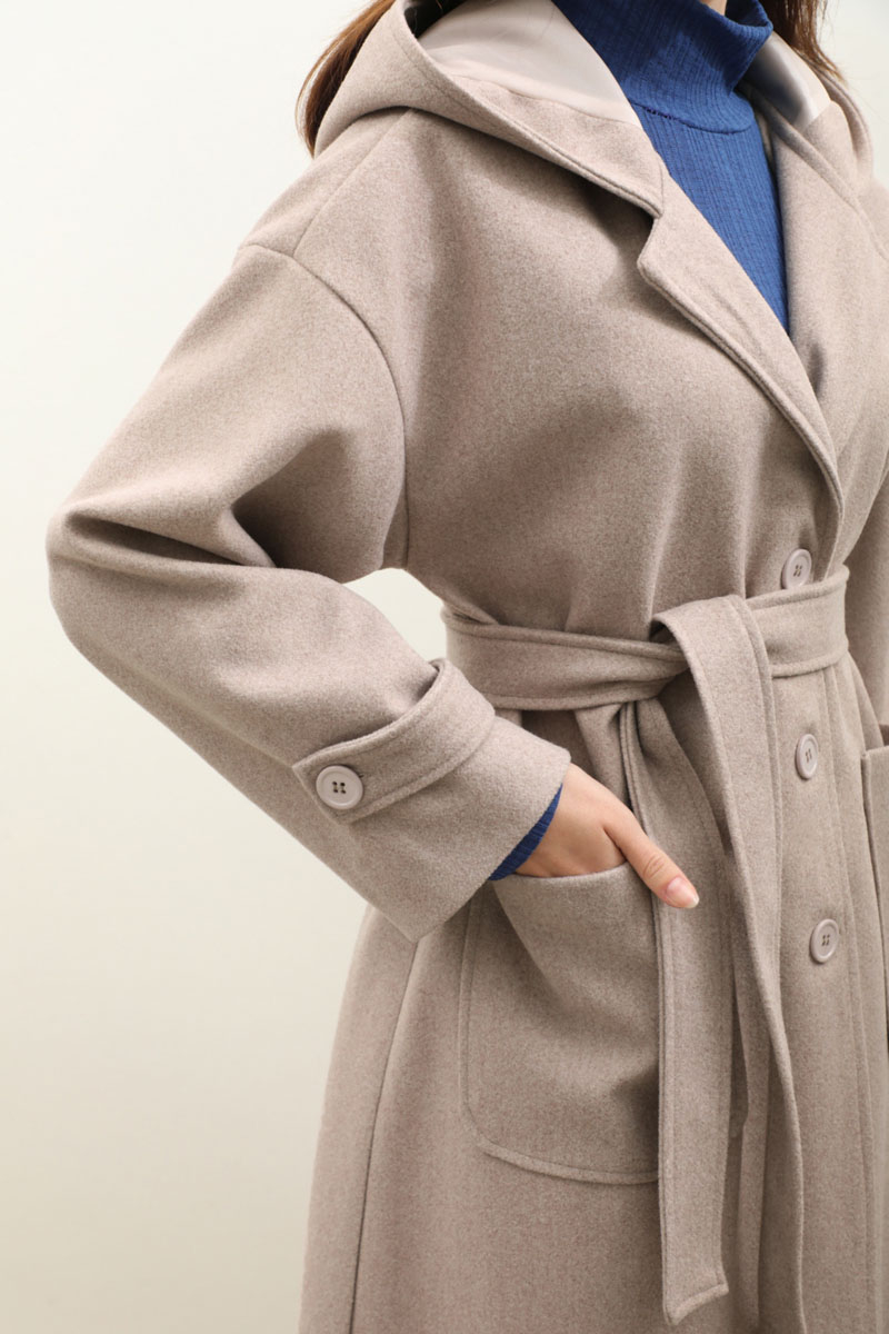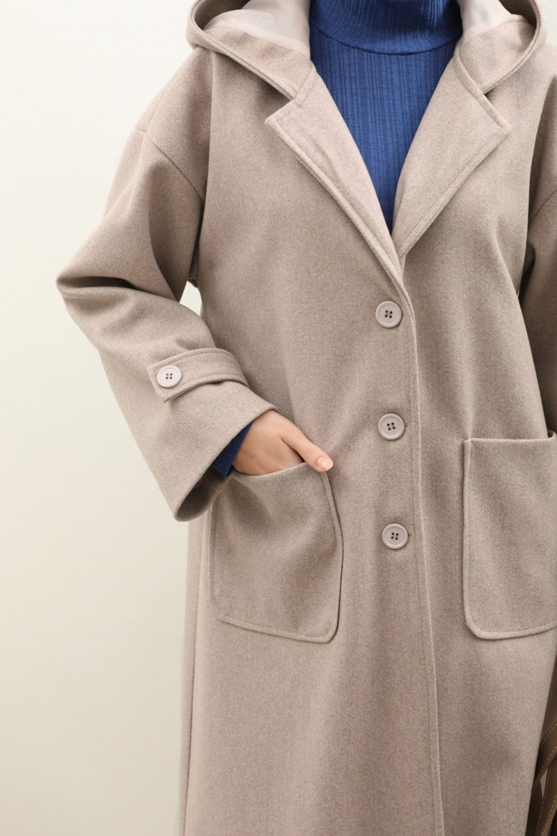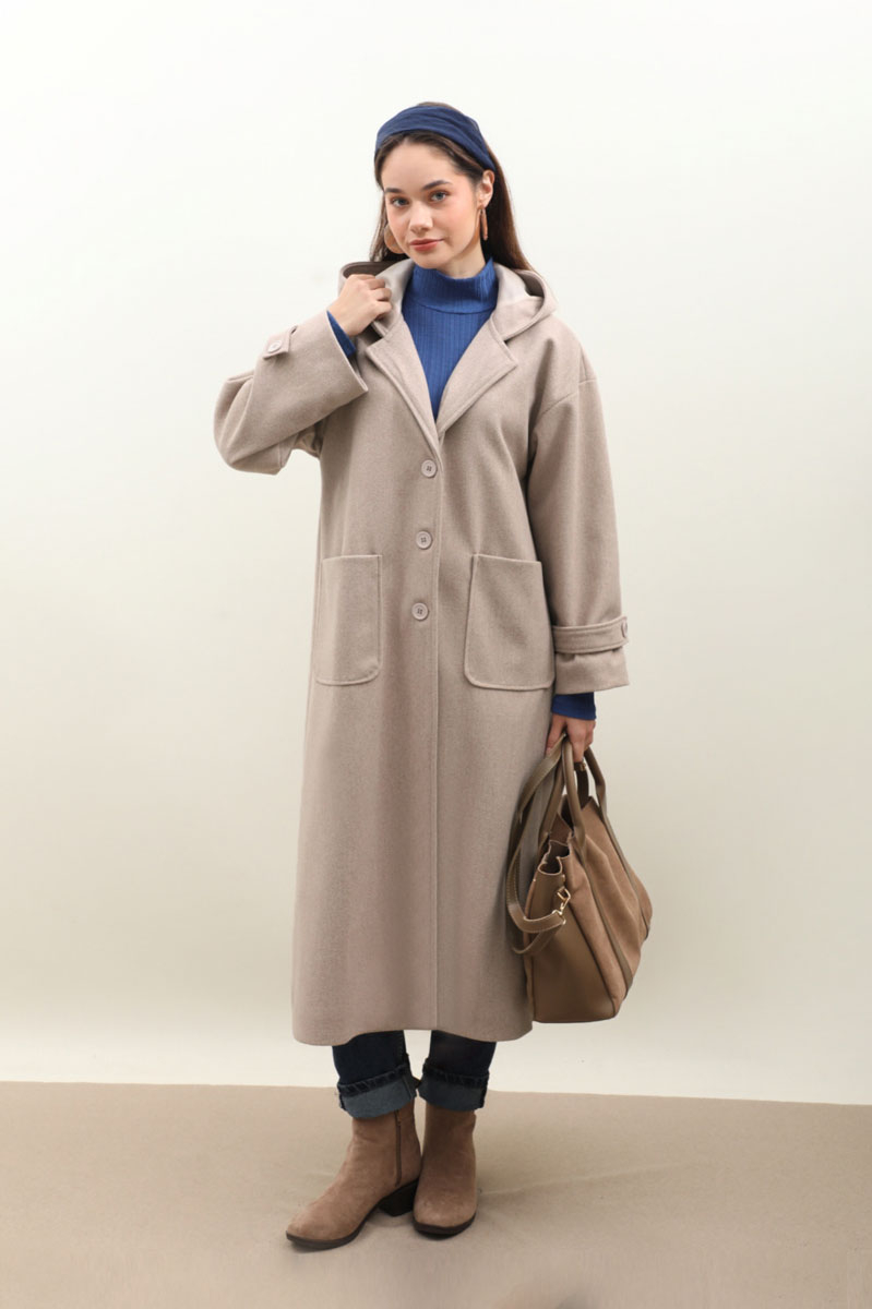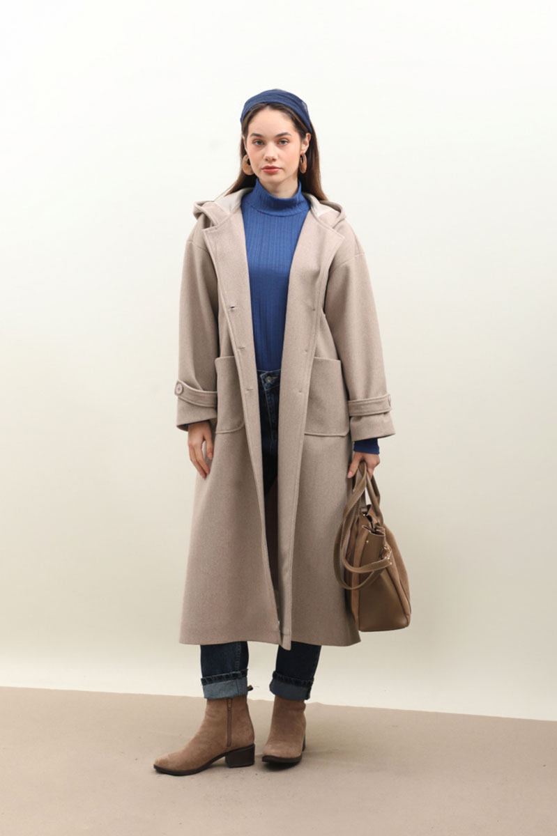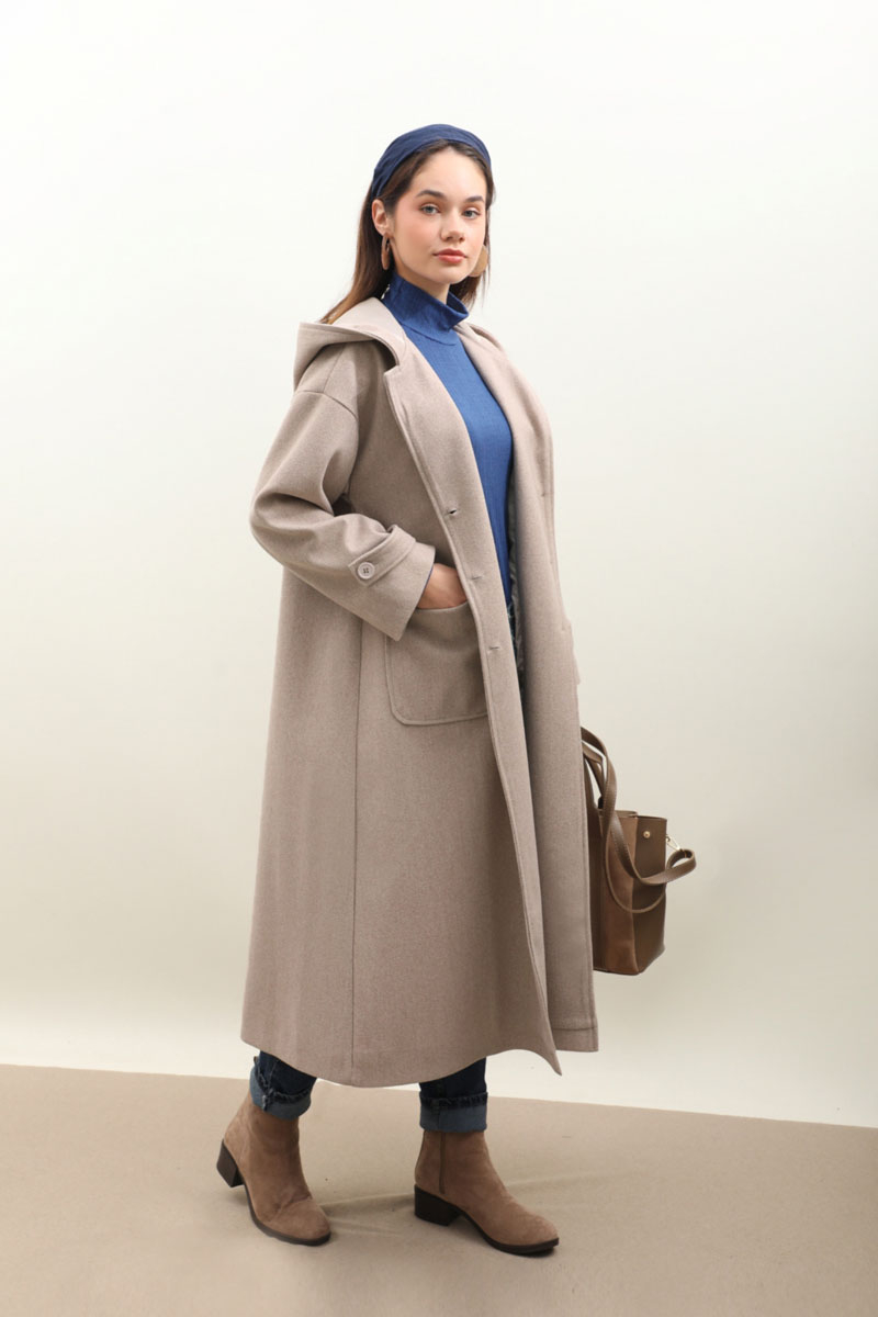 Kapüşonlu Ara Boy Kaban Açık Vizon