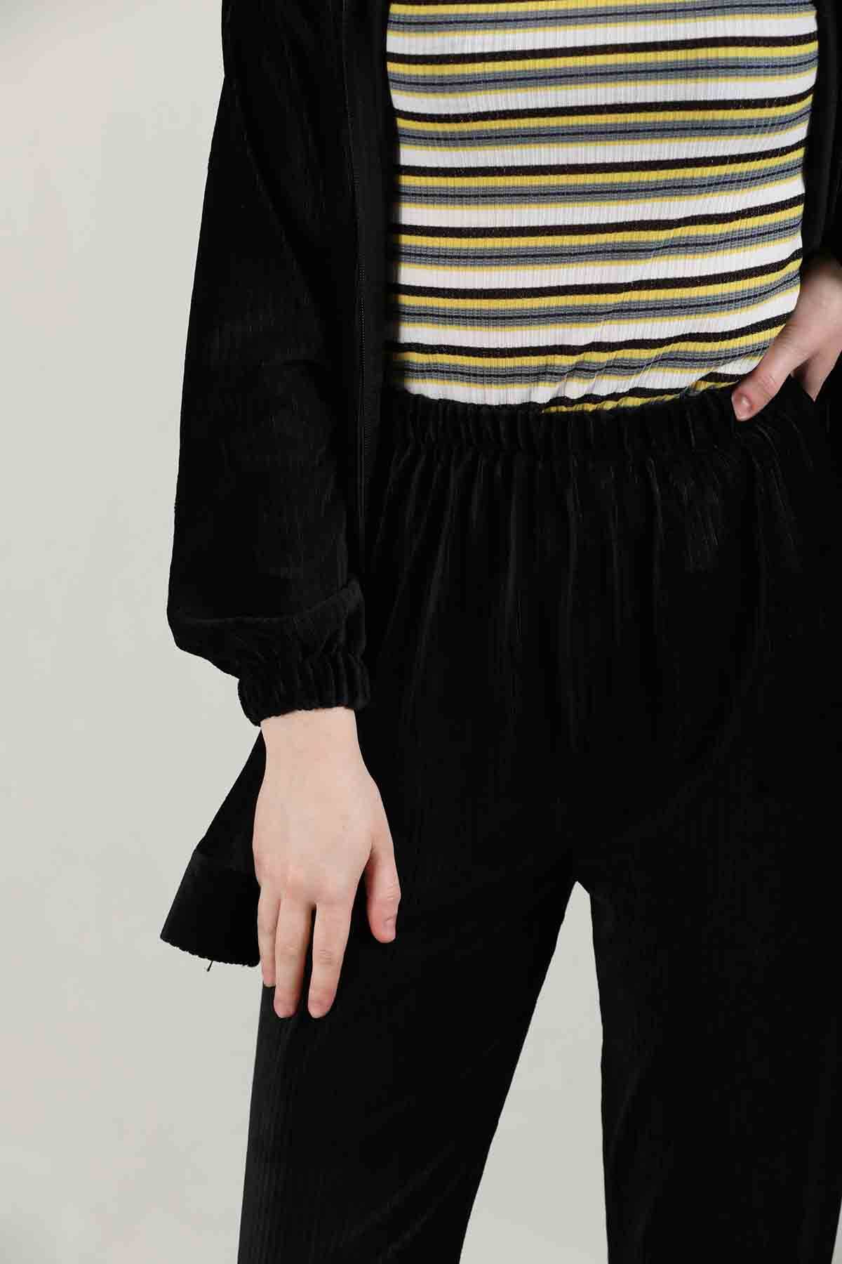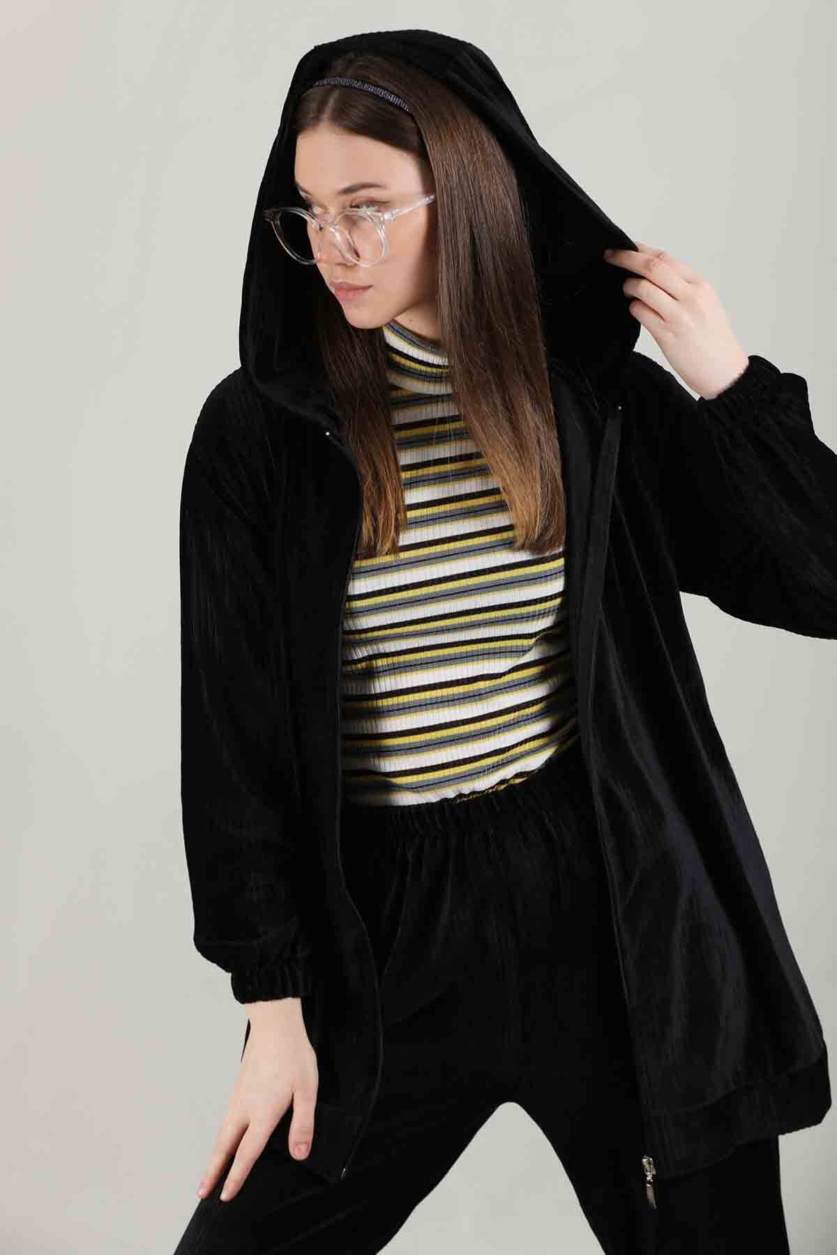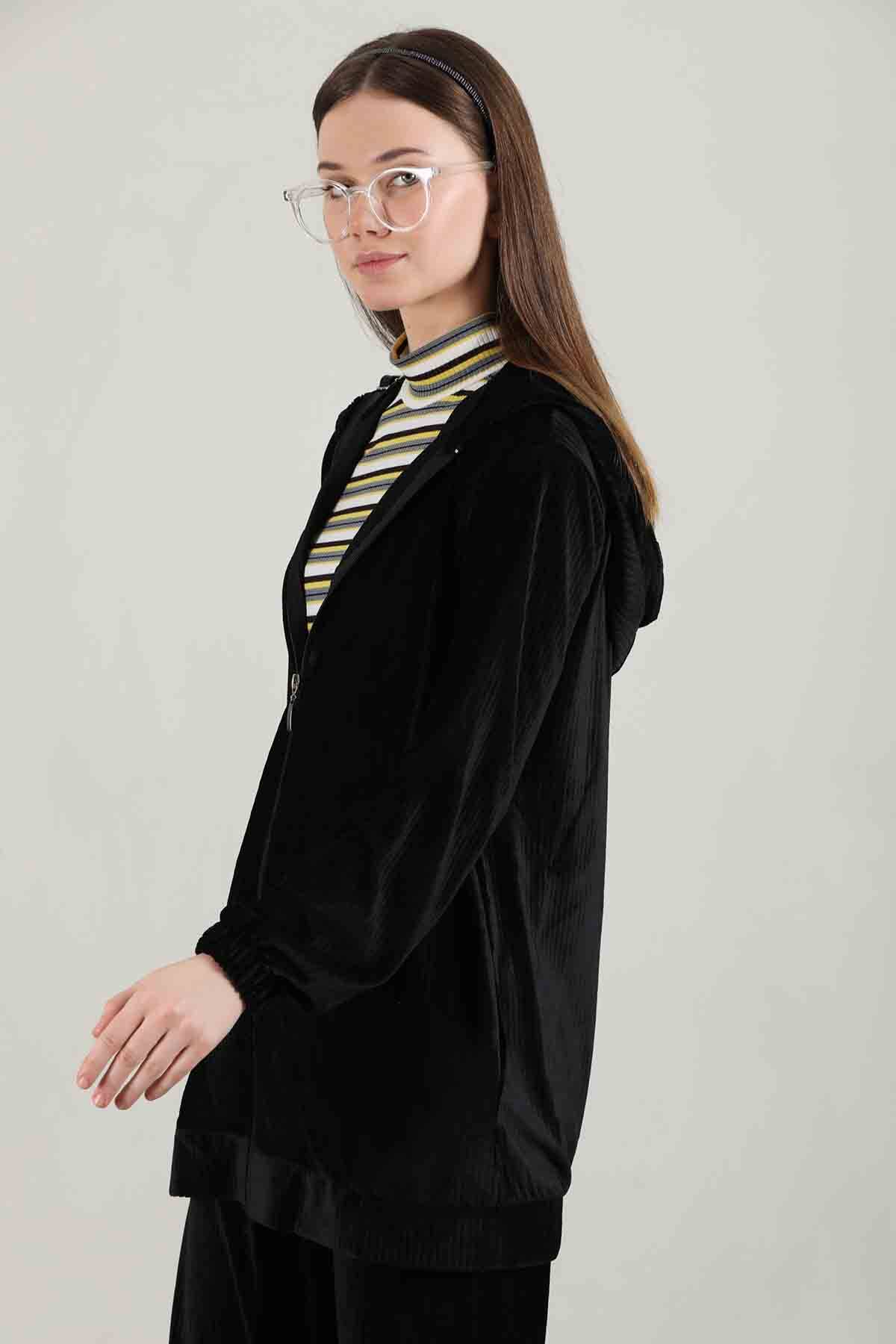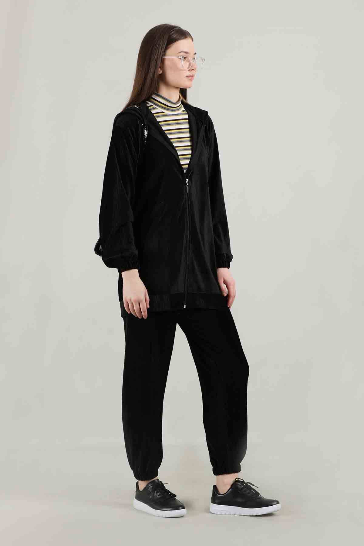 Kapüşonludur ve fermuarlıdır. Torba cepleri mevcuttur. Pantolon paçası lastiklidir. Düşük omuzludur.