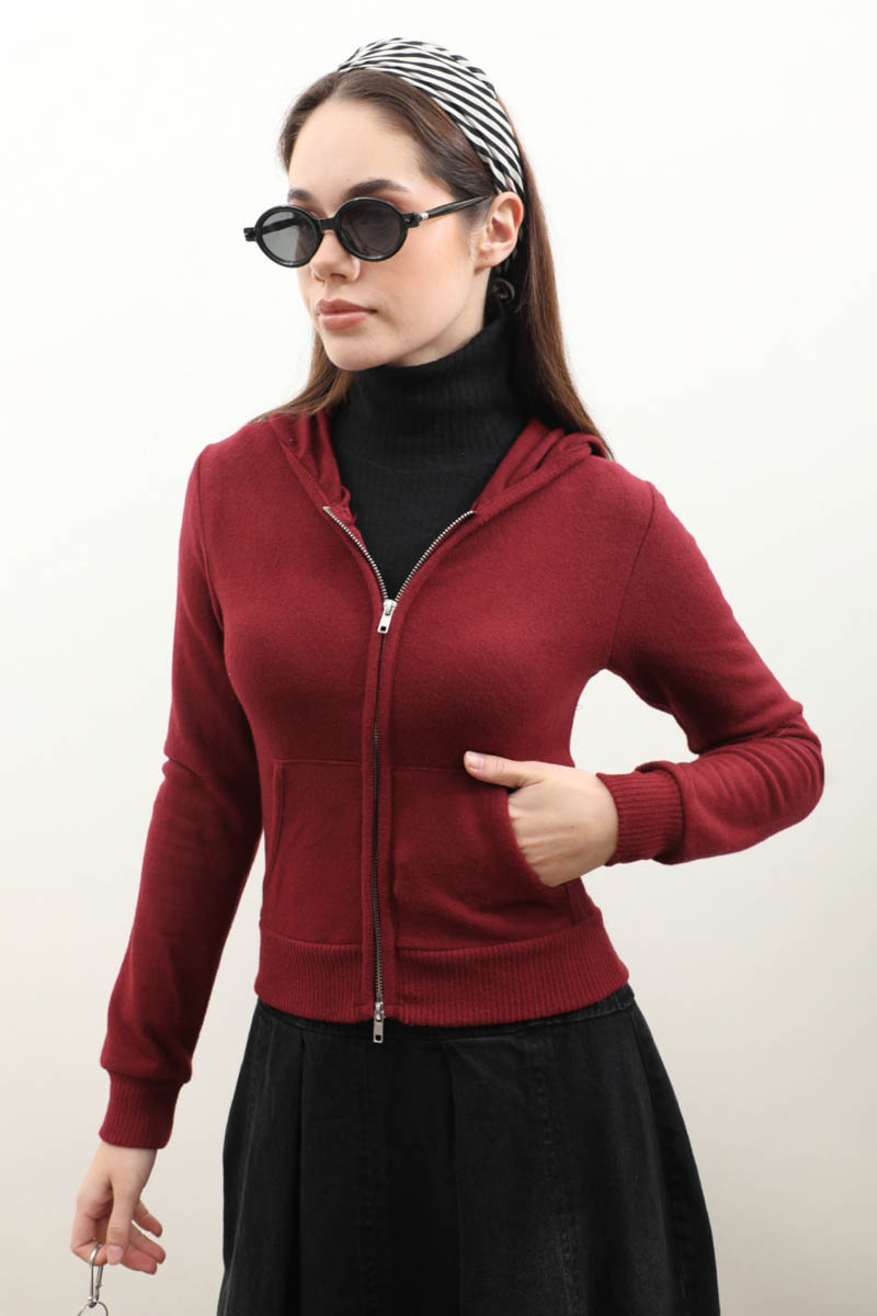Kapüşonlu Kısa Hırka Bordo. Kapüşonludur, önden cepli ve fermuarlıdır, manşeti ve etek ucu ribanalıdır, dar kalıptır. Günlük kullanım ve özel günlerinizde tercih edebilirsiniz.
