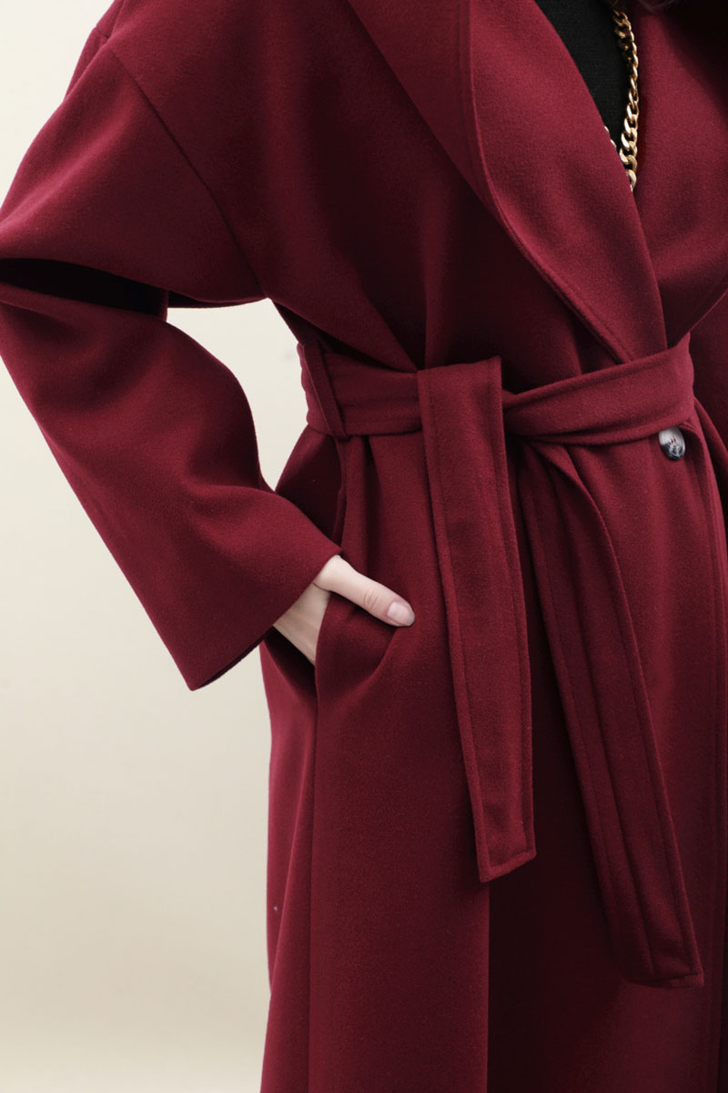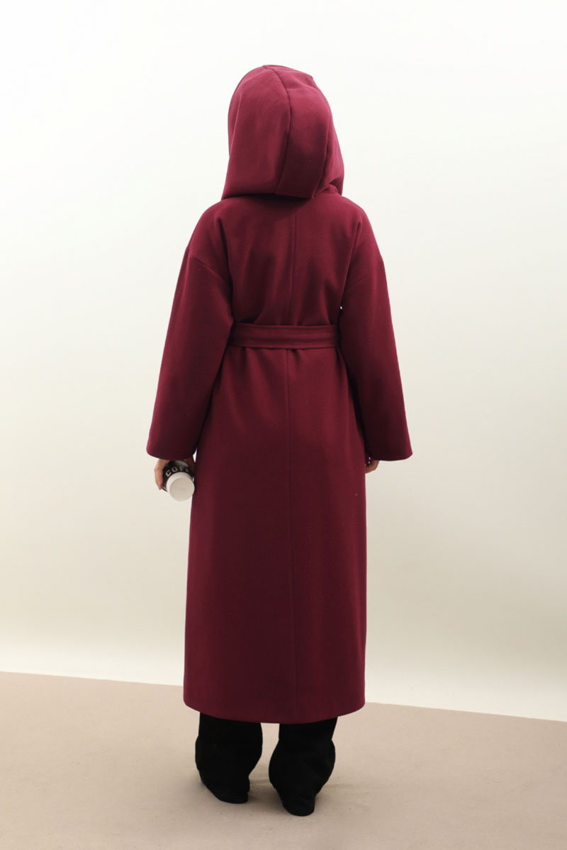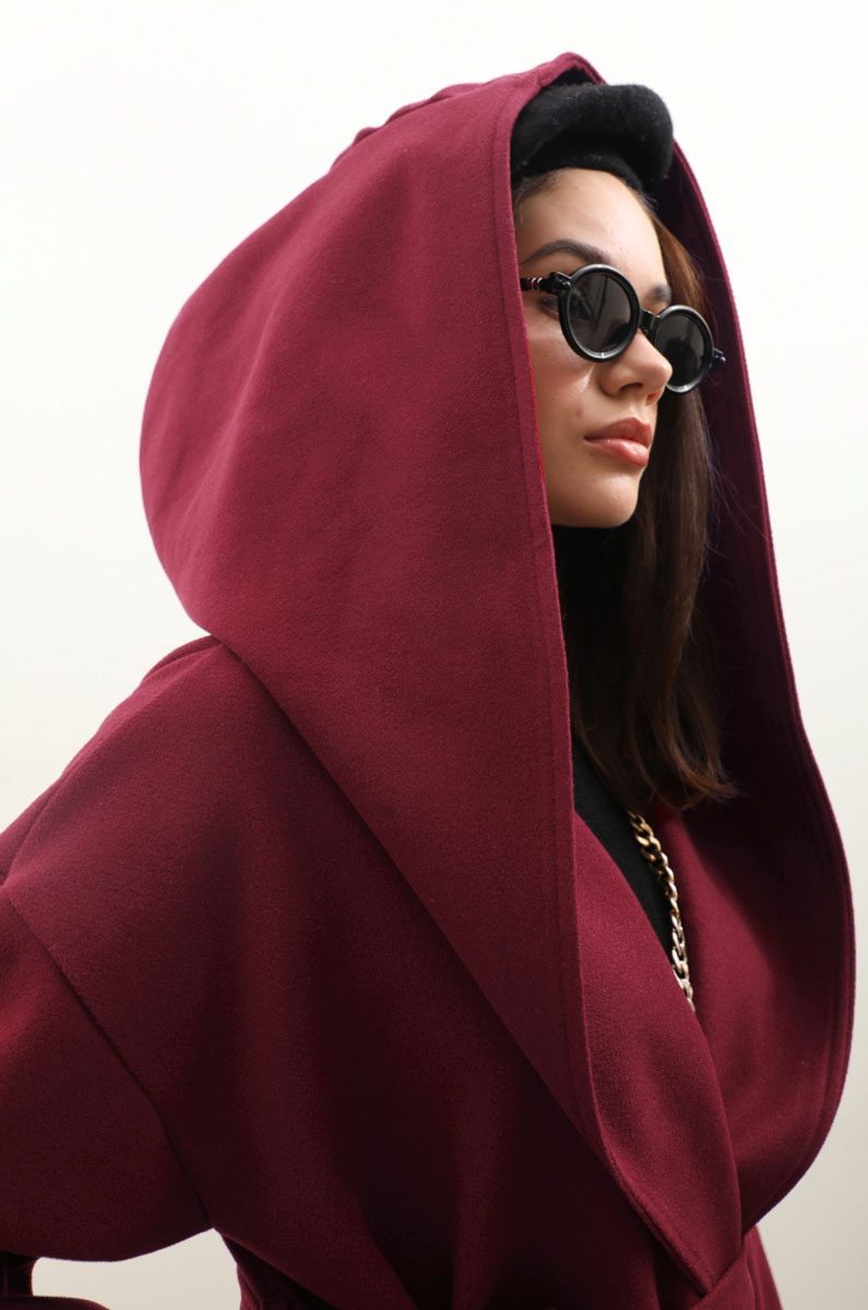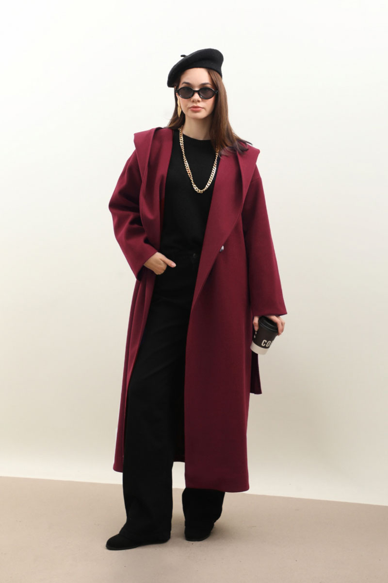 Kapüşonlu Şal Yaka Kaban Bordo. Kruvaze şal yakadır, düşük omuzludur, önden düğmelidir yandan ceplidir, büyük ve dökümlü kapüşonludur, kuşaklıdır, astarlıdır, Günlük kullanım ve özel günlerinizde tercih edebilirsiniz.