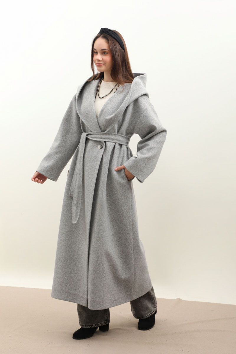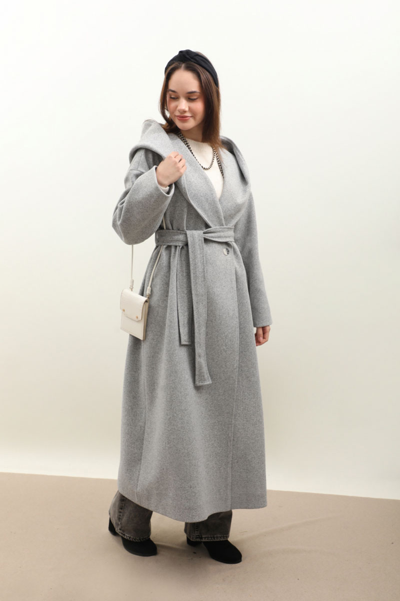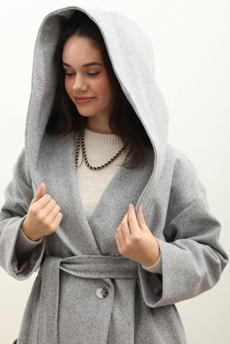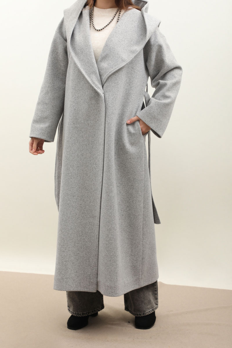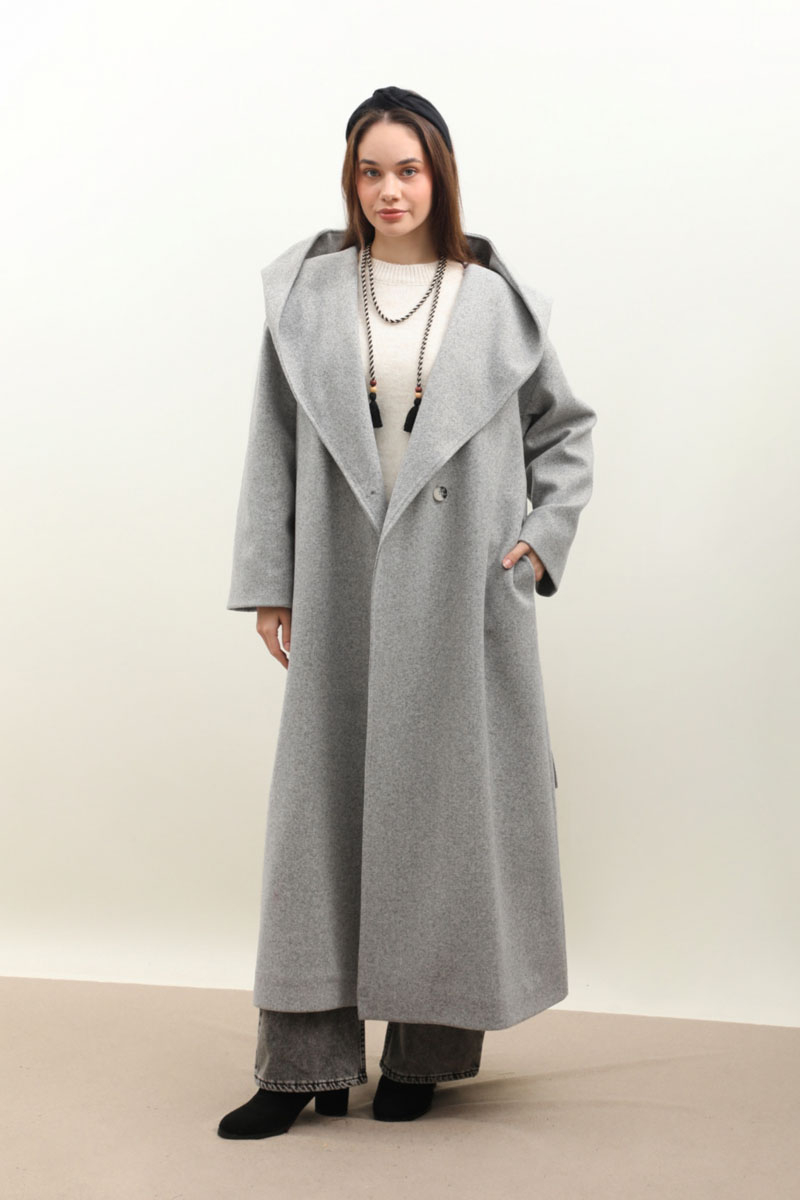 Kapüşonlu Şal Yaka Kaban Gri. Kruvaze şal yakadır, düşük omuzludur, önden düğmelidir yandan ceplidir, büyük ve dökümlü kapüşonludur, kuşaklıdır, astarlıdır, Günlük kullanım ve özel günlerinizde tercih edebilirsiniz.