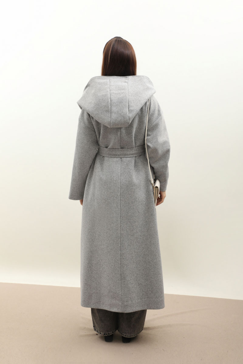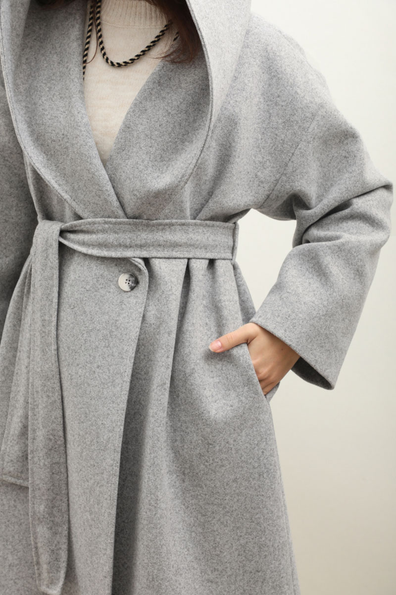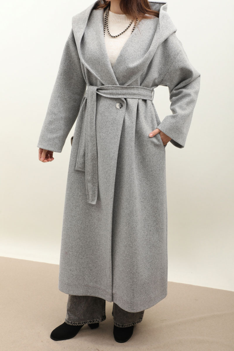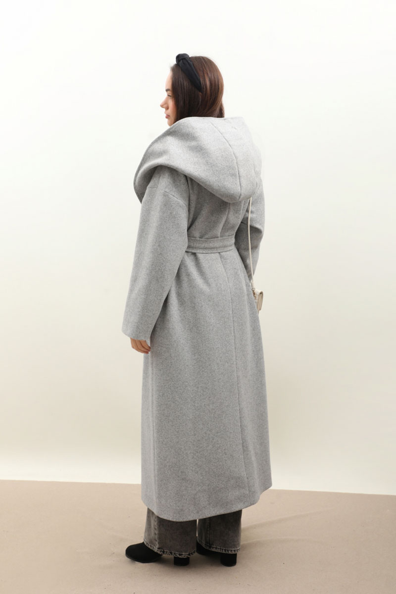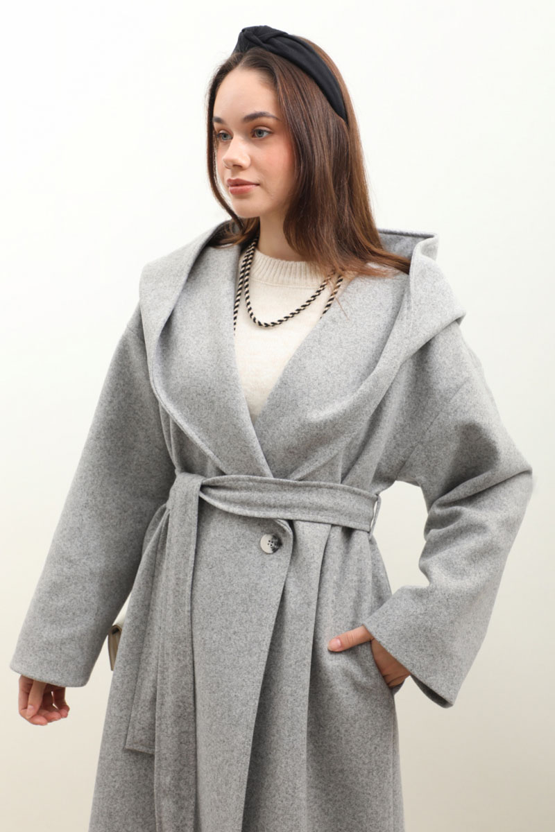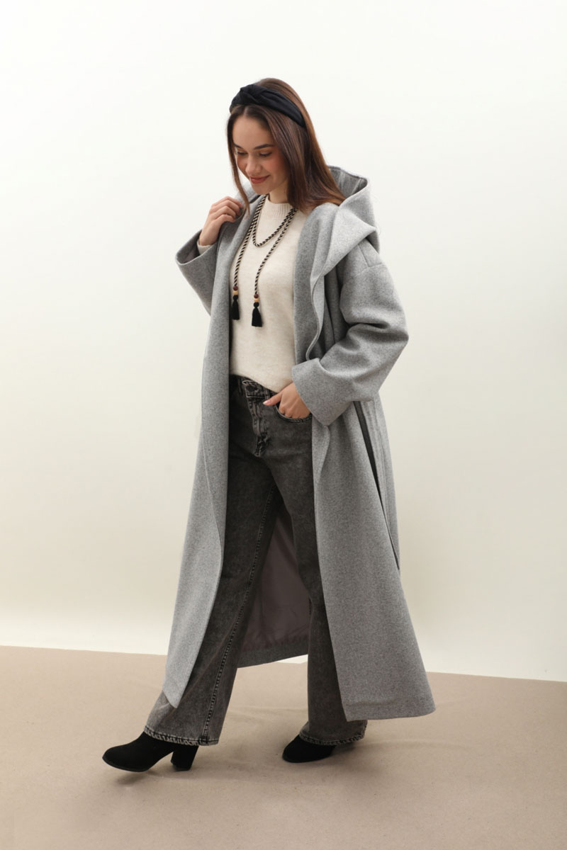 Kapüşonlu Şal Yaka Kaban Gri. Kruvaze şal yakadır, düşük omuzludur, önden düğmelidir yandan ceplidir, büyük ve dökümlü kapüşonludur, kuşaklıdır, astarlıdır, Günlük kullanım ve özel günlerinizde tercih edebilirsiniz.