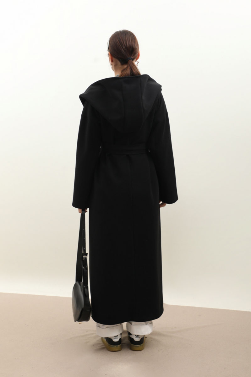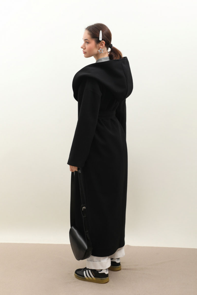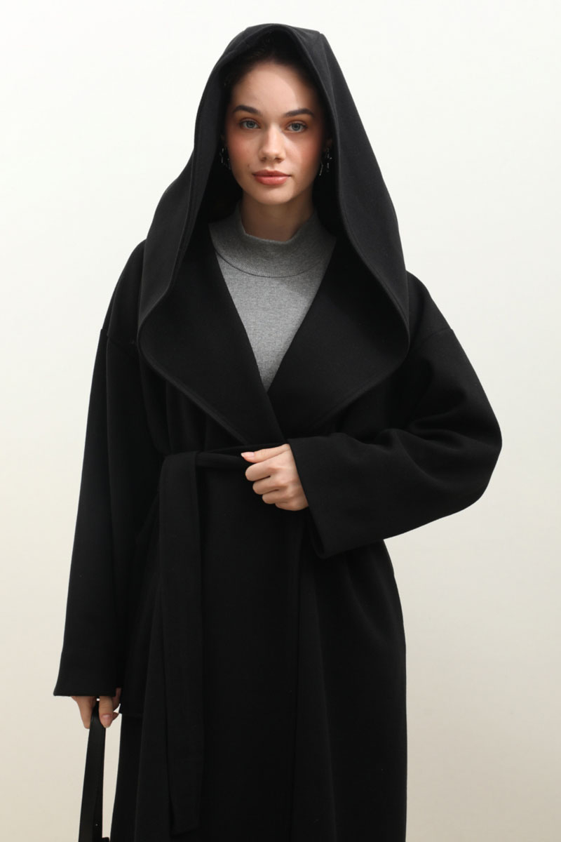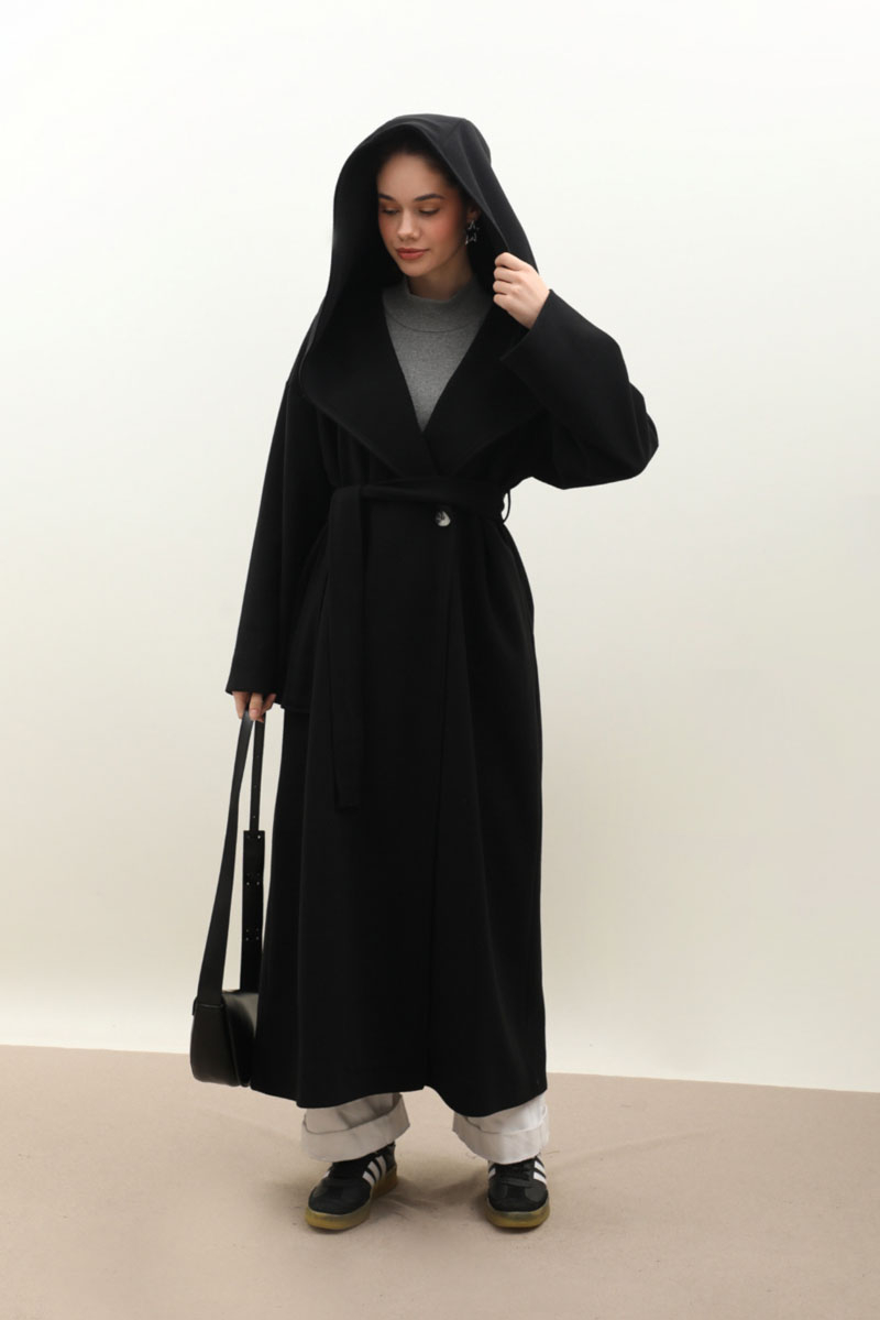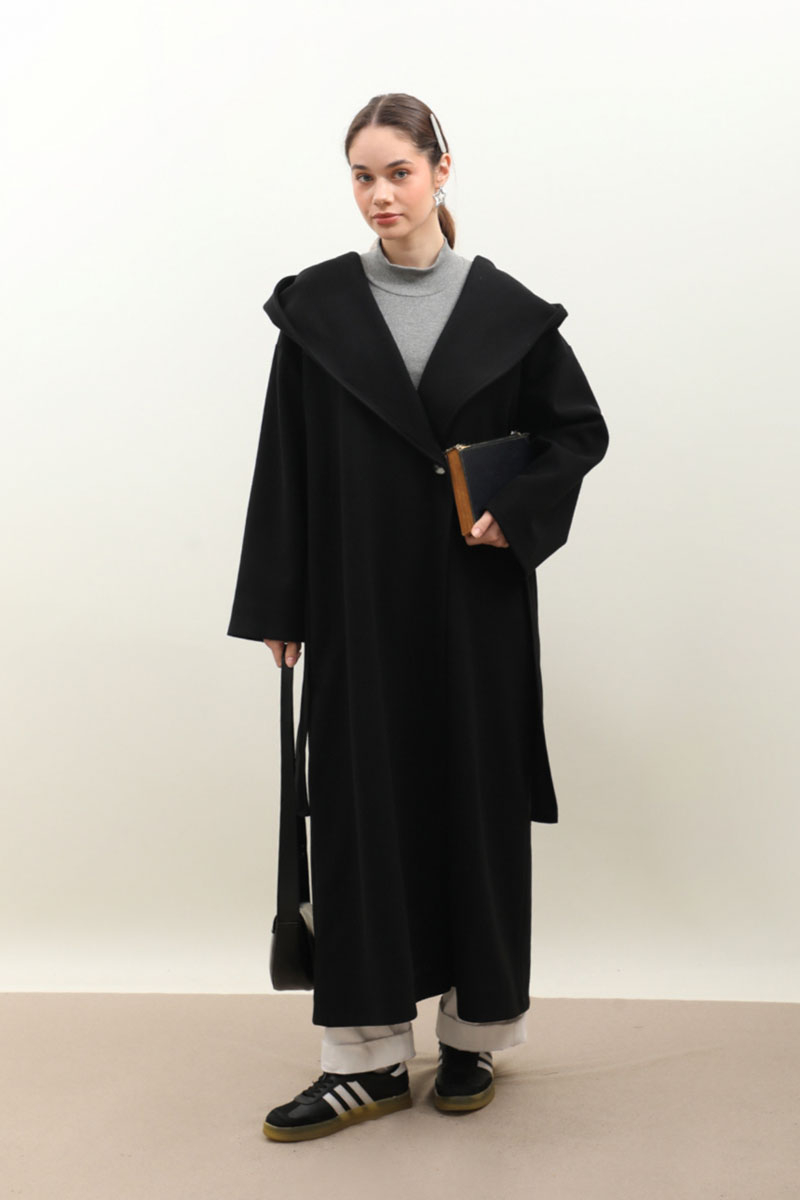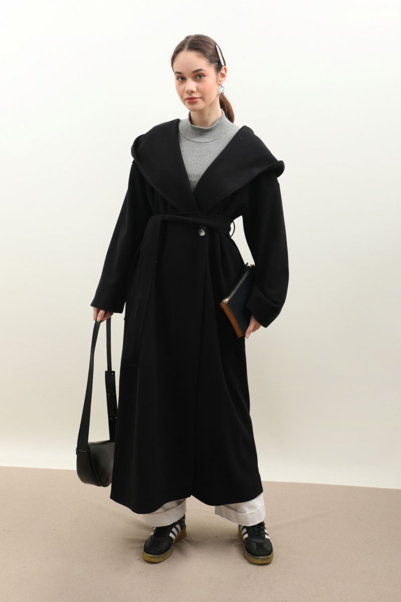 Kapüşonlu Şal Yaka Kaban Siyah. Kruvaze şal yakadır, düşük omuzludur, önden düğmelidir yandan ceplidir, büyük ve dökümlü kapüşonludur, kuşaklıdır, astarlıdır, Günlük kullanım ve özel günlerinizde tercih edebilirsiniz.