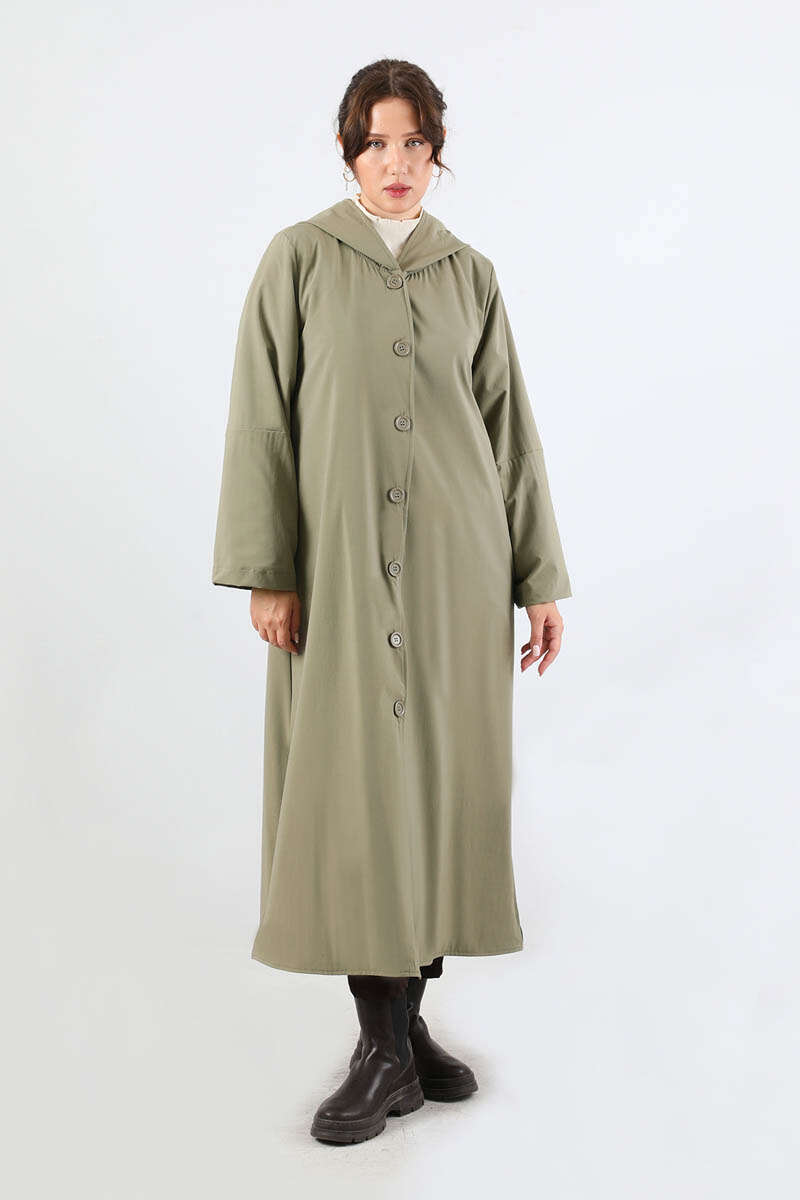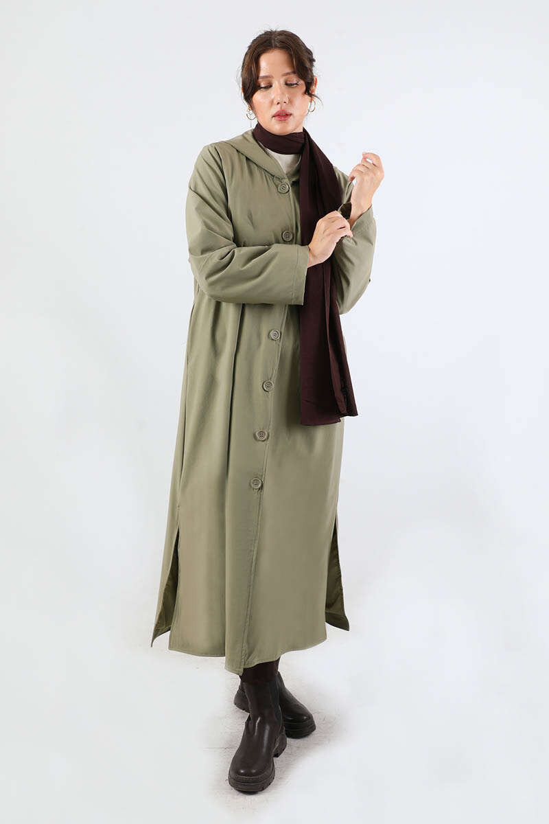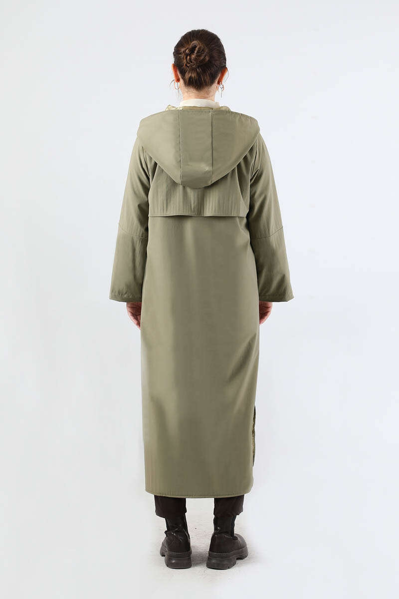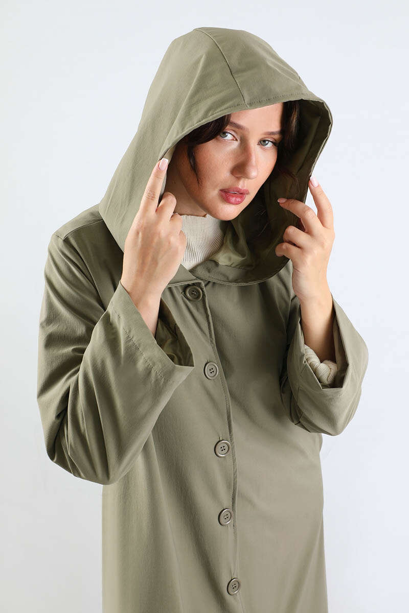 Kapüşonlu Uzun Trençkot Haki. Yandan ceplidir. Kapüşonludur. Yandan yırtmaçlıdır. Önden düğmelidir. Arkadan rüzgarlık detaylıdır. Astarlıdır. Günlük kullanım ve özel günlerinizde tercih edebilirsiniz.