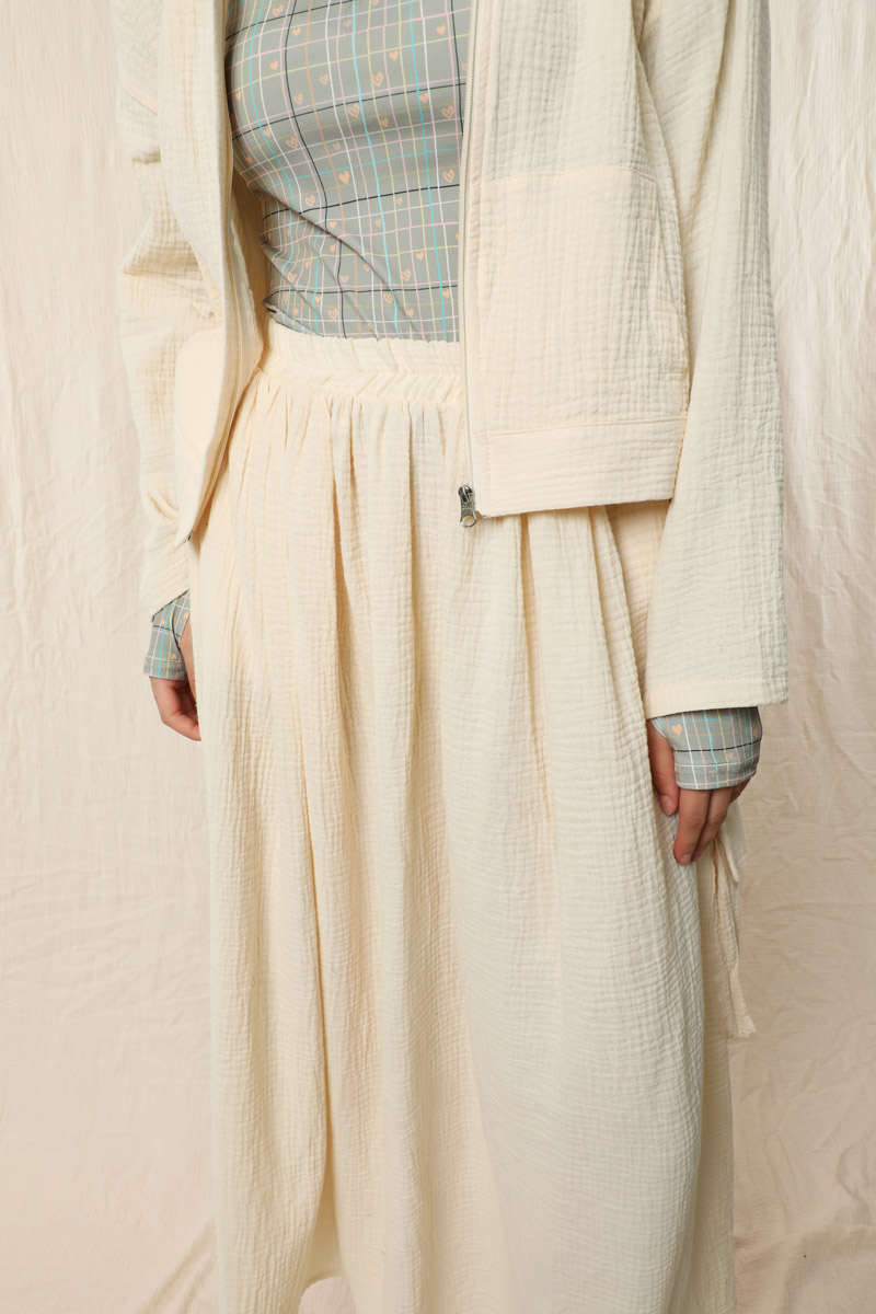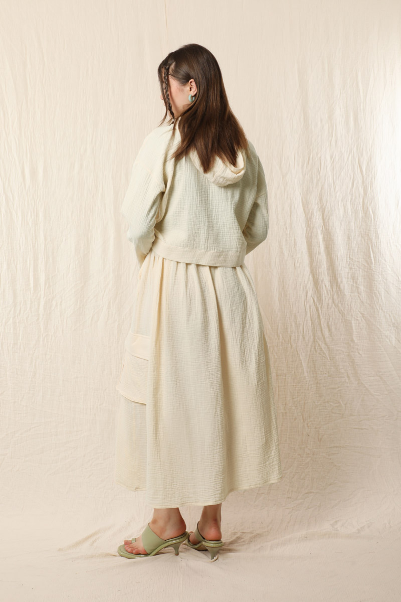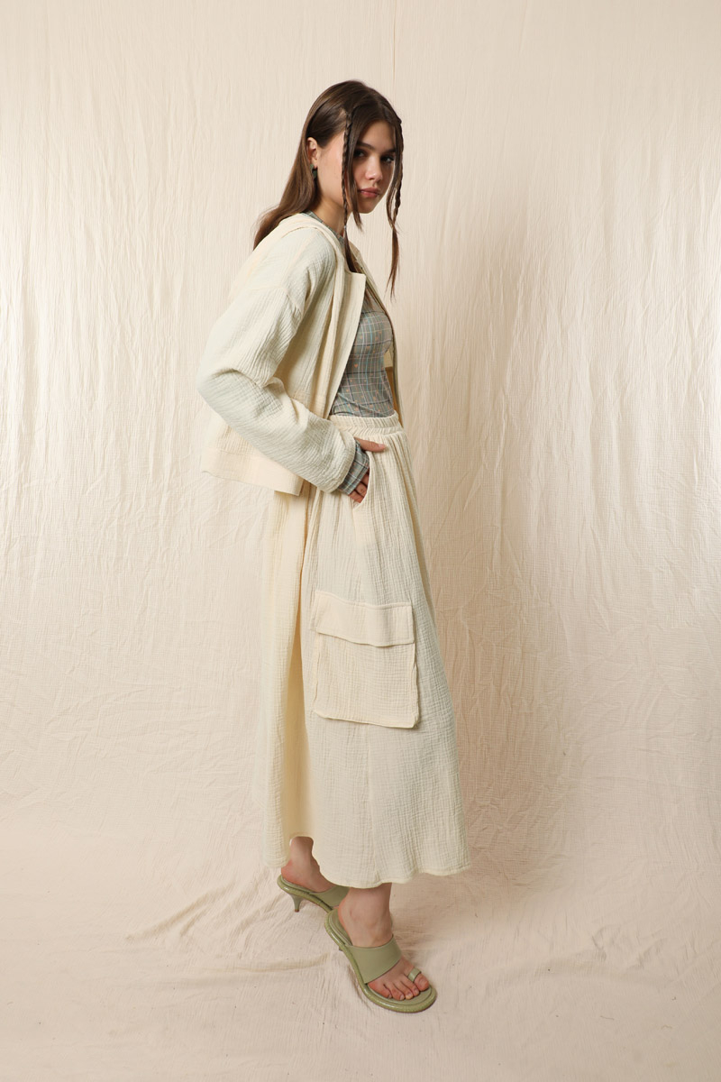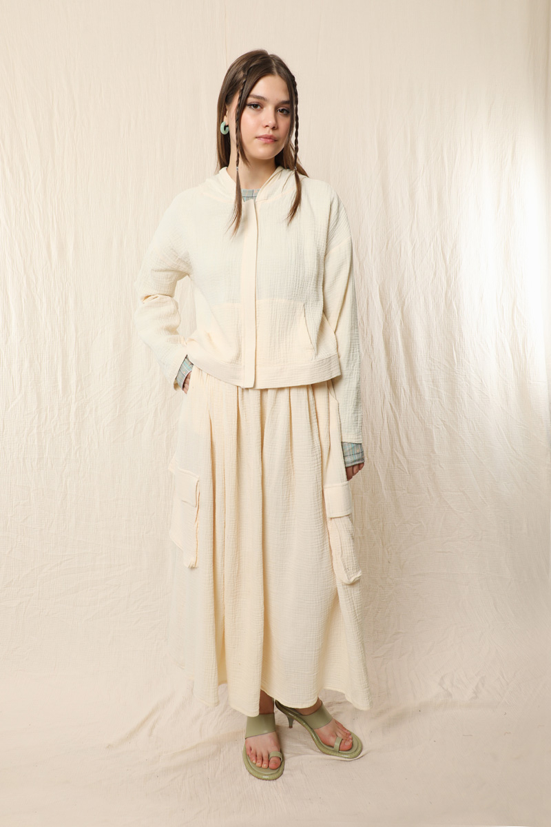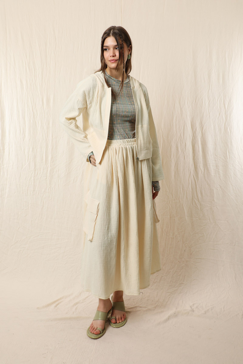 Kargo Cep Müslin Etek Takım Taş. Üst kapüşonlu, yandan cepli, önden fermuarl, düşük omuzludur. Etek beli lastikli yandan kargo ceplidir. Astarsızdır müslin kumaş olduğu için iç gösterebilir ürün içine içlik ürünlerimizden tercih edebilirsiniz. Yazlık ve günlük kullanım için uygundur.