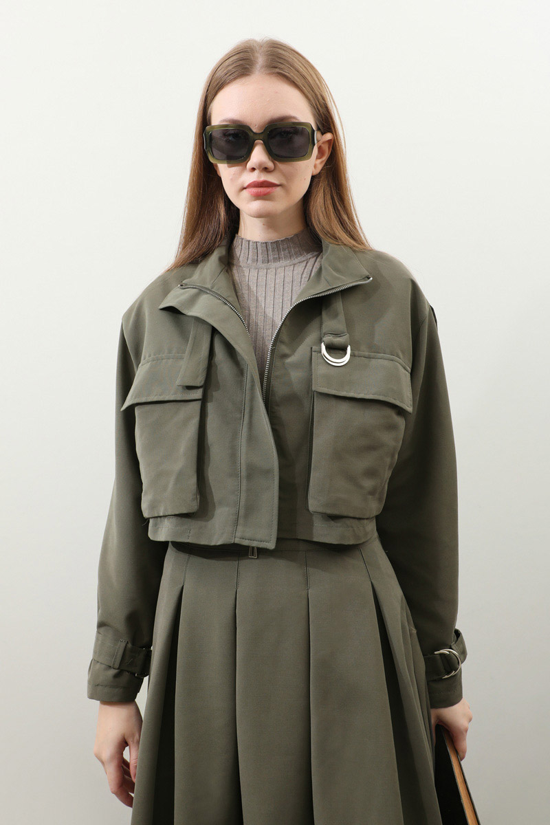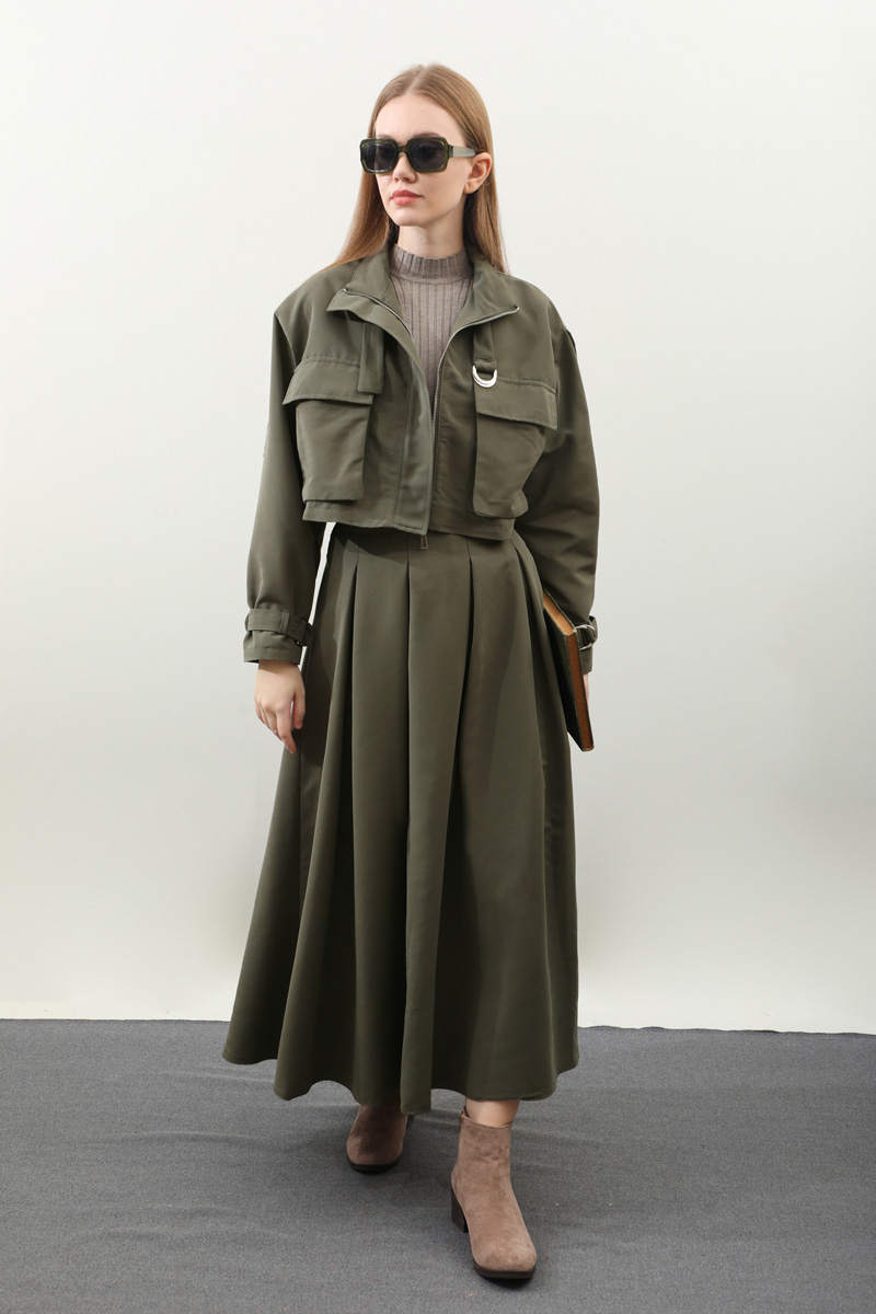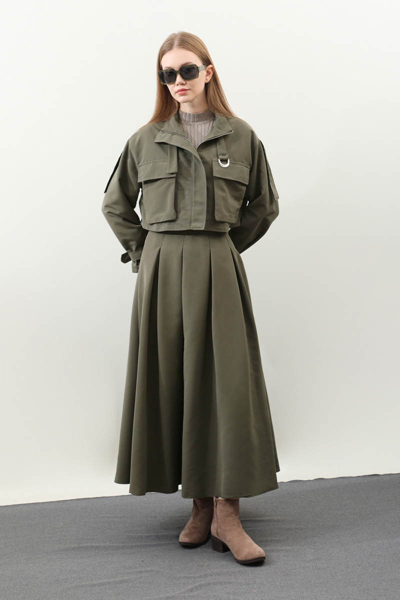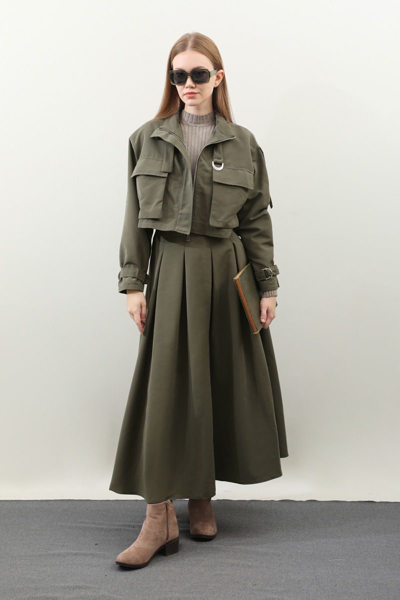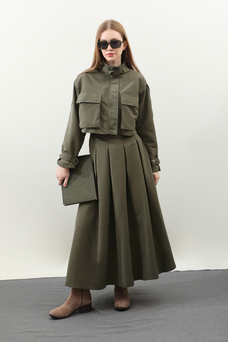 Kargo Cepli Etek Takım Haki. Önden büyük kargo ceplidir. dik yakadır. Boyunu ve bileklerinde kemer detaylıdır. Kemerde metal aksesuar mevcuttur. Etek pilikaşelidir, Astarsızdır, cepsizdir, yandan gizli fermuarlıdır. Günlük kullanım ve özel günlerinizde tercih edebilirsiniz.