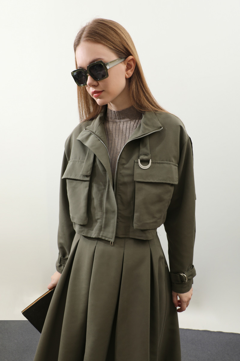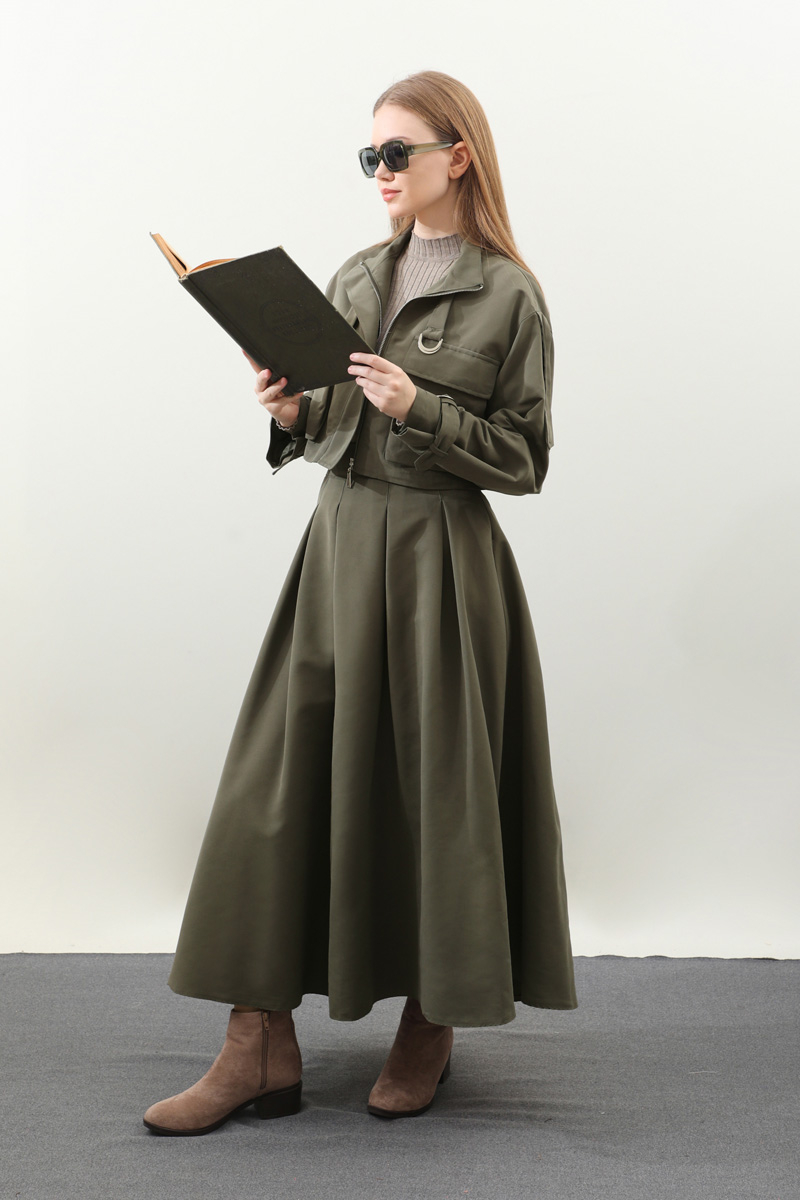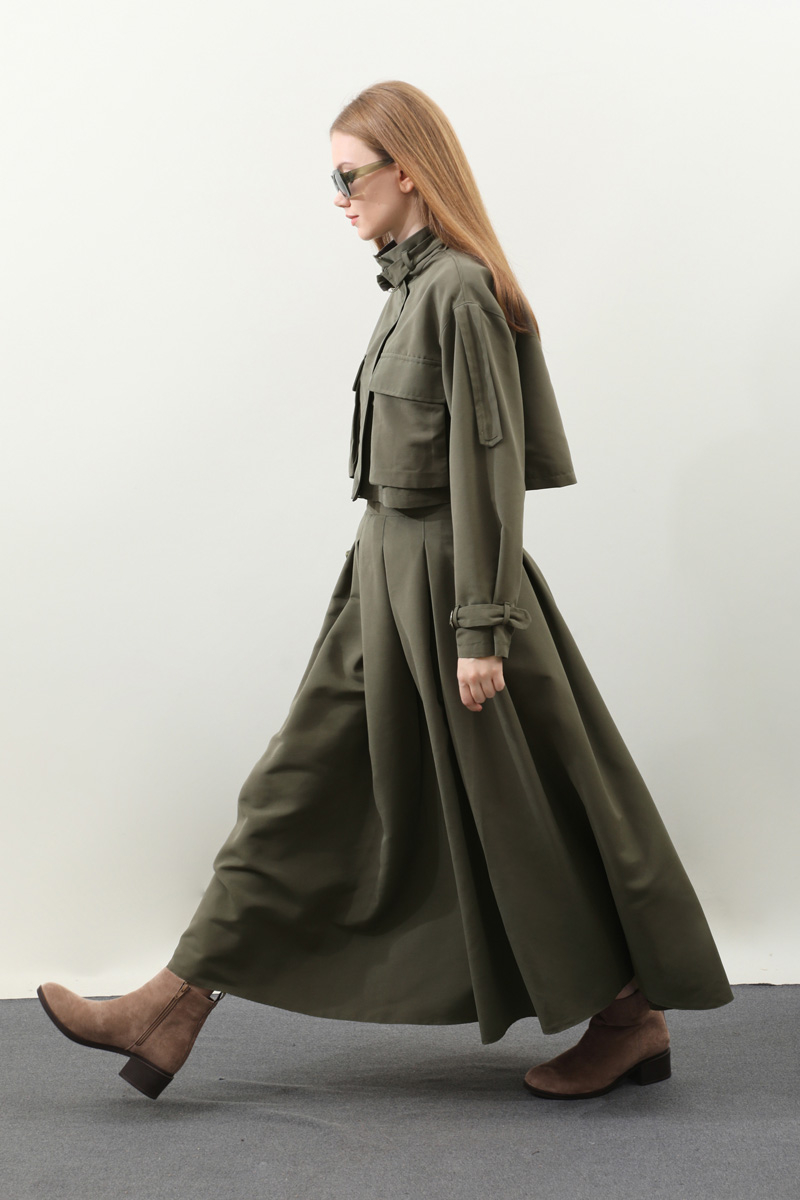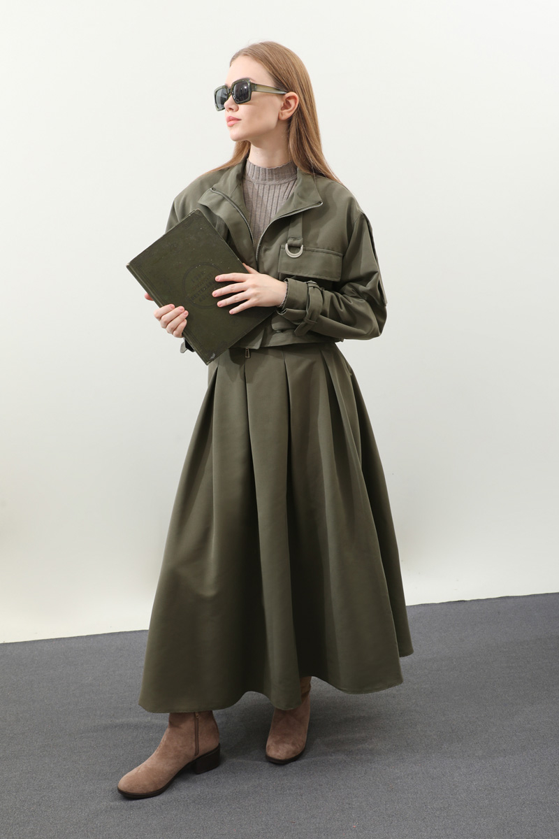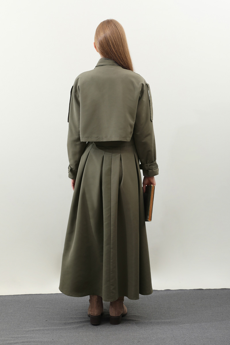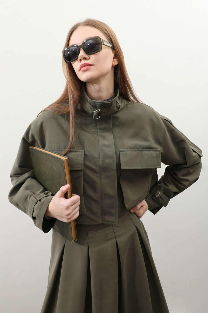 Kargo Cepli Etek Takım Haki. Önden büyük kargo ceplidir. dik yakadır. Boyunu ve bileklerinde kemer detaylıdır. Kemerde metal aksesuar mevcuttur. Etek pilikaşelidir, Astarsızdır, cepsizdir, yandan gizli fermuarlıdır. Günlük kullanım ve özel günlerinizde tercih edebilirsiniz.