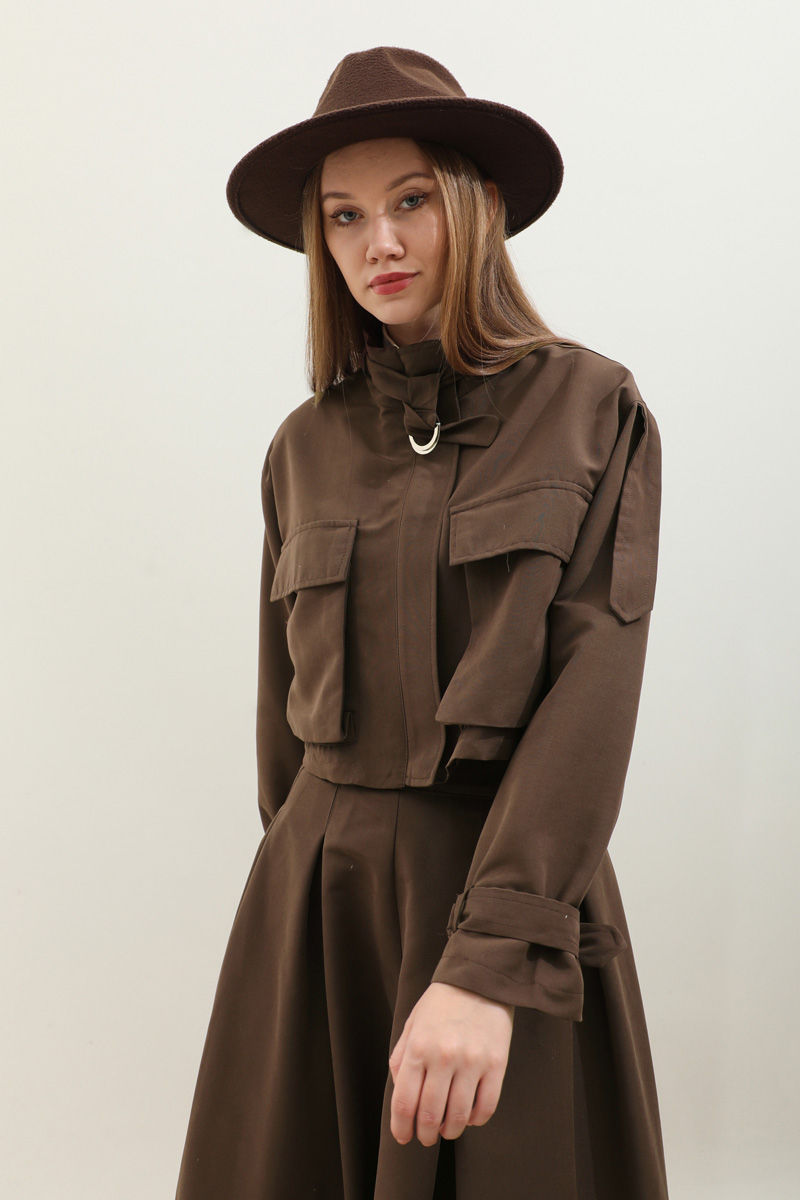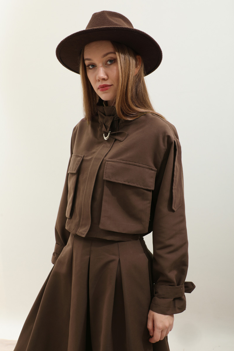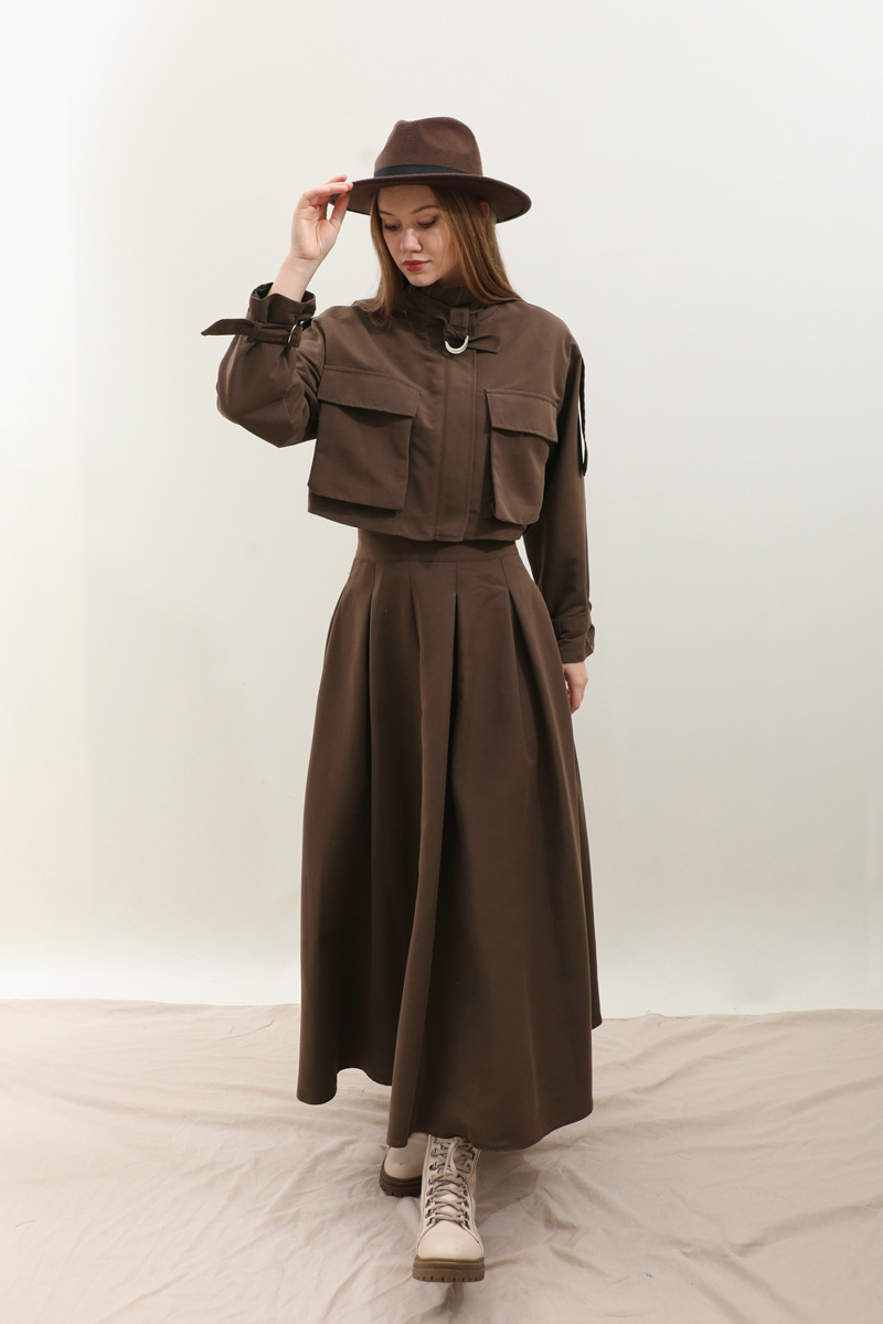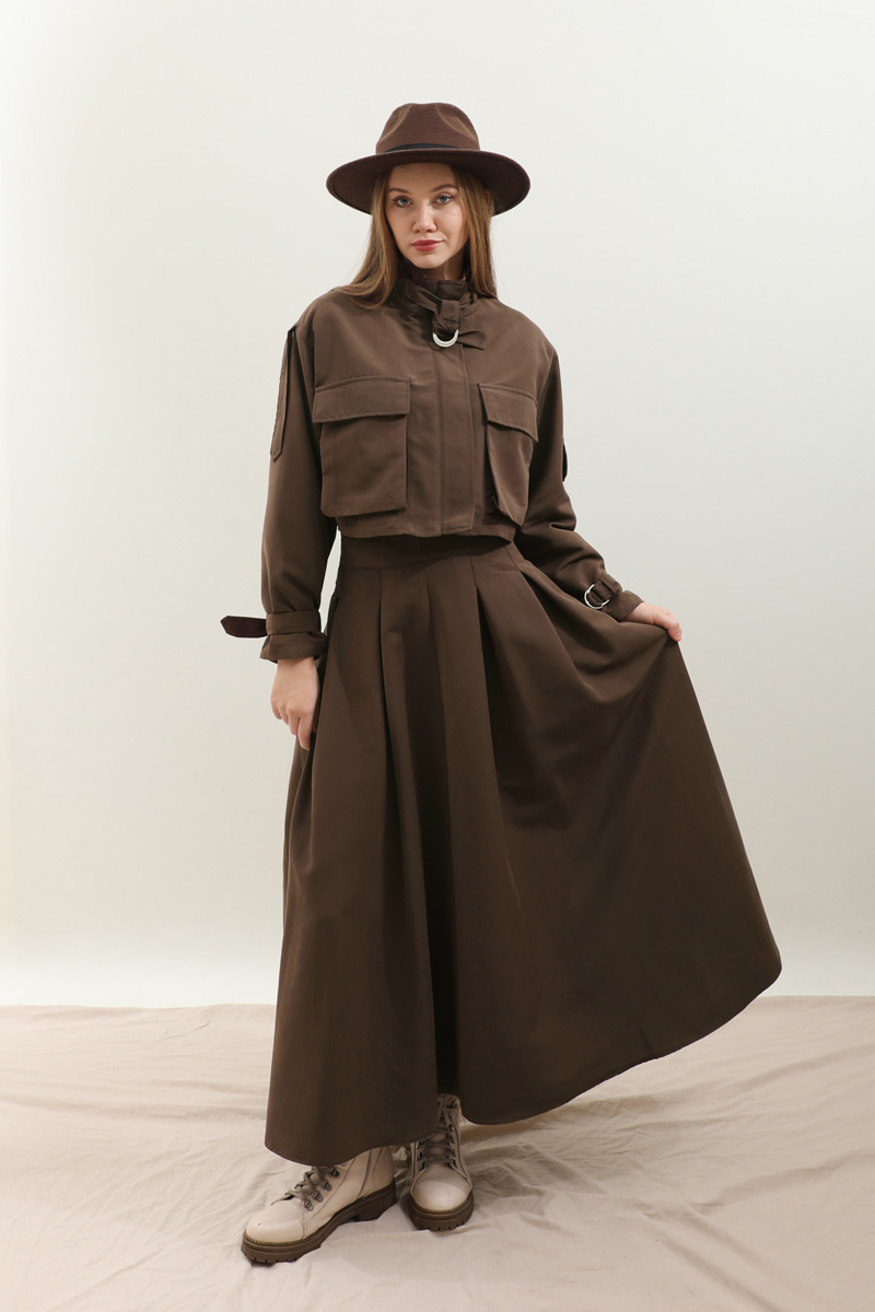 Kargo Cepli Etek Takım Kahverengi. Önden büyük kargo ceplidir. dik yakadır. Boyunu ve bileklerinde kemer detaylıdır. Kemerde metal aksesuar mevcuttur. Etek pilikaşelidir, Astarsızdır, cepsizdir, yandan gizli fermuarlıdır. Günlük kullanım ve özel günlerinizde tercih edebilirsiniz.