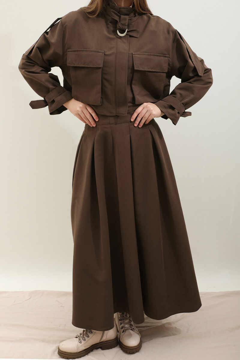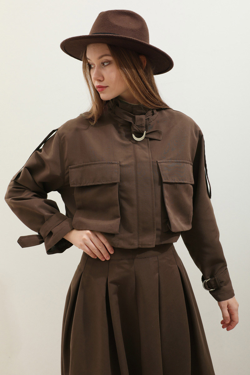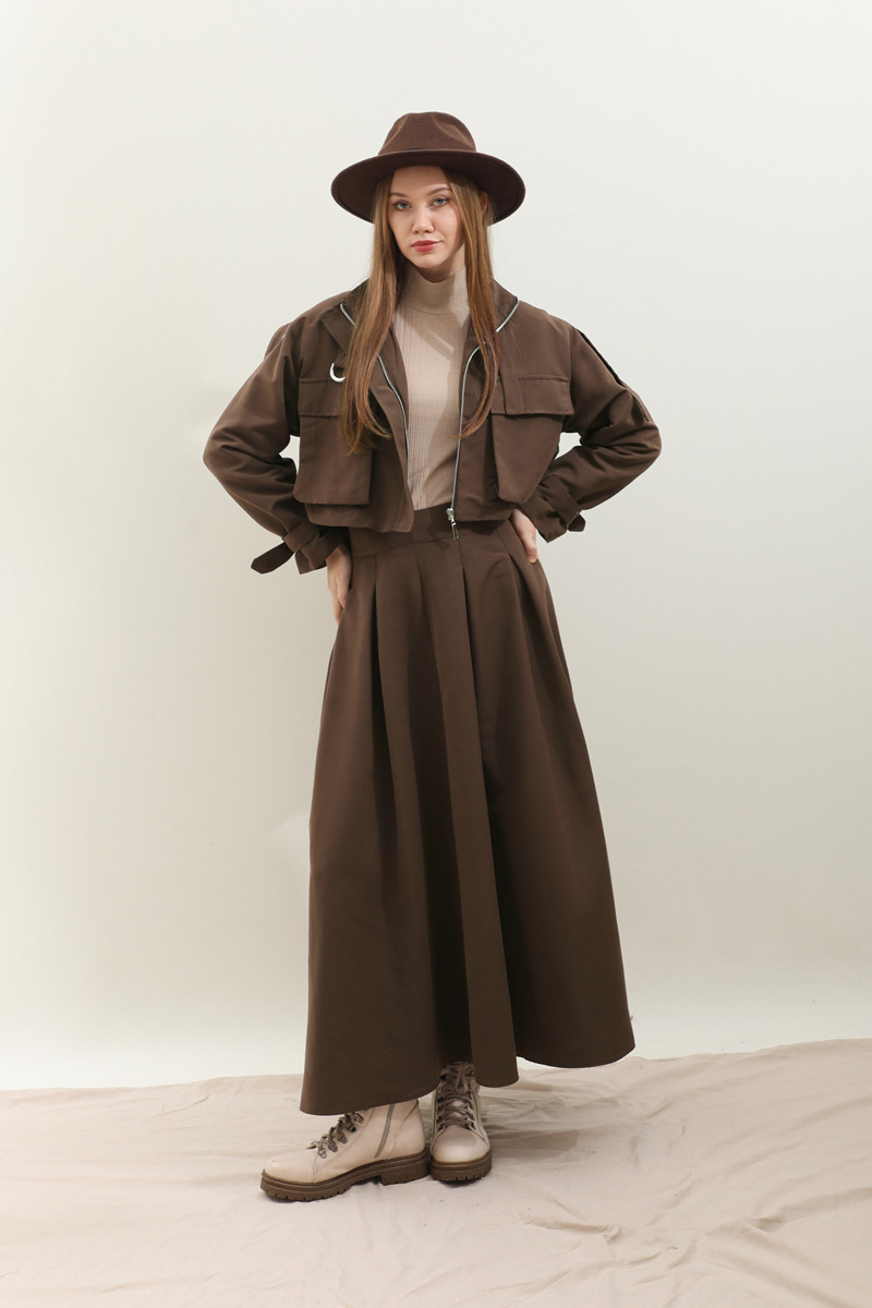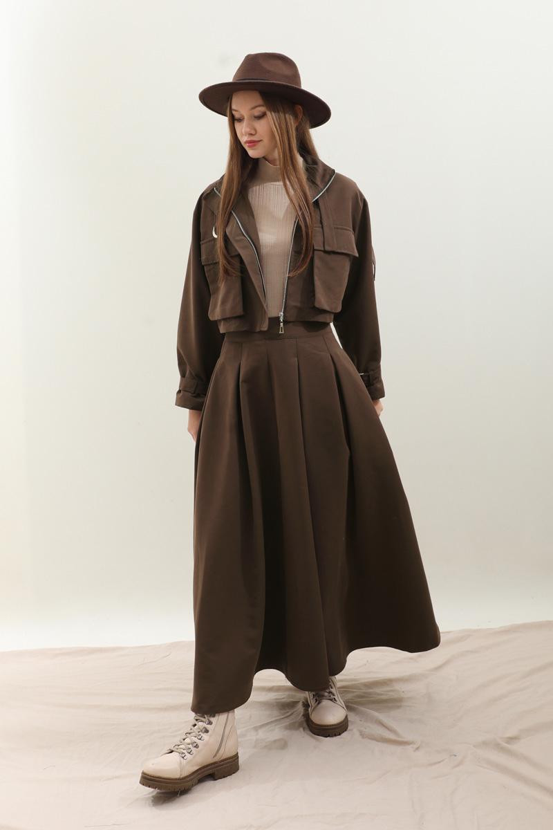 Kargo Cepli Etek Takım Kahverengi. Önden büyük kargo ceplidir. dik yakadır. Boyunu ve bileklerinde kemer detaylıdır. Kemerde metal aksesuar mevcuttur. Etek pilikaşelidir, Astarsızdır, cepsizdir, yandan gizli fermuarlıdır. Günlük kullanım ve özel günlerinizde tercih edebilirsiniz.