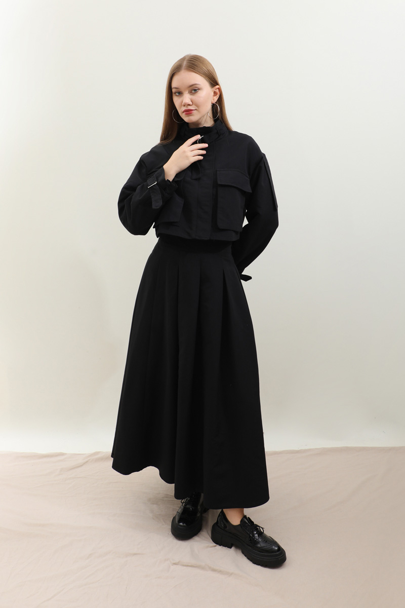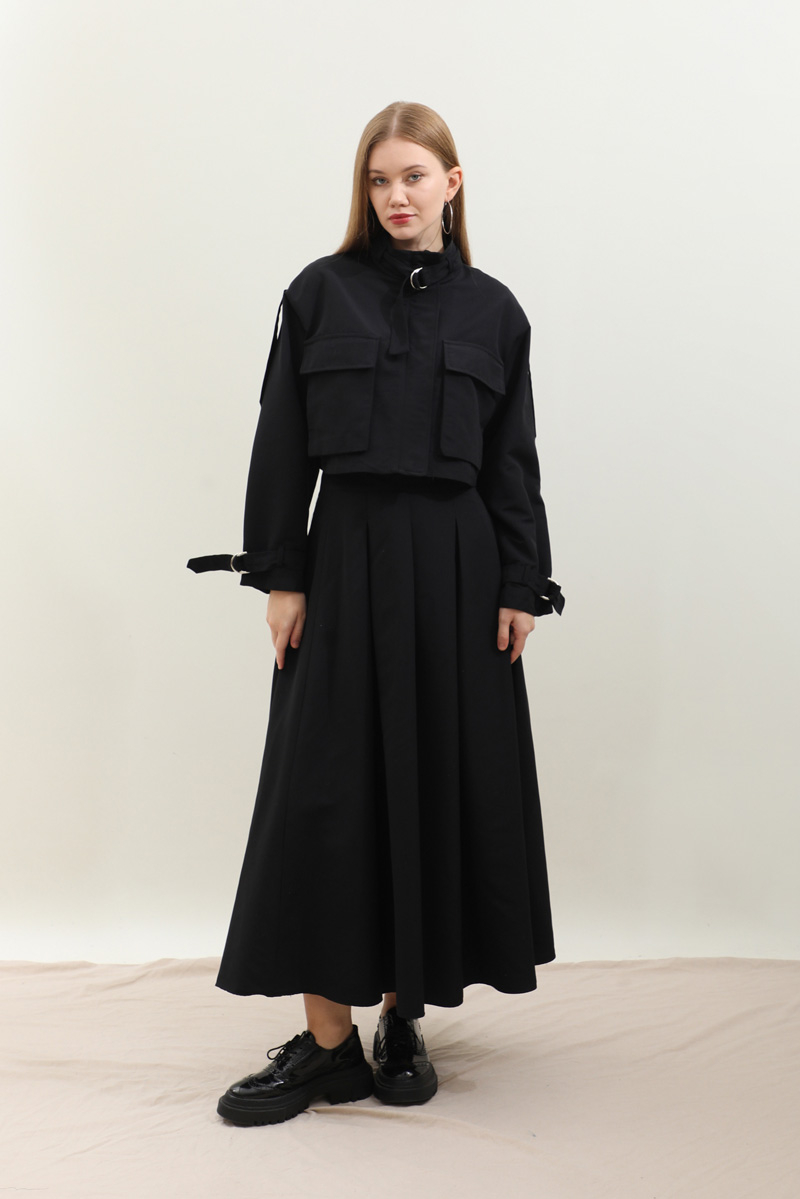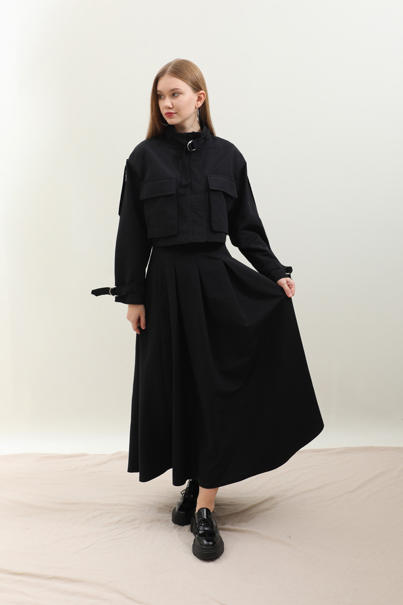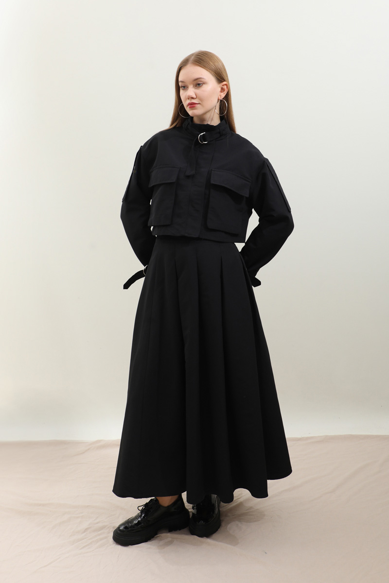 Kargo Cepli Etek Takım Siyah. Önden büyük kargo ceplidir. dik yakadır. Boyunu ve bileklerinde kemer detaylıdır. Kemerde metal aksesuar mevcuttur. Etek pilikaşelidir, Astarsızdır, cepsizdir, yandan gizli fermuarlıdır. Günlük kullanım ve özel günlerinizde tercih edebilirsiniz.