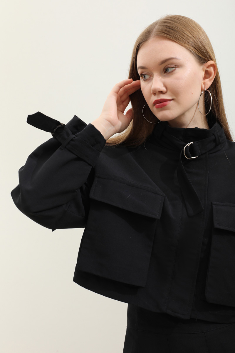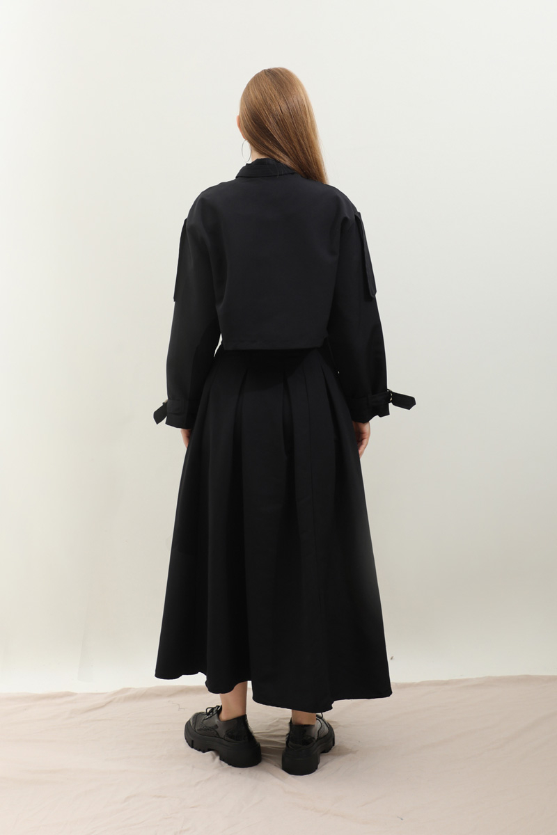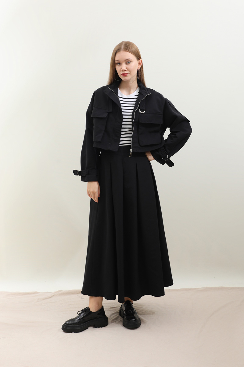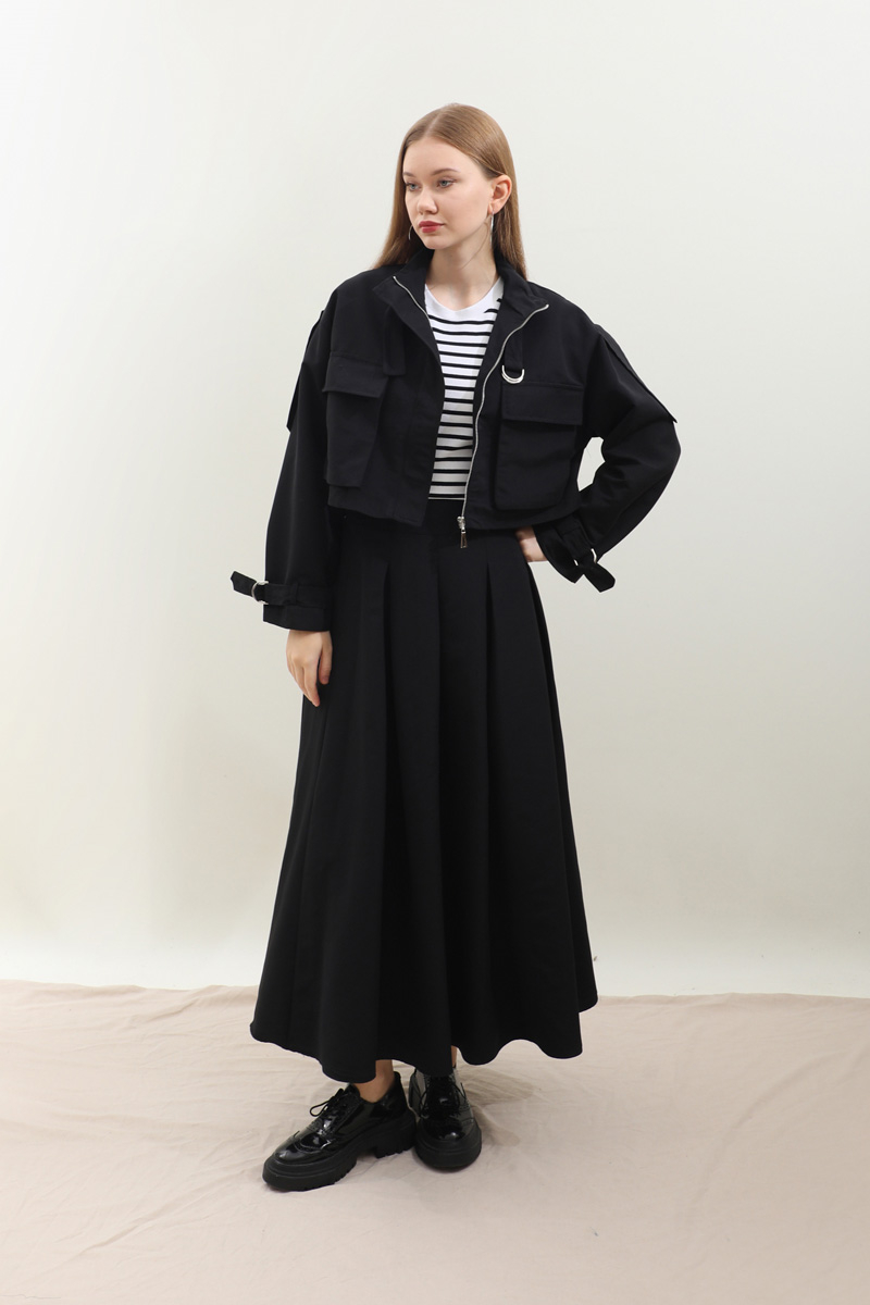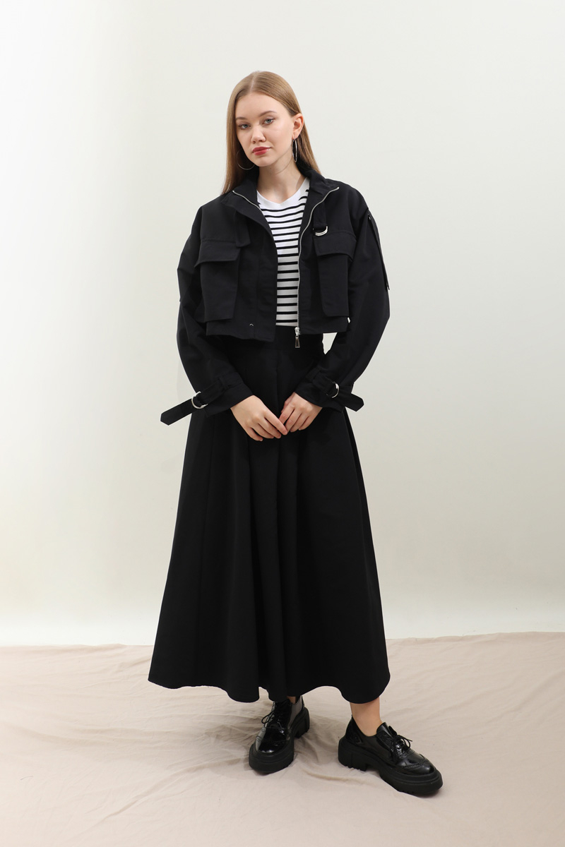 Kargo Cepli Etek Takım Siyah. Önden büyük kargo ceplidir. dik yakadır. Boyunu ve bileklerinde kemer detaylıdır. Kemerde metal aksesuar mevcuttur. Etek pilikaşelidir, Astarsızdır, cepsizdir, yandan gizli fermuarlıdır. Günlük kullanım ve özel günlerinizde tercih edebilirsiniz.