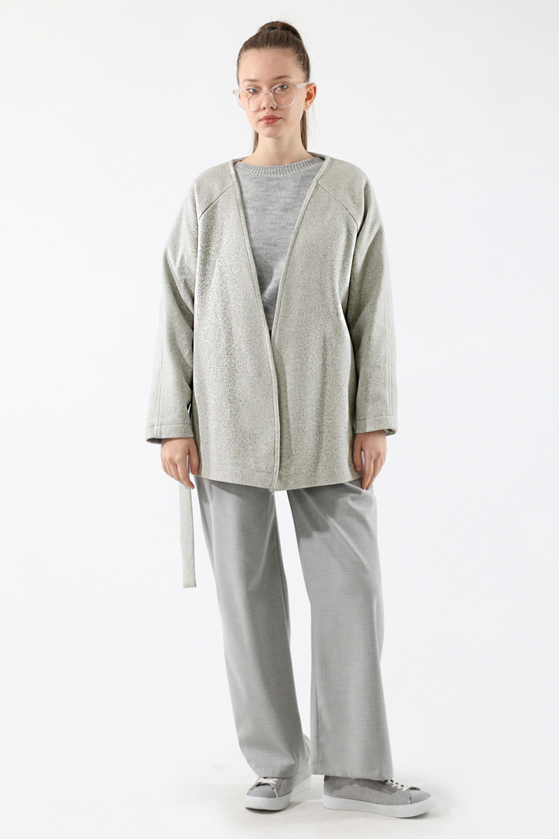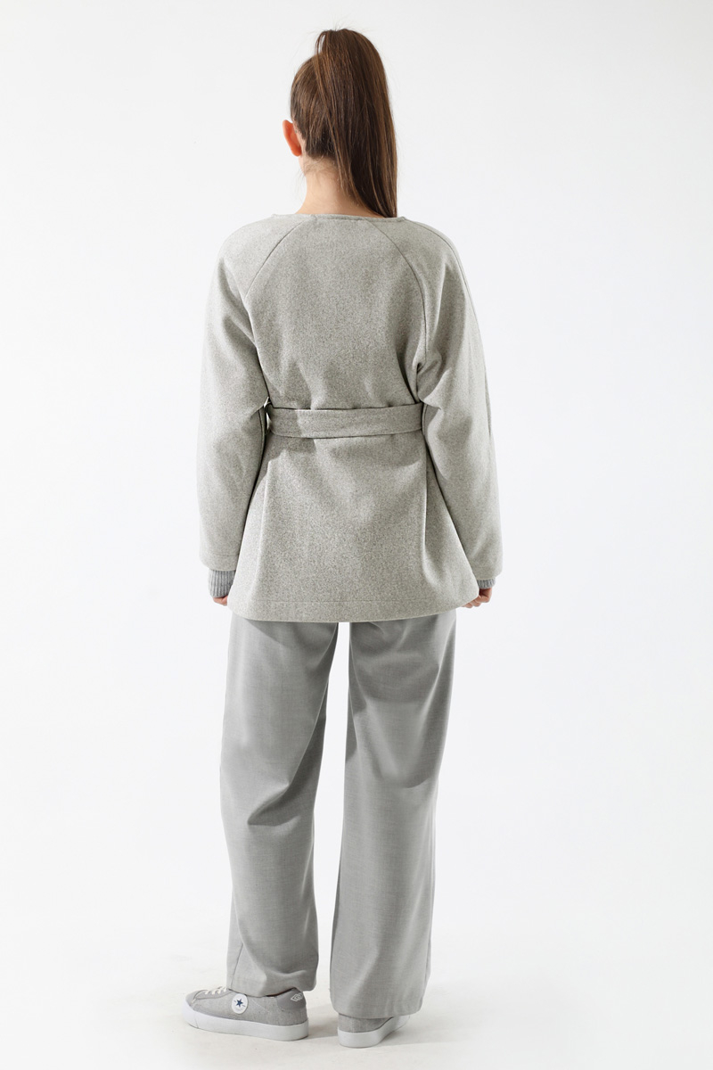 Kaşe Kısa Ceket Gri. Düğmesiz. Seyyar kuşaklı.Yandan cepli. Astarlı.