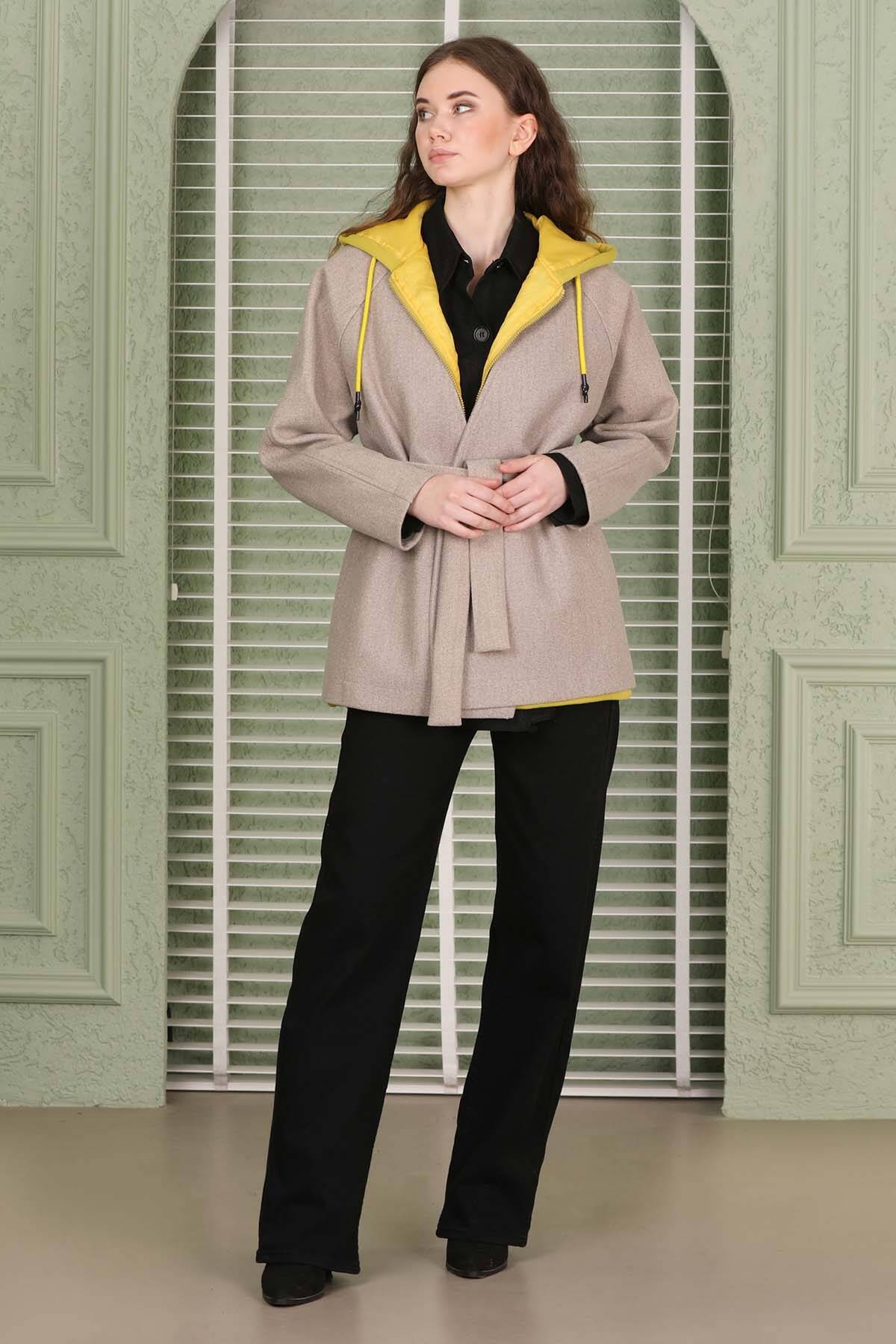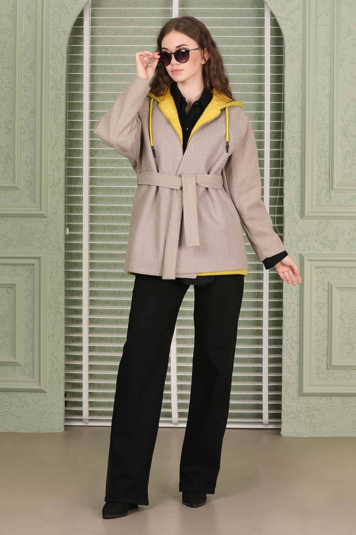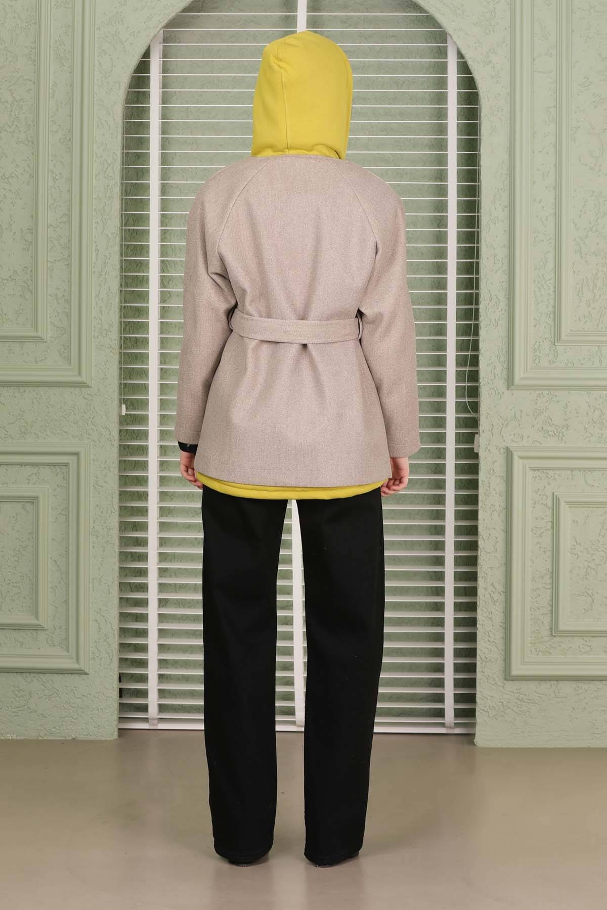 Kaşe Kısa Ceket Bej. Düğmesiz. Seyyar kuşaklı.Yandan cepli. Astarlı.