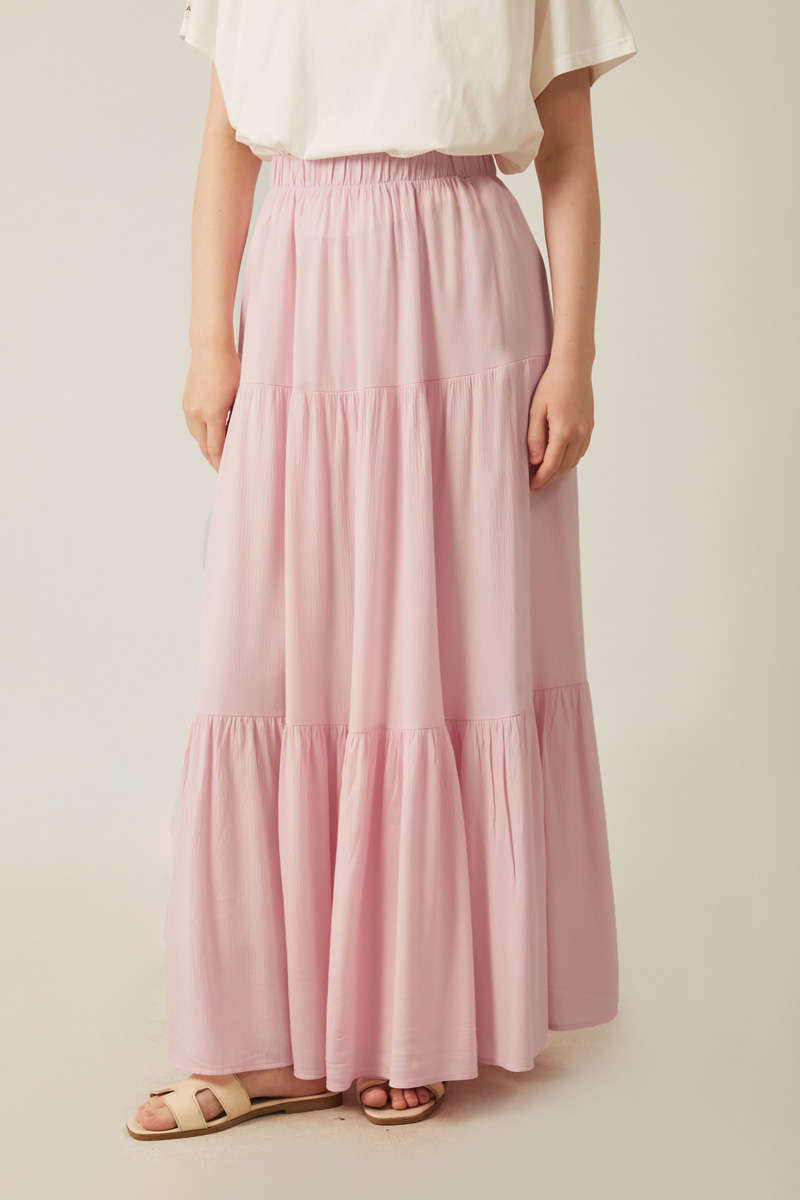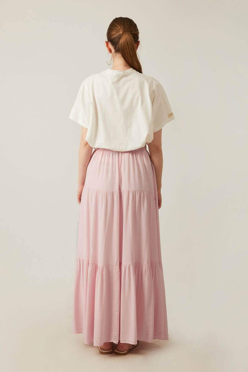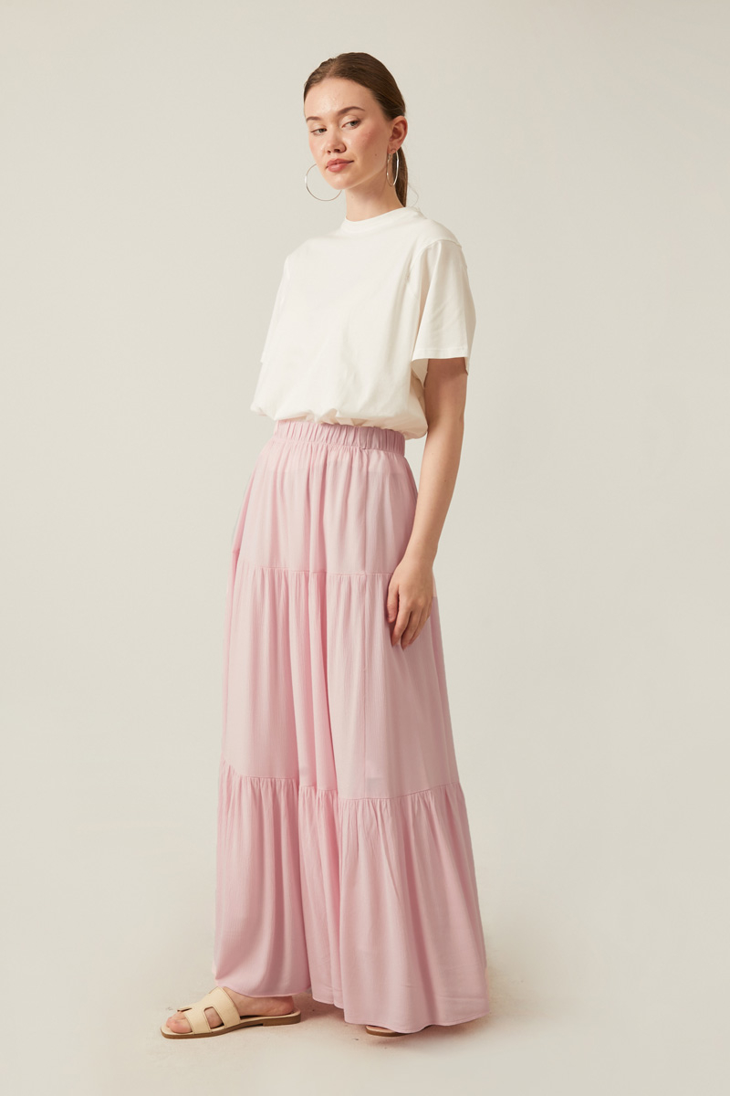 Kat Detaylı Etek Pudra, Bu uzun boy etek, büzgülü beli ve kat kat tasarımıyla rahatlığı ve şıklığı bir araya getiriyor. Hafif ve dökümlü kumaşı sayesinde yaz aylarında veya günlük kullanımda ideal bir seçenek sunuyor.