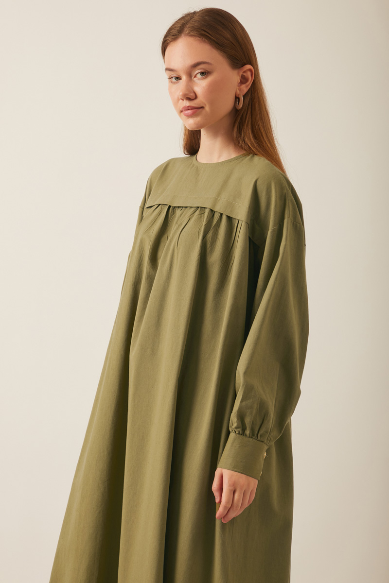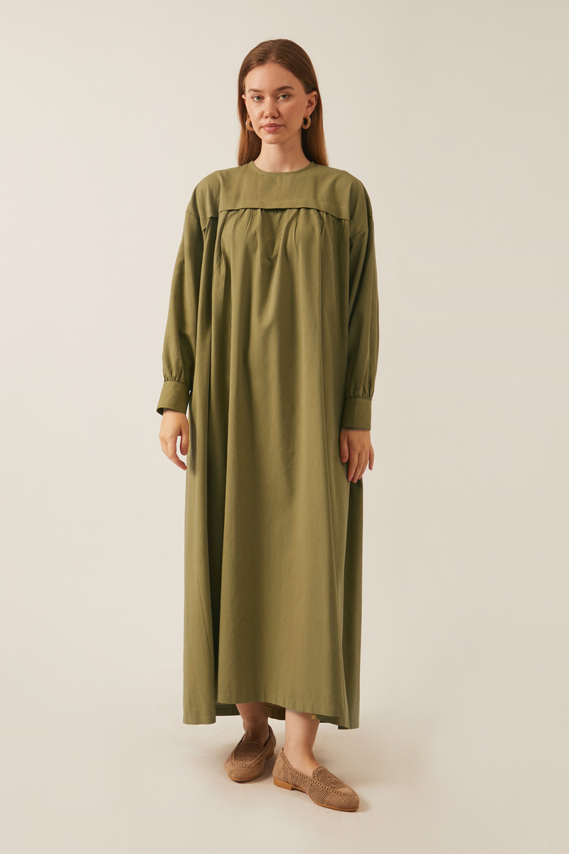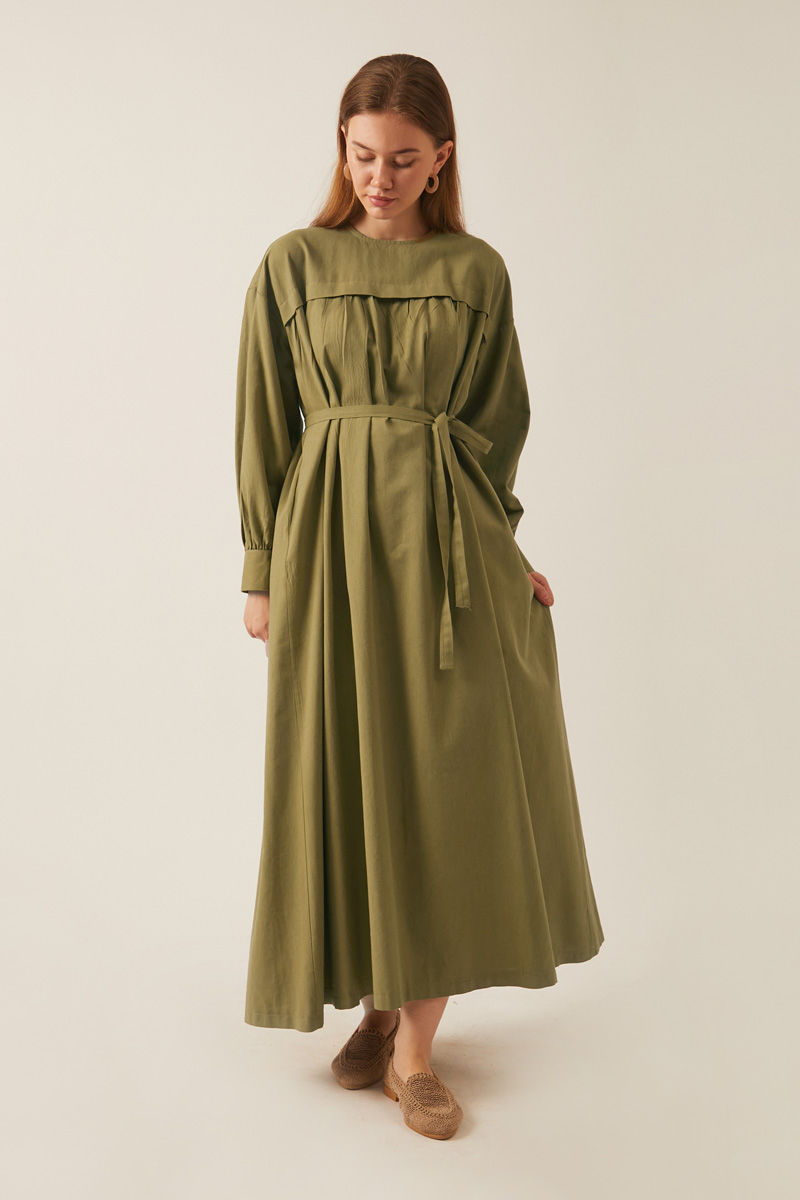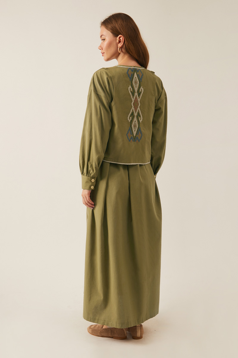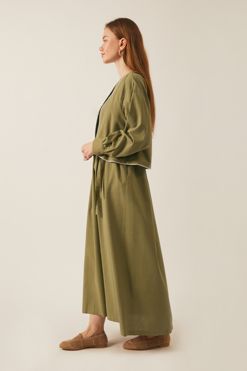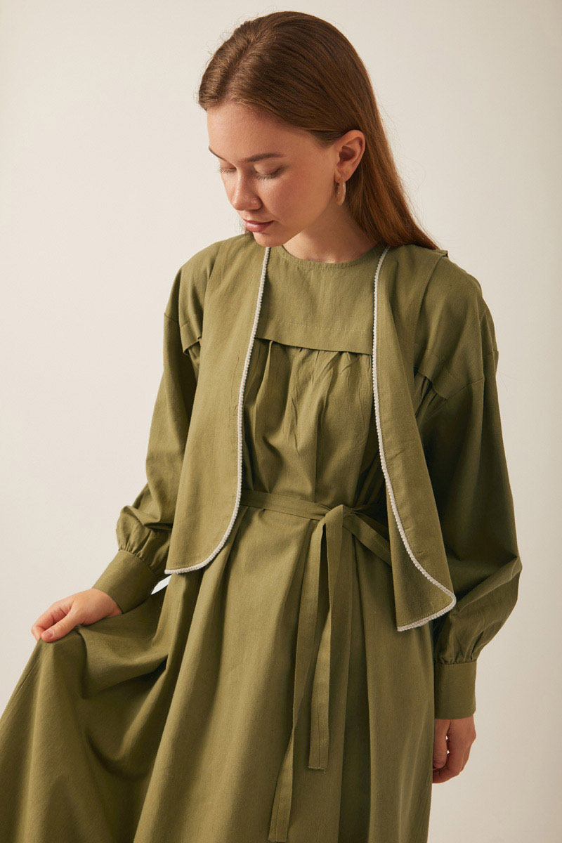 Kayra Yelekli Elbise Takım Haki. Bisiklet yakadır, düşük kolludur, iç elbisesi pileli ve aller detaylıdır, bol kalıptır, beli bağlamalıdır, yandan ceplidir, astarsız, Yelek: Arkası etnik desen nakışlıdır, yelek dikiş kenarları pamuk biye şeritlidir. Günlük kullanım için uygundur.