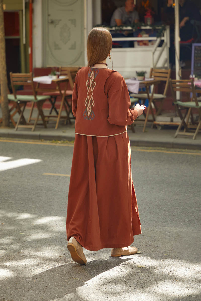 Kayra Yelekli Elbise Takım Kiremiti. Bisiklet yakadır, düşük kolludur, iç elbisesi pileli ve aller detaylıdır, bol kalıptır, beli bağlamalıdır, yandan ceplidir, astarsız, Yelek: Arkası etnik desen nakışlıdır, yelek dikiş kenarları pamuk biye şeritlidir. Günlük kullanım için uygundur.