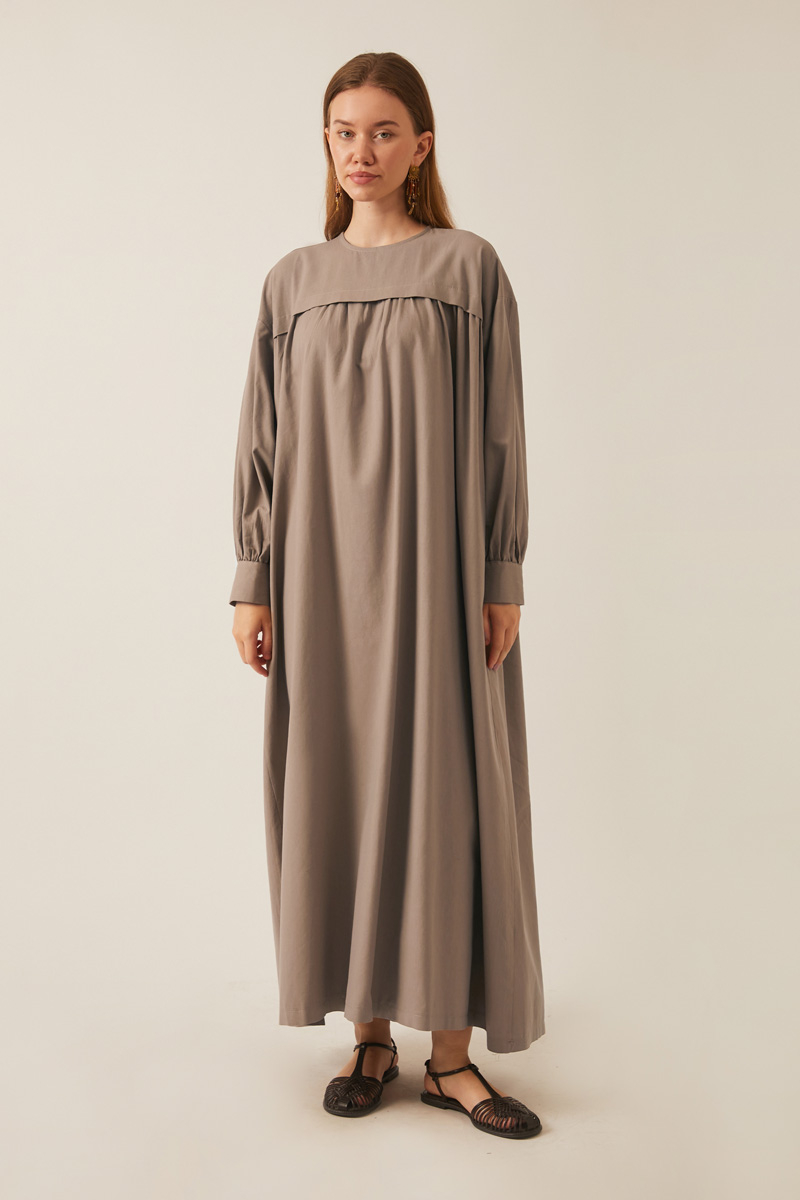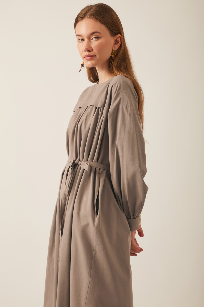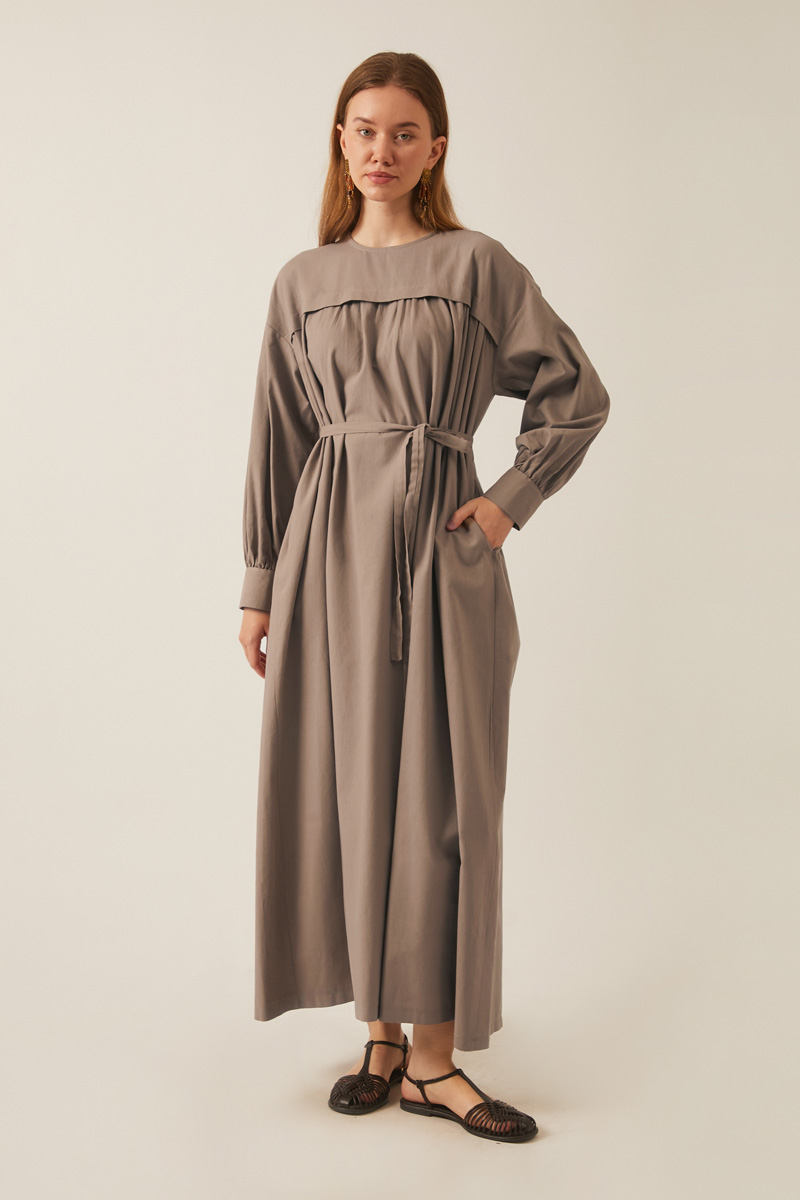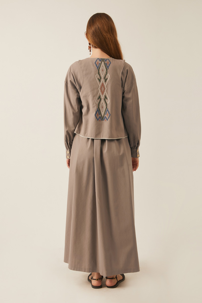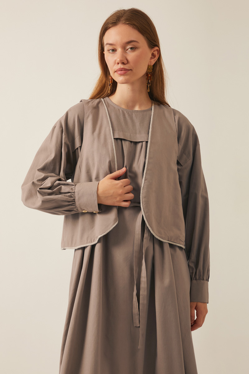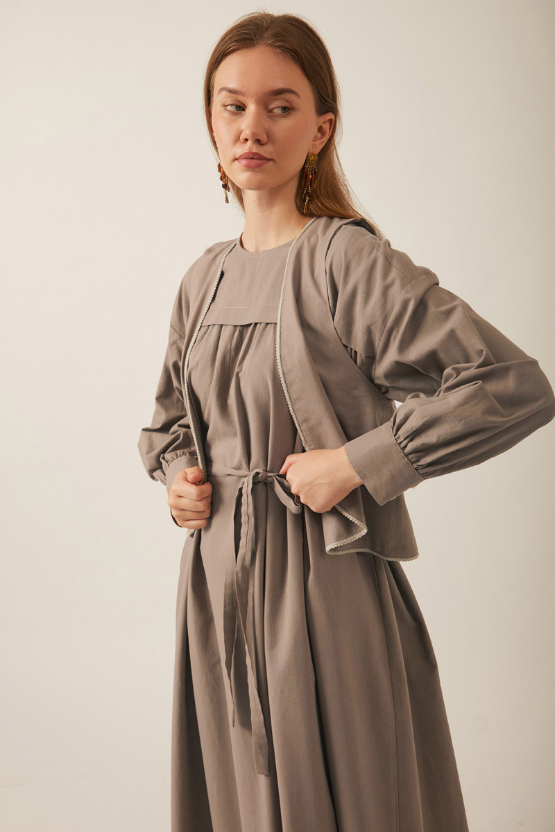 Kayra Yelekli Elbise Takım Vizon. Bisiklet yakadır, düşük kolludur, iç elbisesi pileli ve aller detaylıdır, bol kalıptır, beli bağlamalıdır, yandan ceplidir, astarsız, Yelek: Arkası etnik desen nakışlıdır, yelek dikiş kenarları pamuk biye şeritlidir. Günlük kullanım için uygundur.