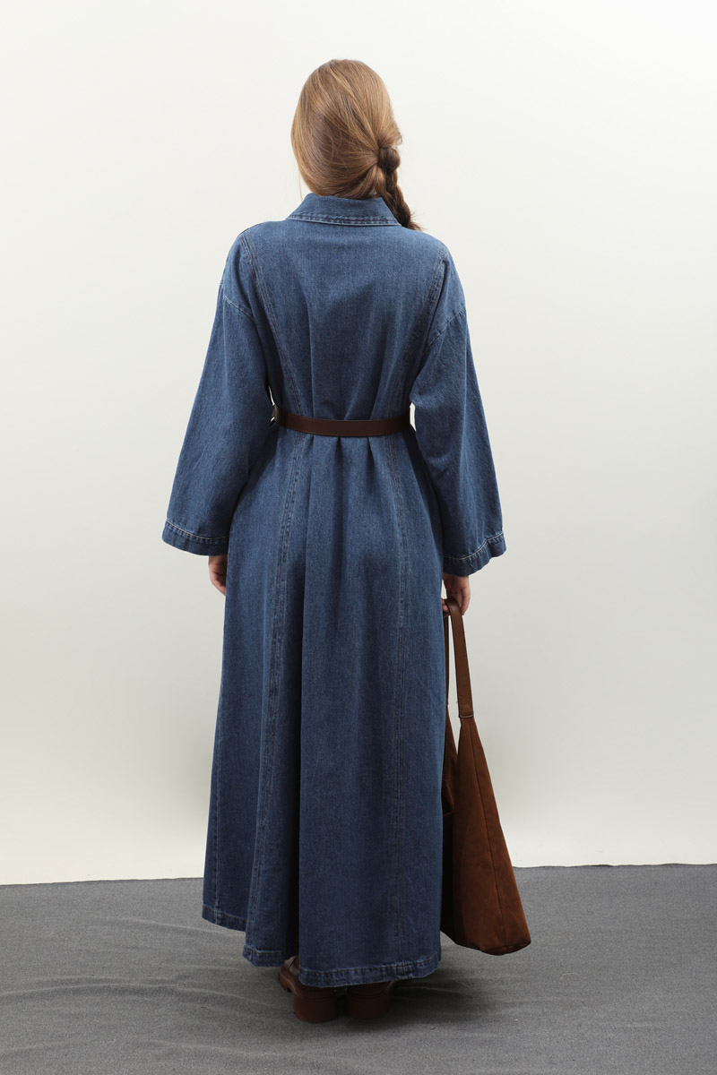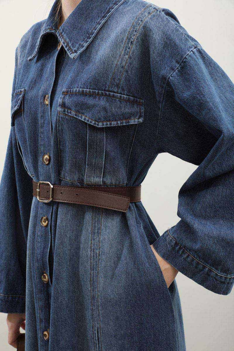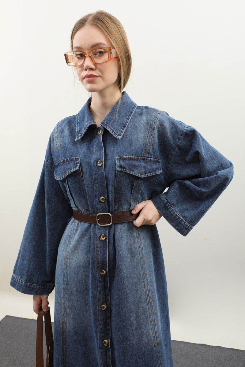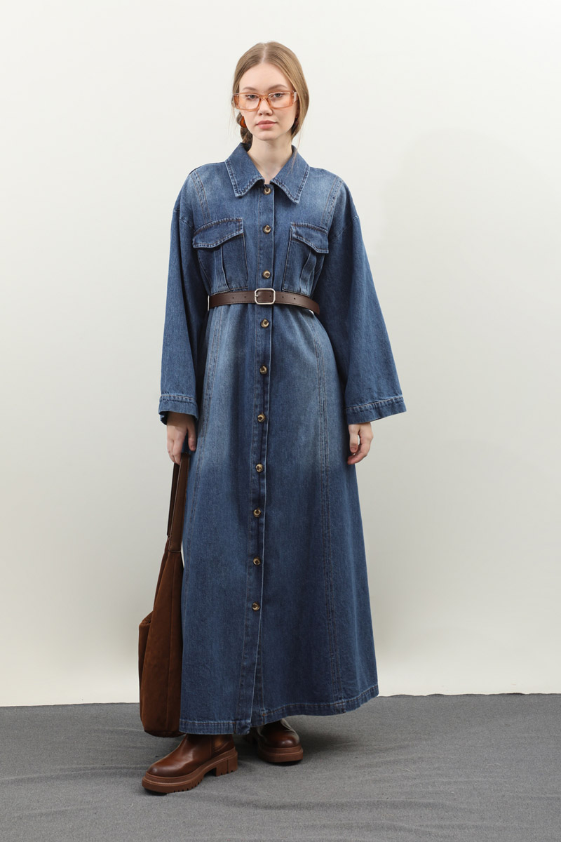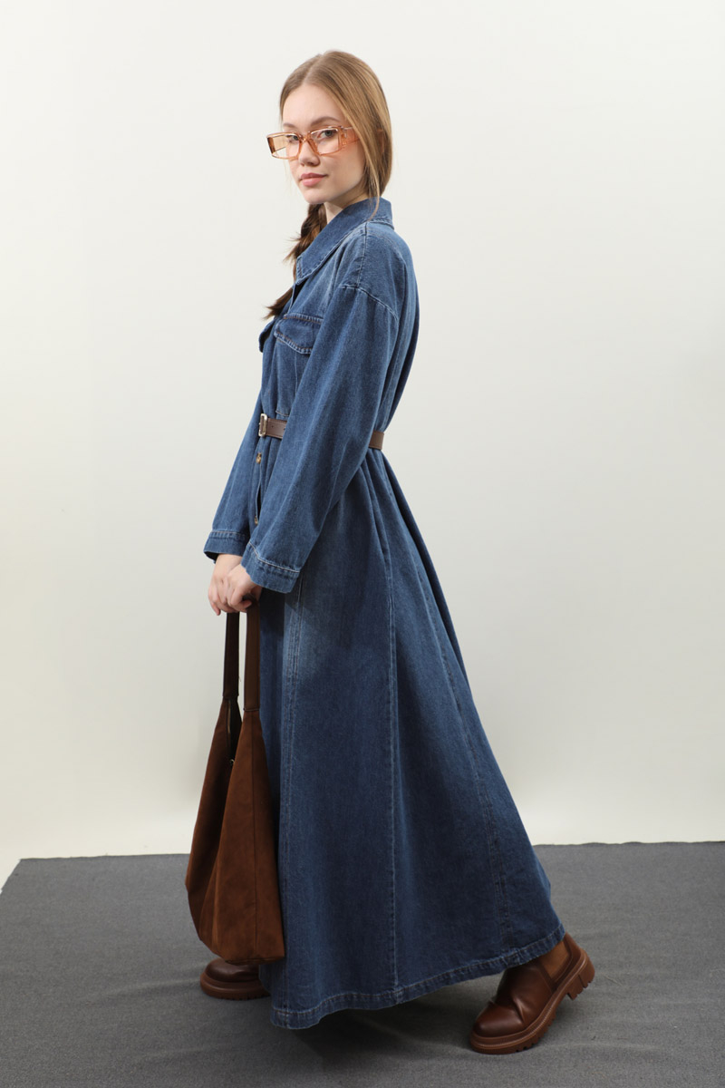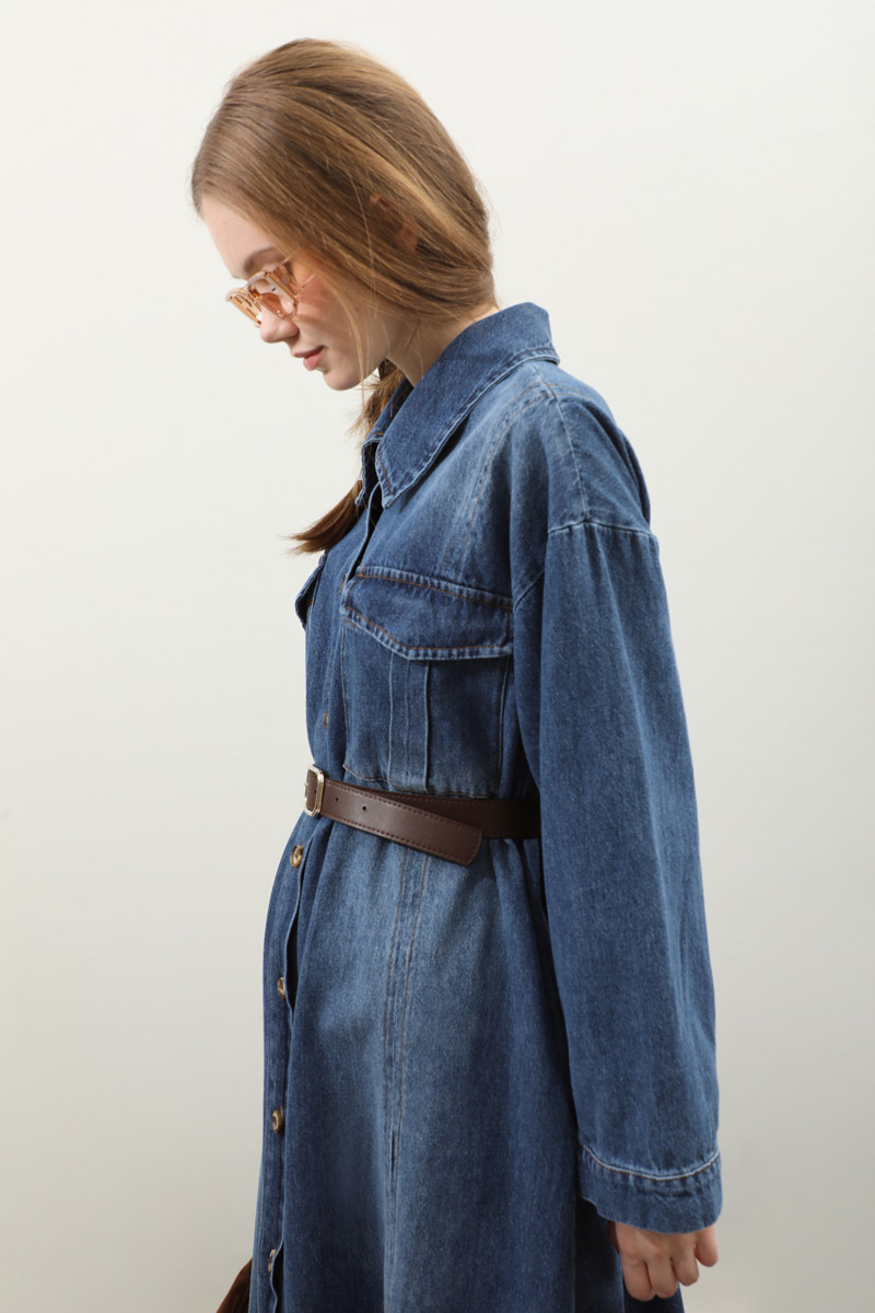 Kemerli Kot Elbise Açık Mavi. Gömlek yakadır, düşük kolludur, önden düğmelidir, yandan ceplidir. Ön bedende cep pile detaylıdır, beden parça dikiş detaylıdır, deri kemerlidir, astarsızdır. Günlük kullanım ve özel günlerinizde tercih edebilirsiniz.
