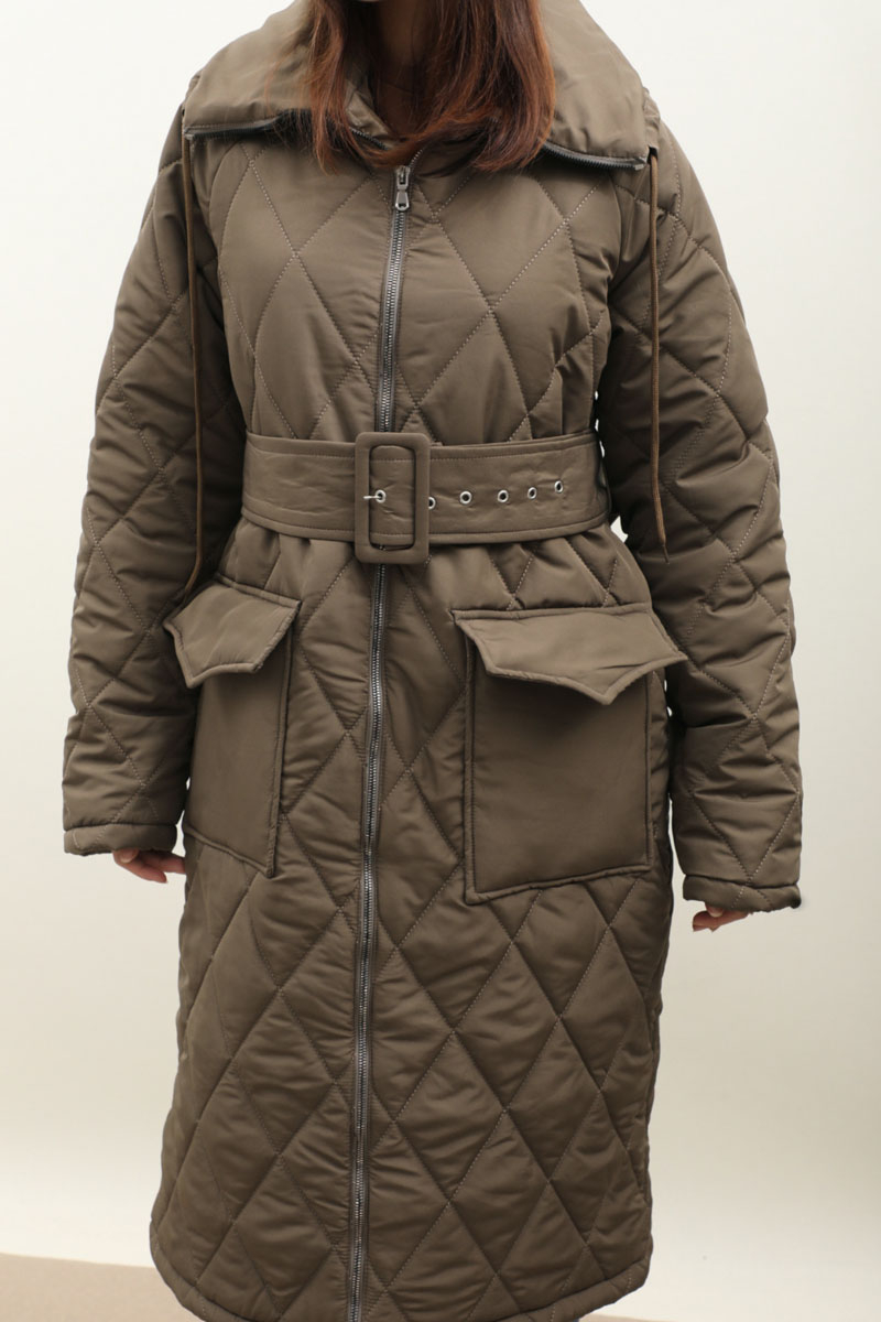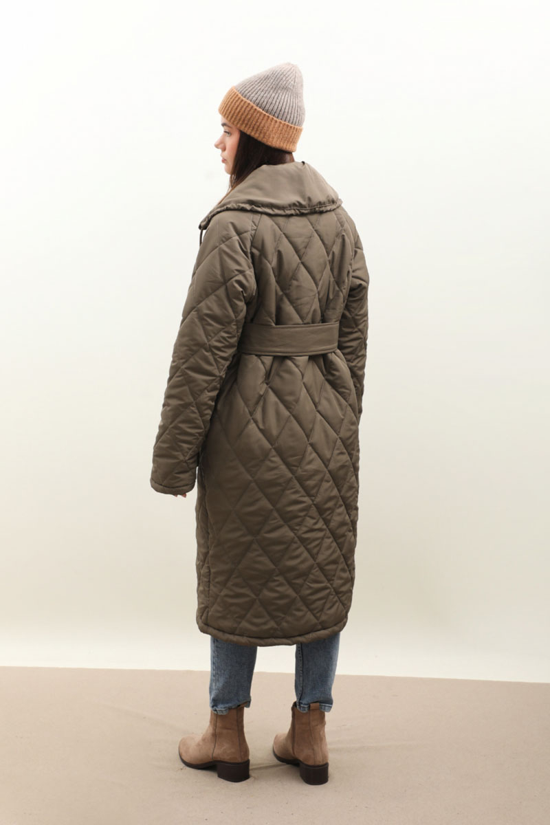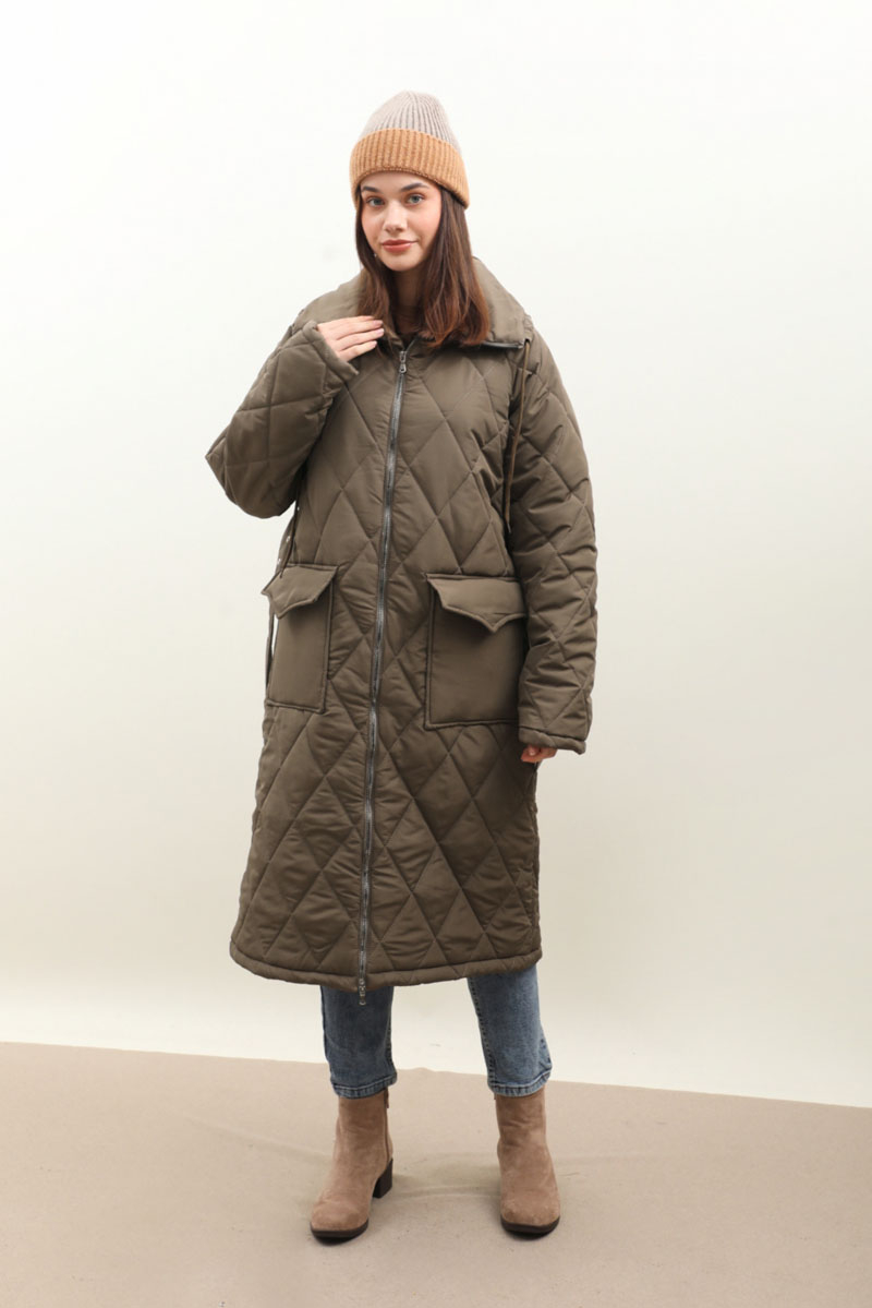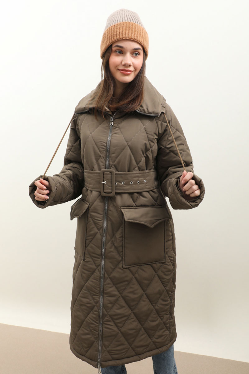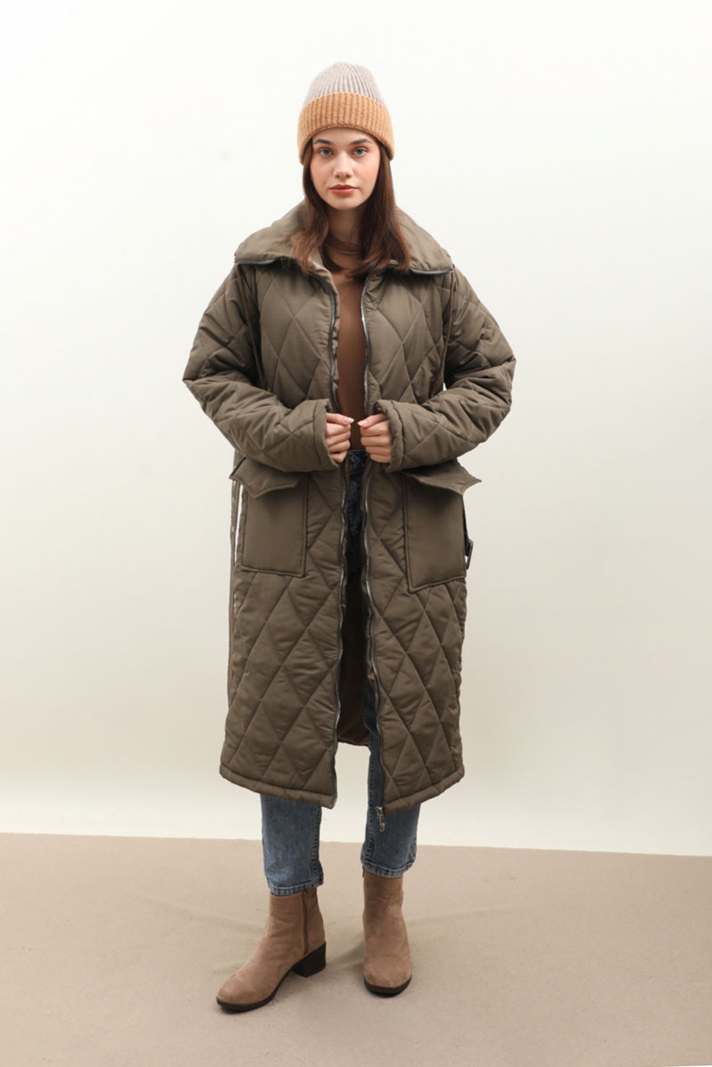 Kemerli Şişme Mont Haki. Beğcıklı dik yakadır, reglan koludur, önden fermuarlıdır, kapitone baklava desenlidir, ceplidir, kemerlidir, astarlıdır, Günlük kullanım ve özel günlerinizde tercih edebilirsiniz.