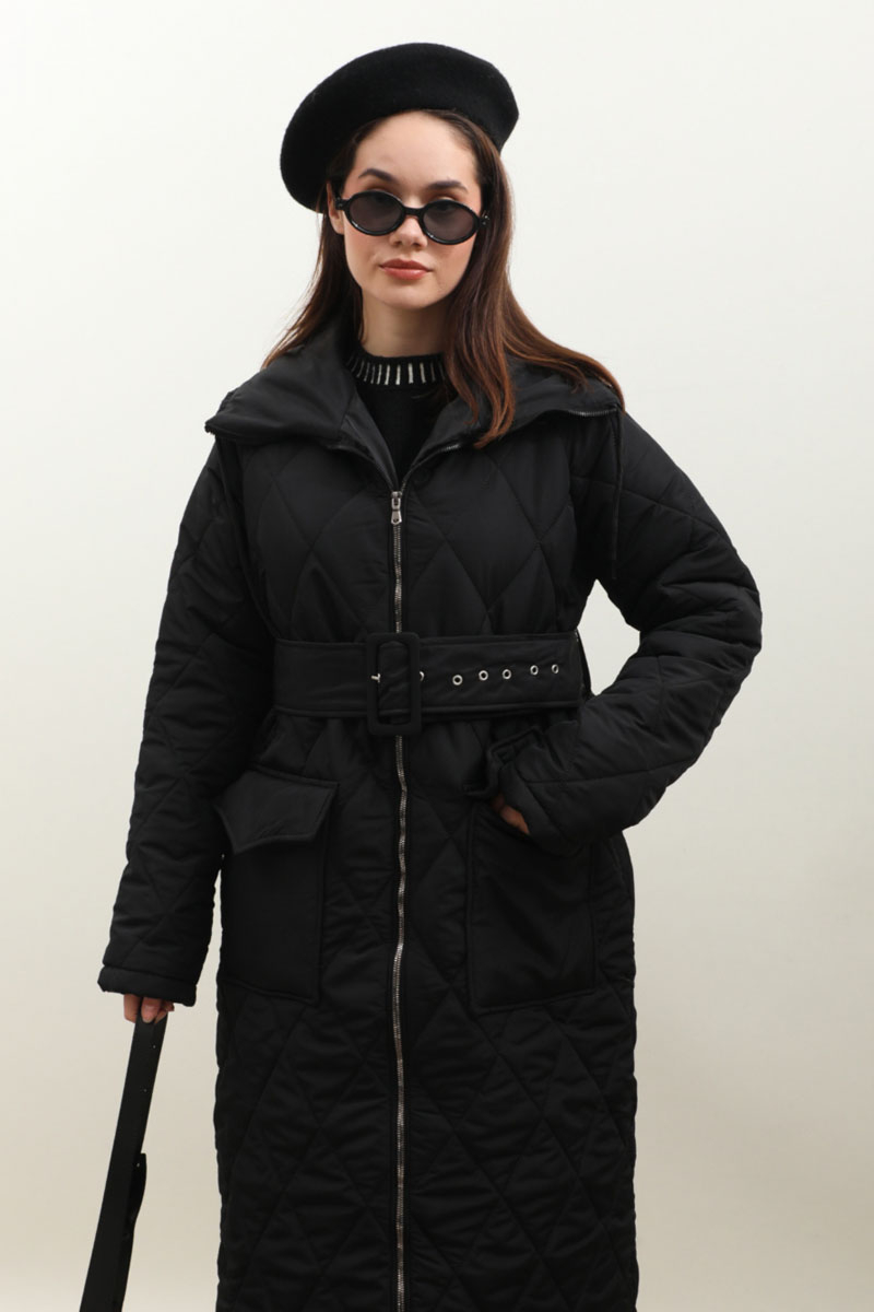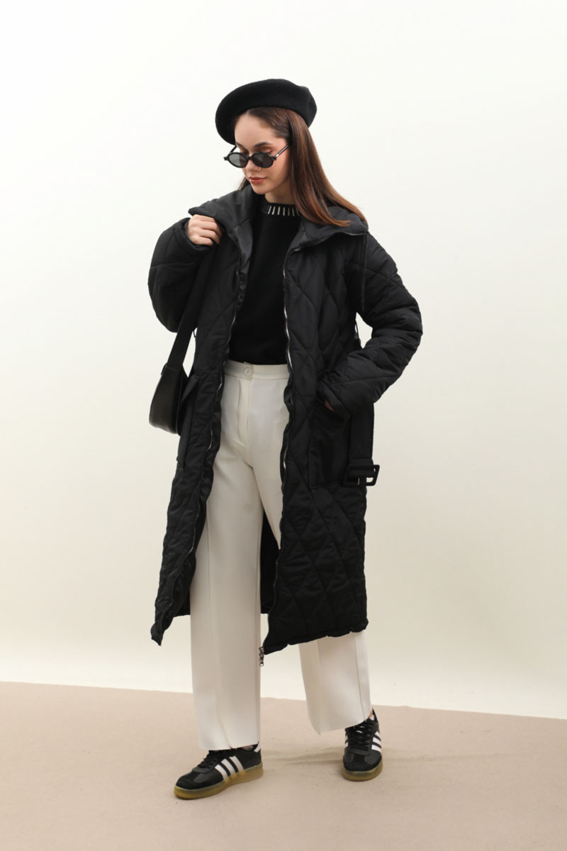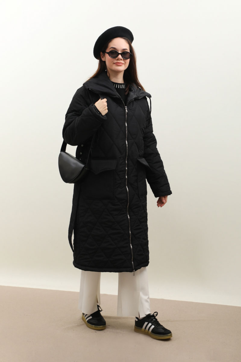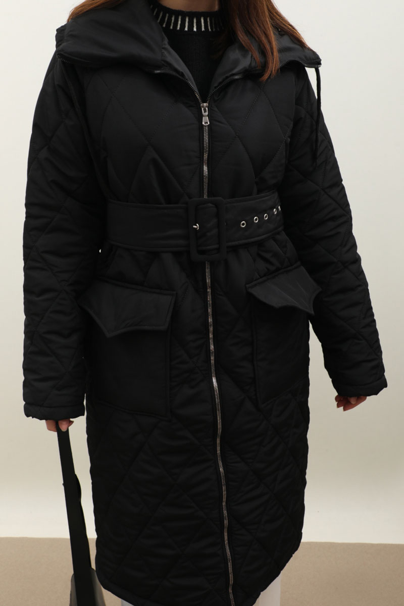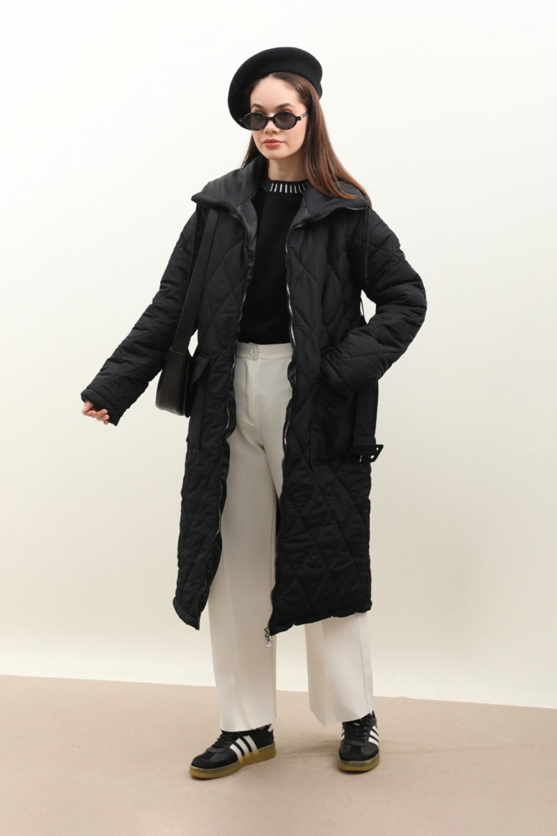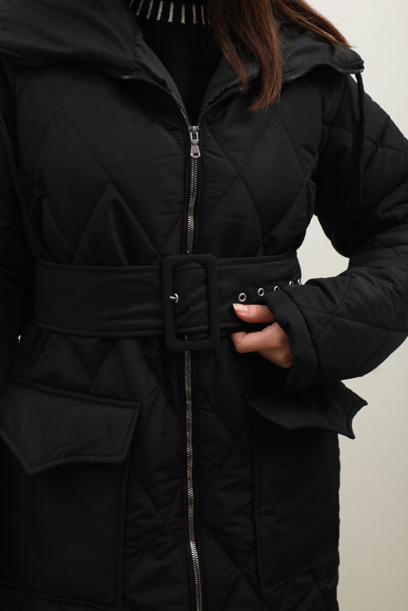 Kemerli Şişme Mont Siyah. Beğcıklı dik yakadır, reglan koludur, önden fermuarlıdır, kapitone baklava desenlidir, ceplidir, kemerlidir, astarlıdır, Günlük kullanım ve özel günlerinizde tercih edebilirsiniz.