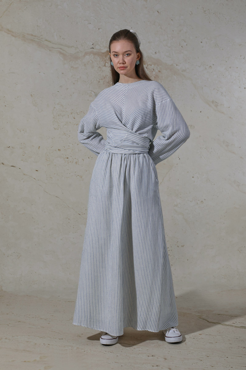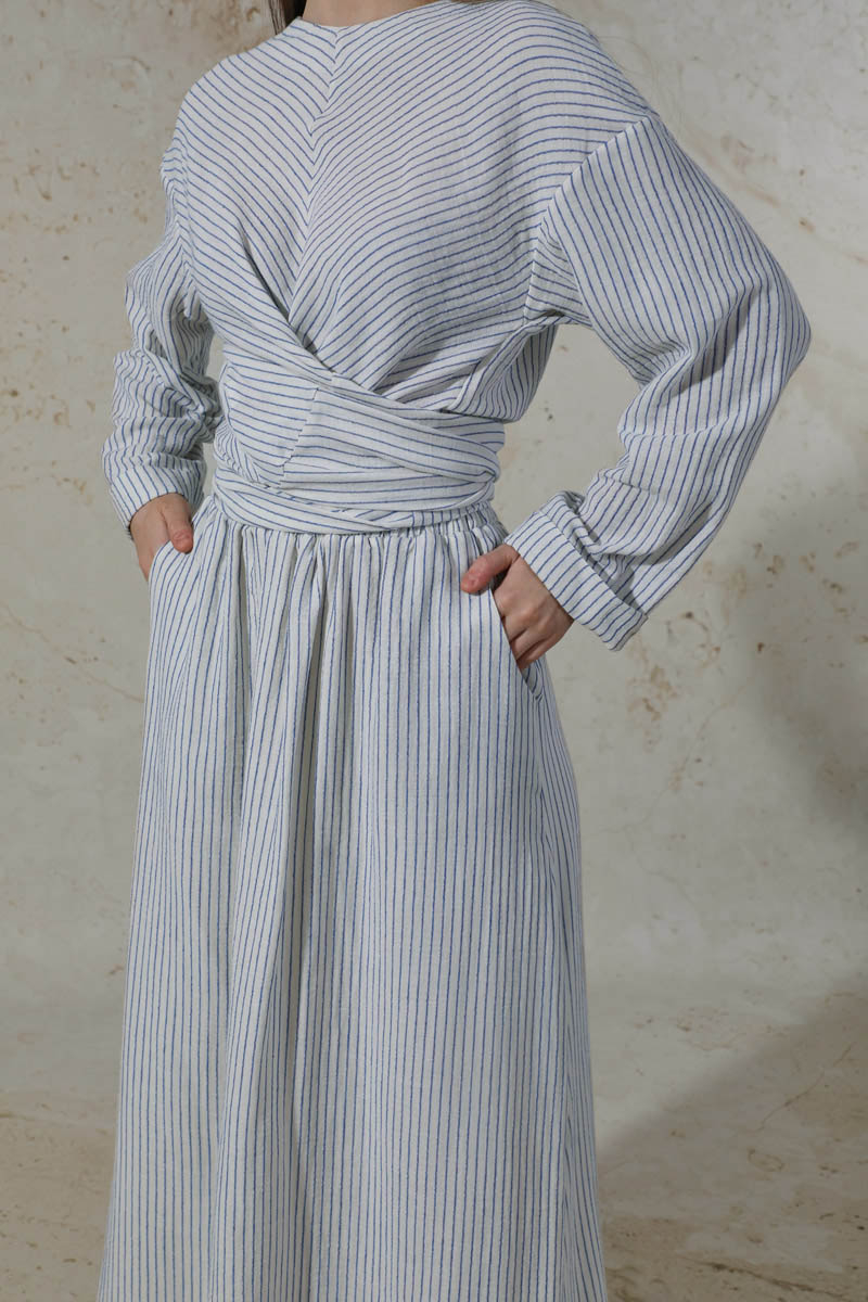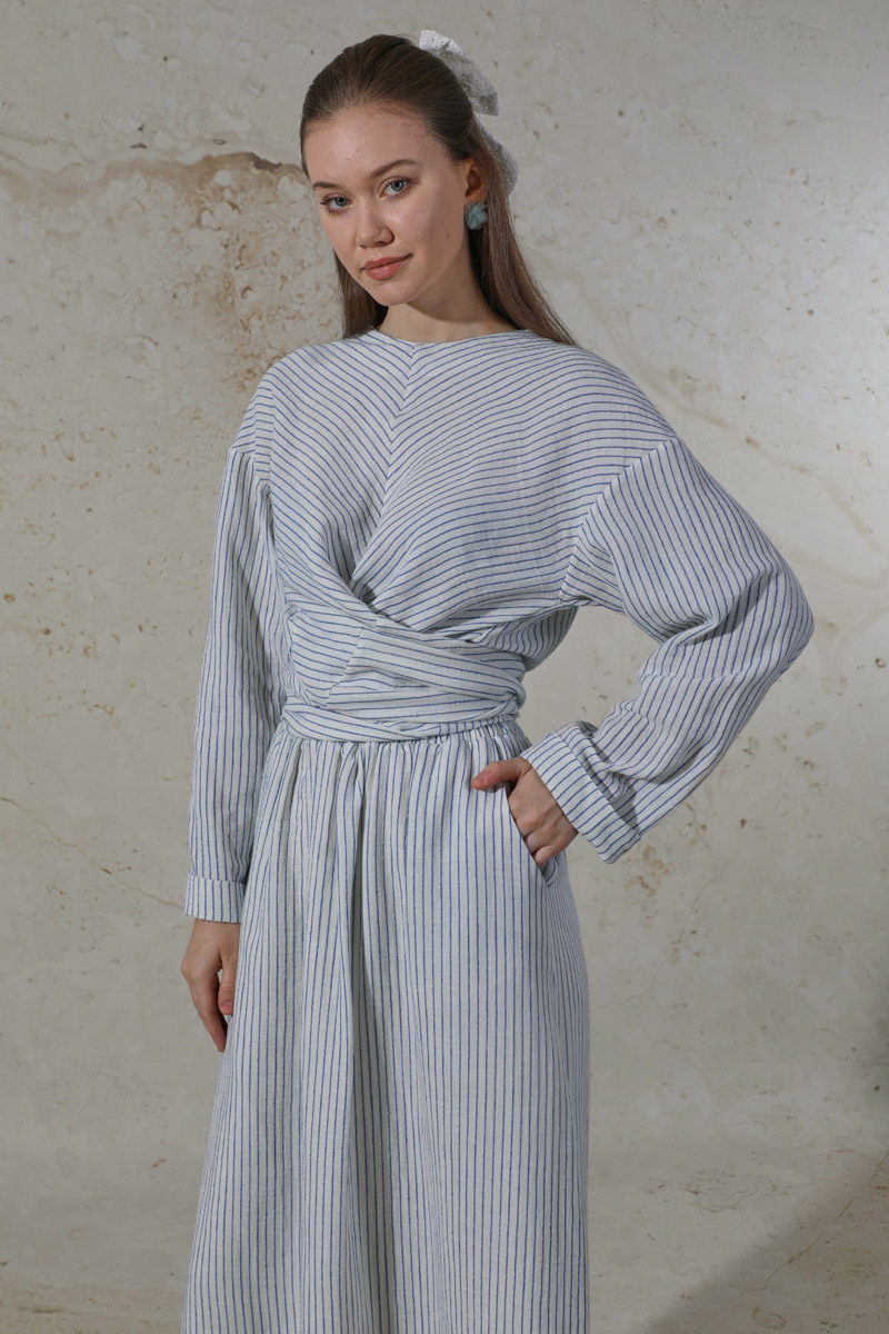 Bağlamalı Müslin Etek Takım Mavi. Düşük omuzludur. Bluz bağlama detaylıdır. Duble kol detaylıdır. Arkadan düğmelidir. Etek beli lastiklidir. Yandan ceplidir. Kuşaklıdır. Günlük kullanım ve özel günlerinizde tercih edebilirsiniz.