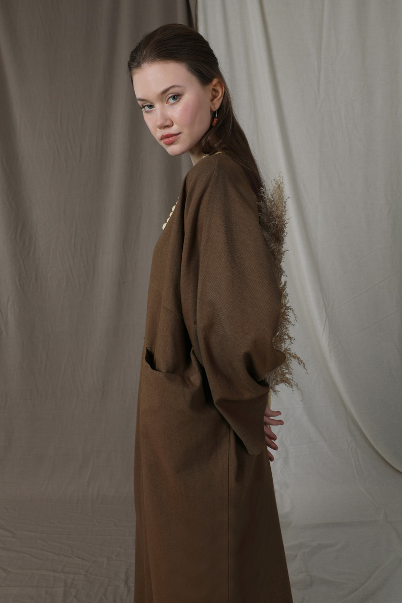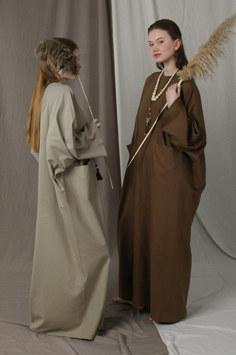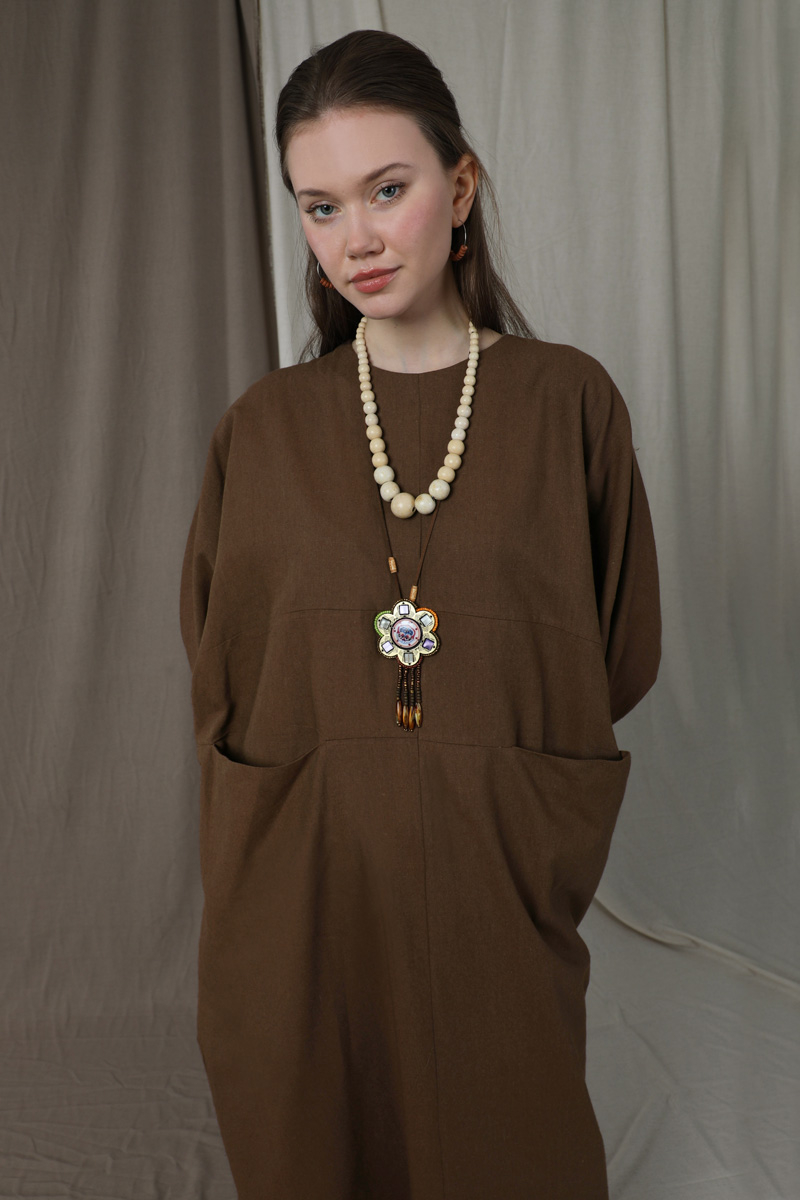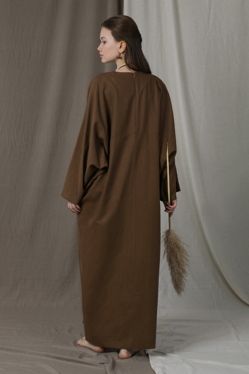 Salaş Keten Elbise Kahverengi. Düşük omuzlu. Yarasa kol detaylıdır. Arkadan gizli fermuarlıdır. Önden torba ceplidir. Günlük kullanım ve özel günlerinizde tercih edebilirsiniz.