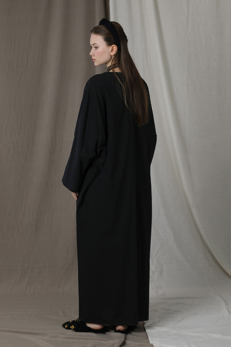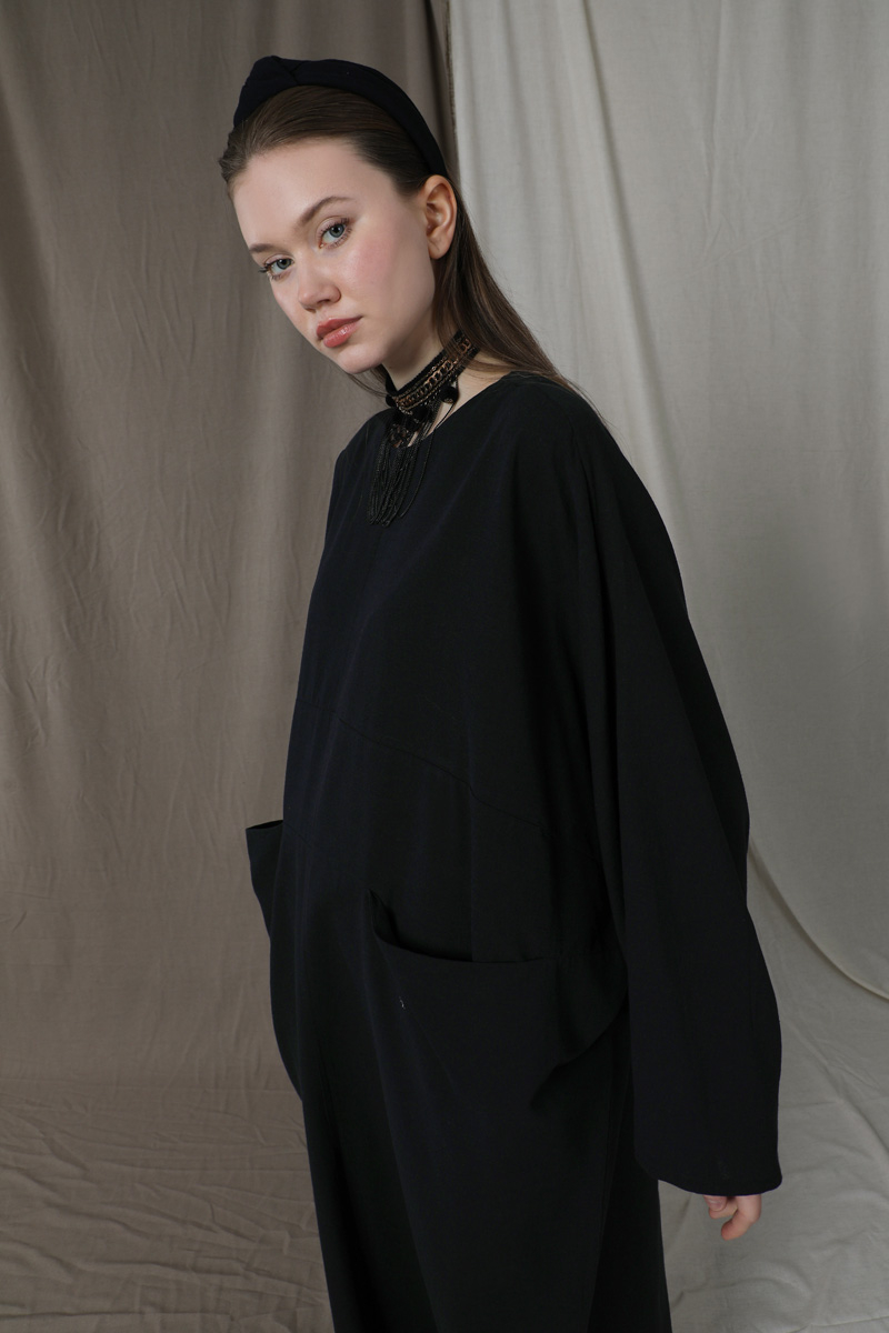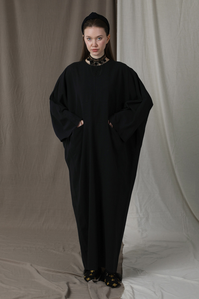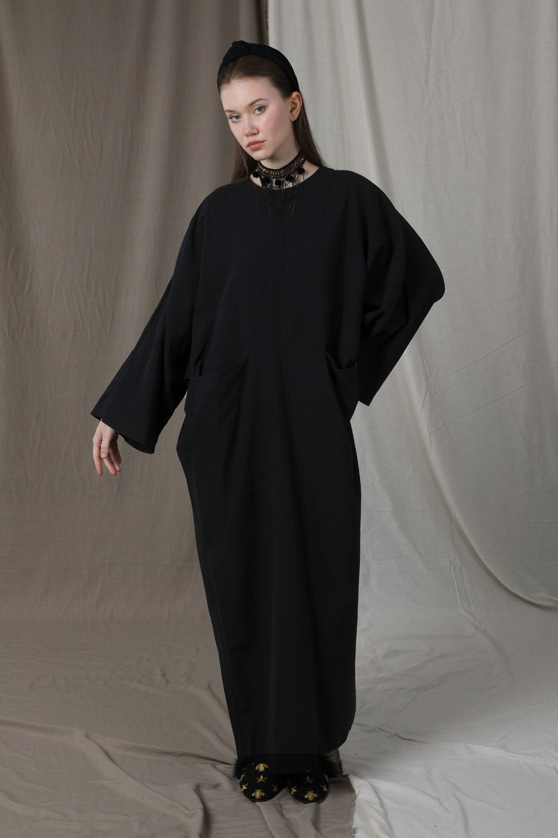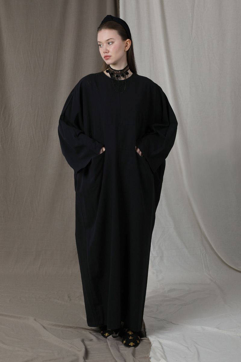 Salaş Keten Elbise Siyah. Düşük omuzlu. Yarasa kol detaylıdır. Arkadan gizli fermuarlıdır. Önden torba ceplidir. Günlük kullanım ve özel günlerinizde tercih edebilirsiniz.