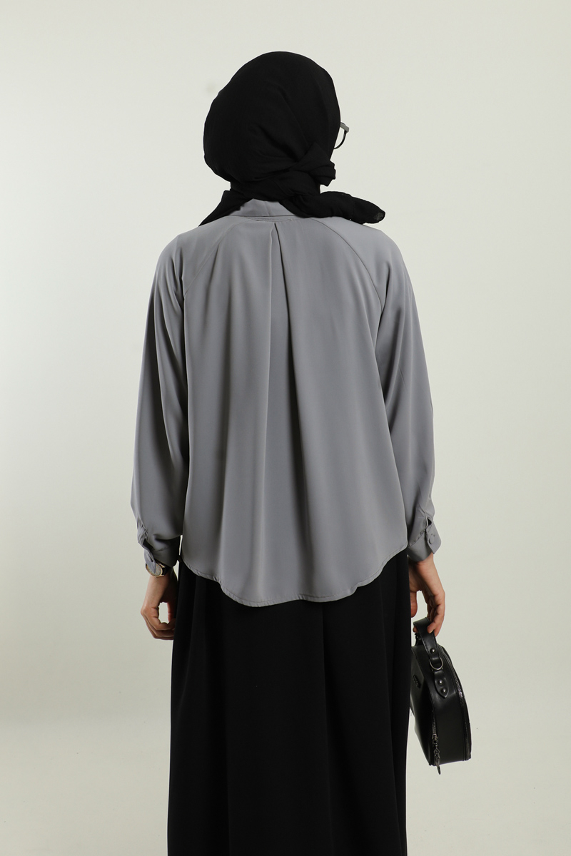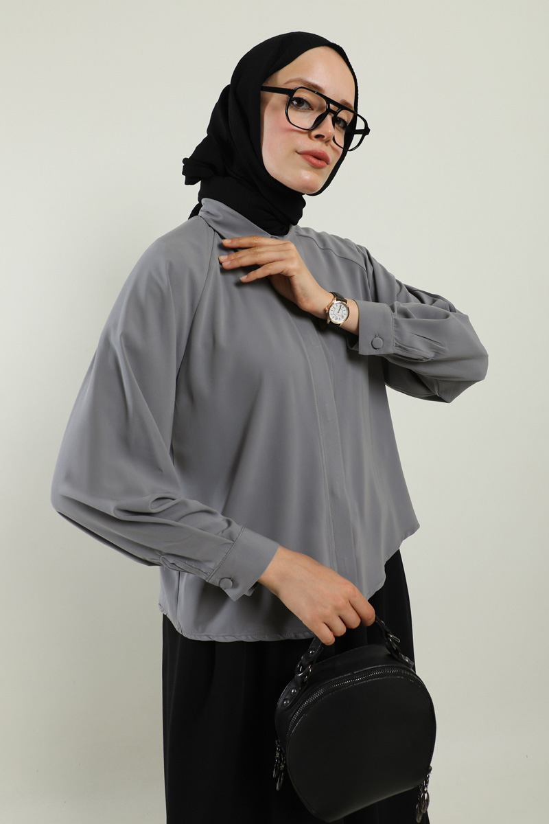 Kısa Gömlek Gri. Gömlek yakalıdır, gizli düğmelidir, arkada a pilesi vardır, etek ve pantolon üstü kombinlerinizde tercih edebilirsiniz.