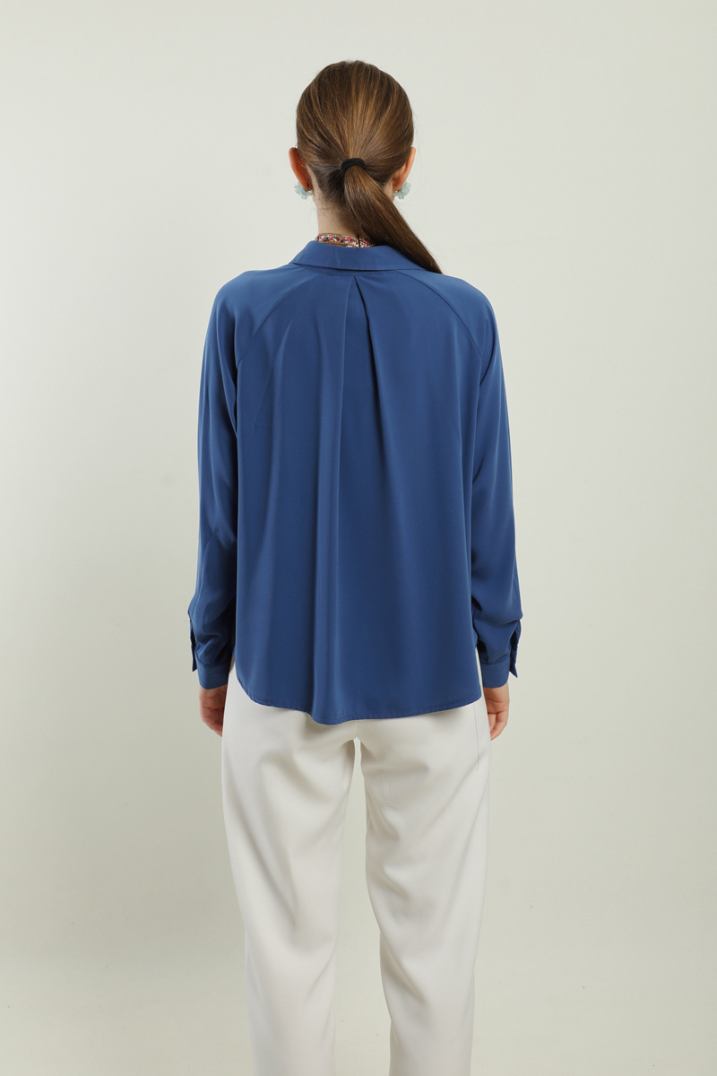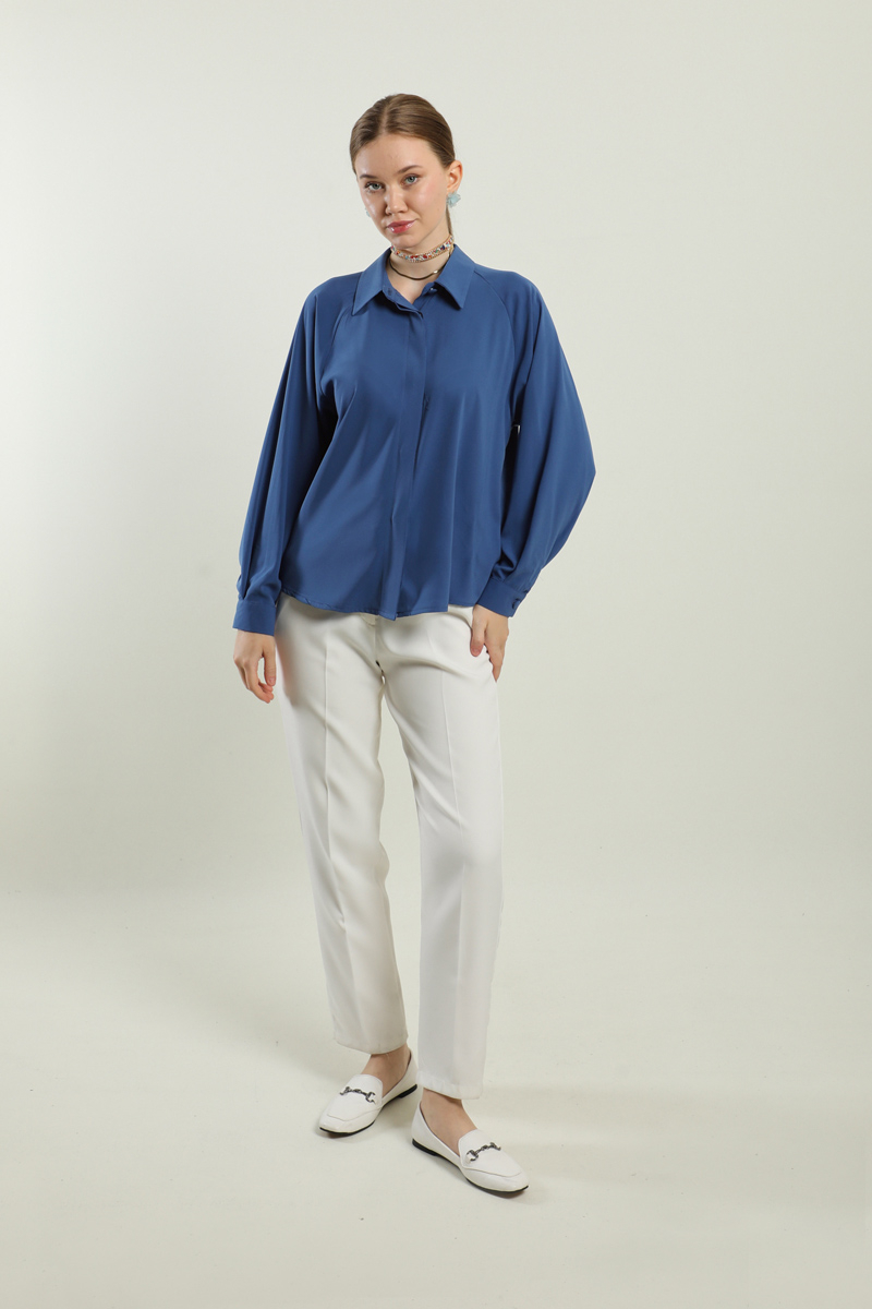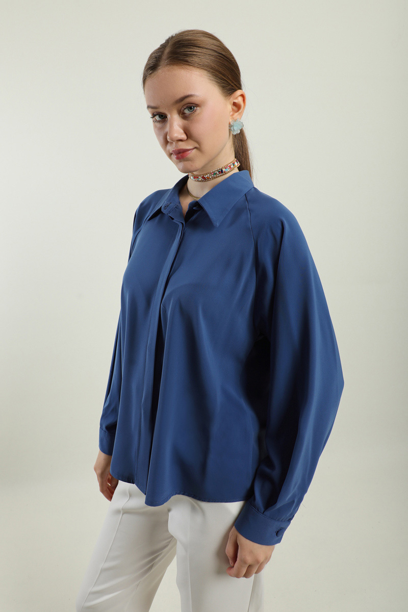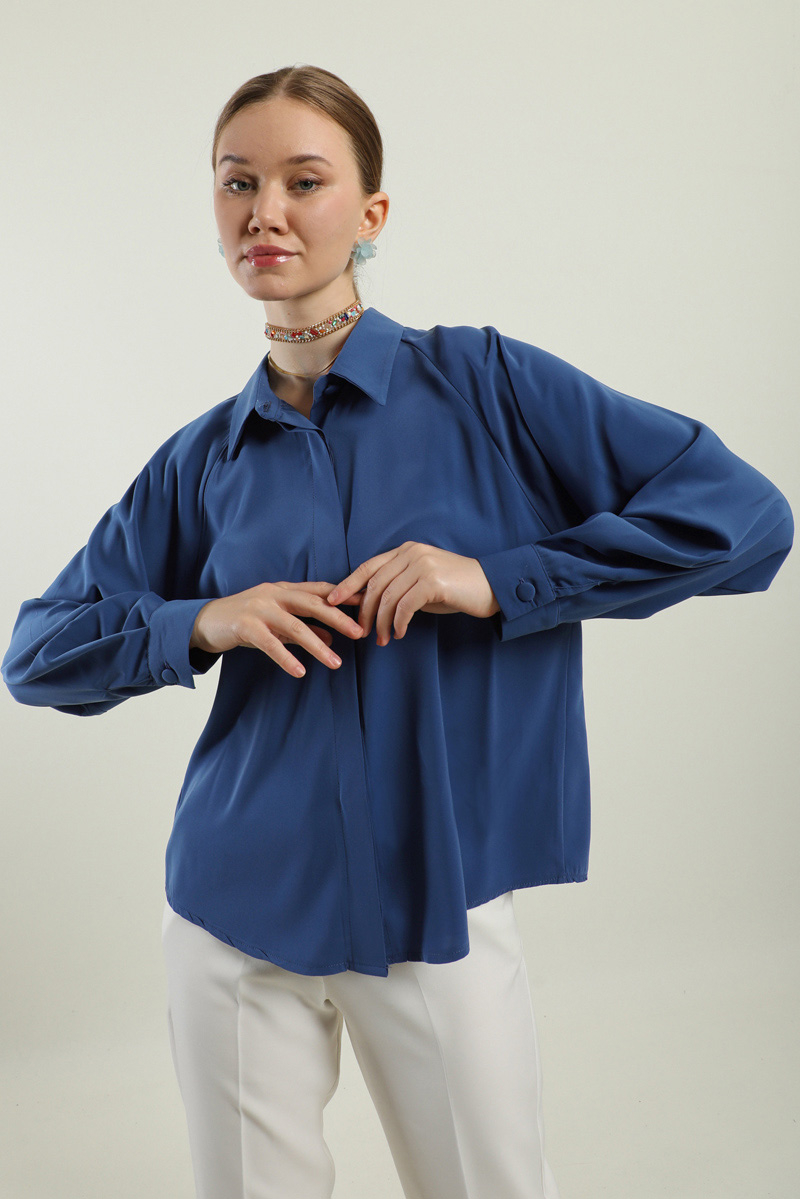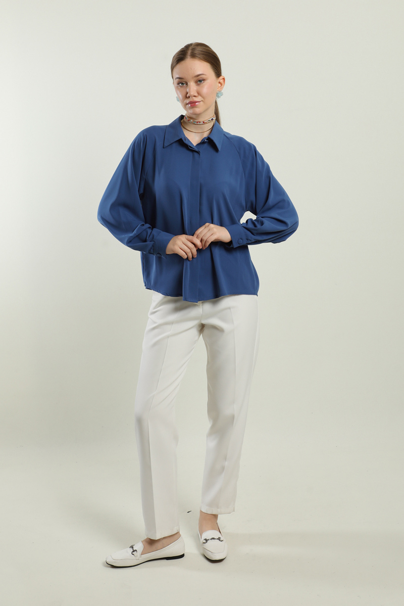 Kısa Gömlek İndigo. Gömlek yakalıdır, gizli düğmelidir, arkada a pilesi vardır,etek ve pantolon üstü kombinlerinizde tercih edebilirsiniz.