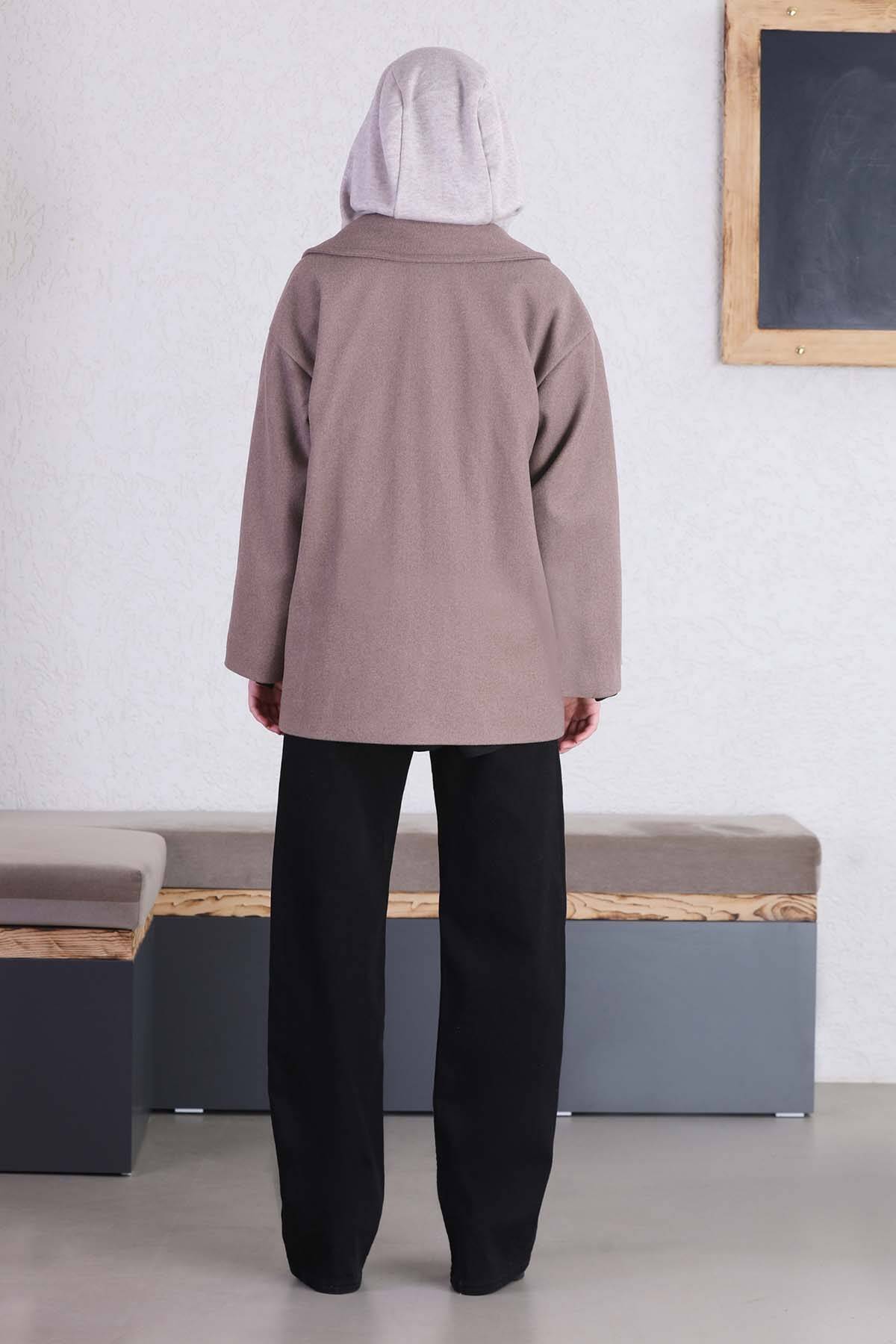 Kısa Kaşe Kaban Koyu Vizon. Geniş ingiliz yaka. Astarlıdır. Yandan iki cebi bulunmaktadır. Kruvaze metal rengi düğmelidir.