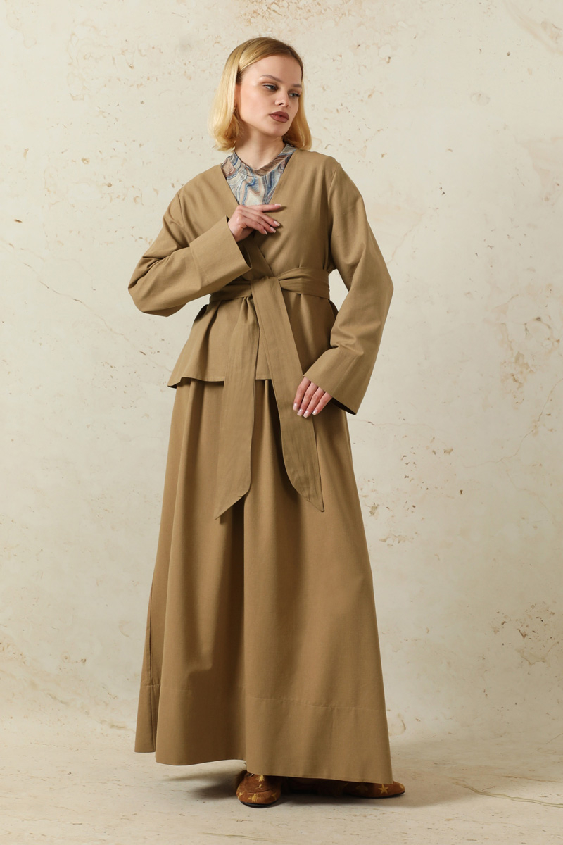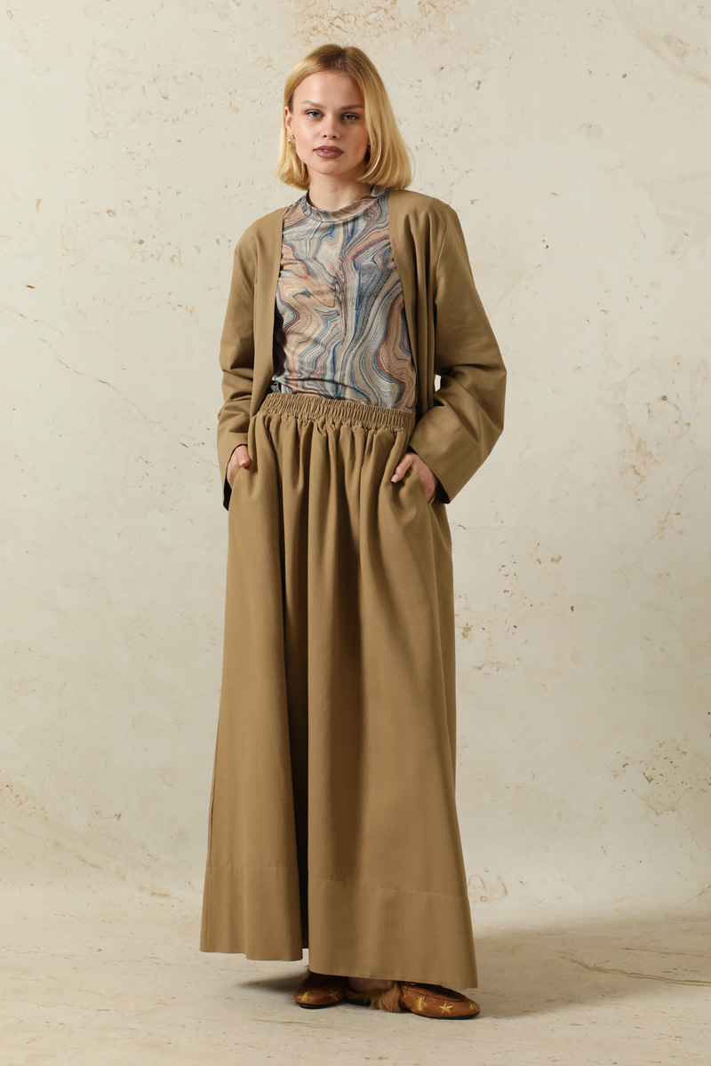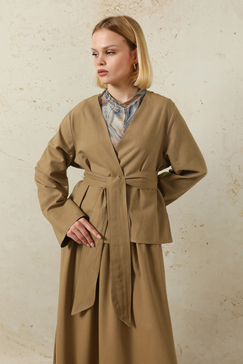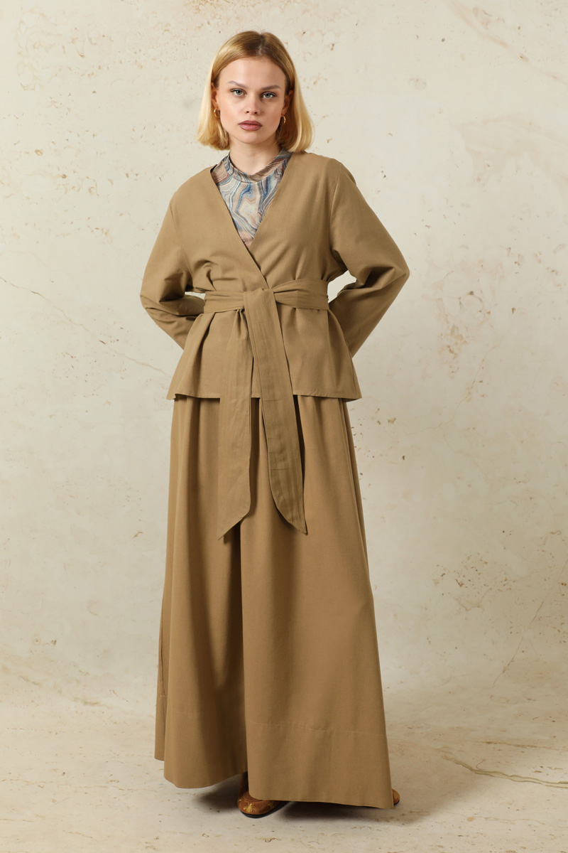 Kimonolu Etek Takım Camel. Kol ve etek ucu geniş dikiş detaylıdır. Etek Beli lastiklidir. Etek yan ceplidir. Geniş kuşaklıdır. Günlük kullanım ve özel günlerinizde tercih edebilirsiniz.