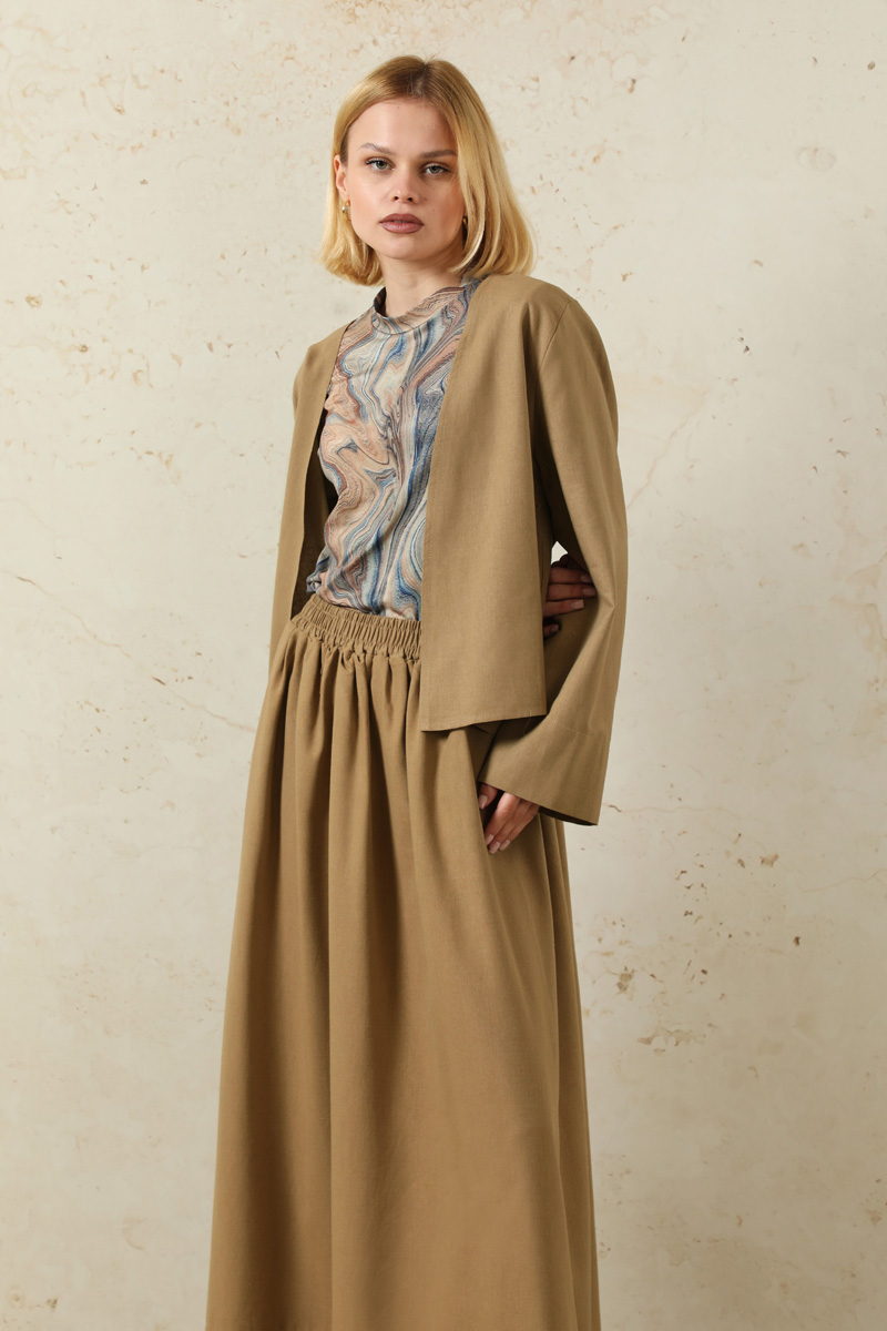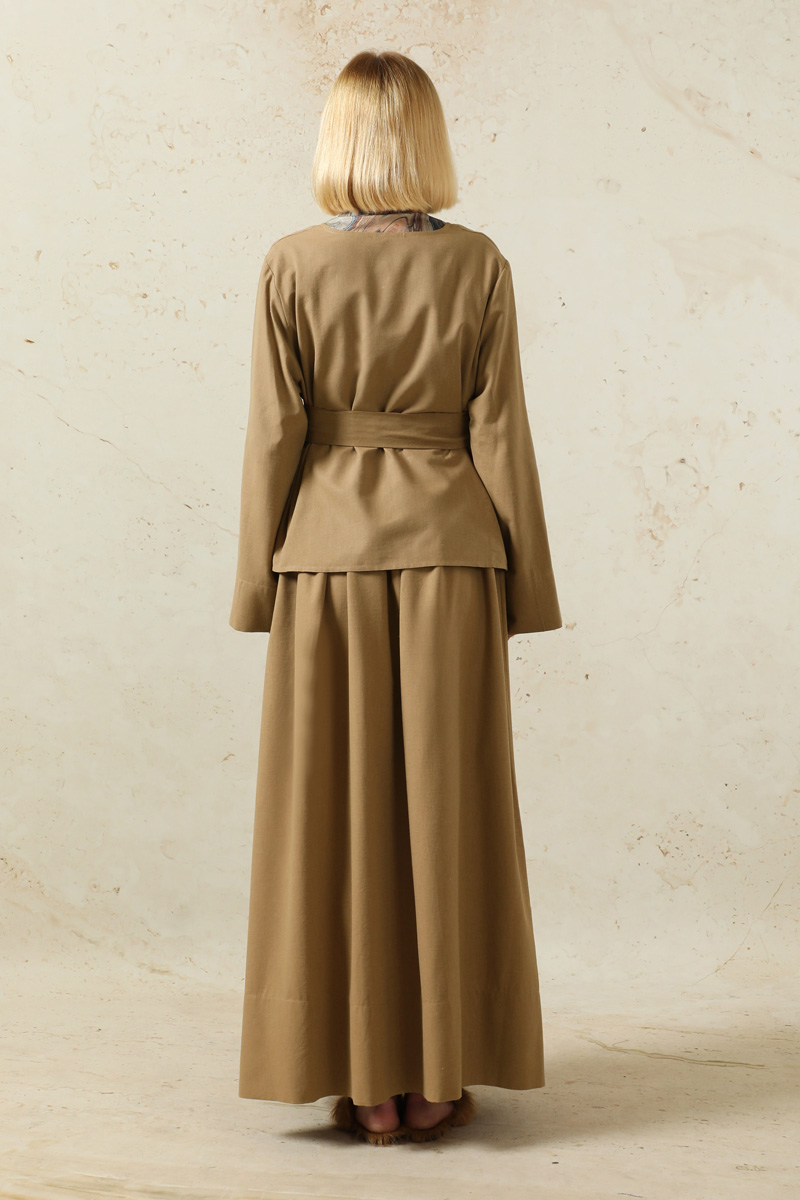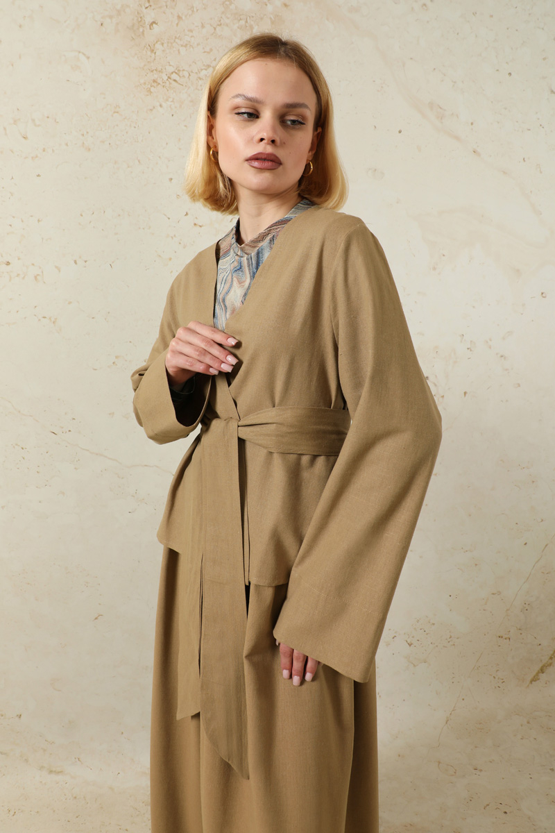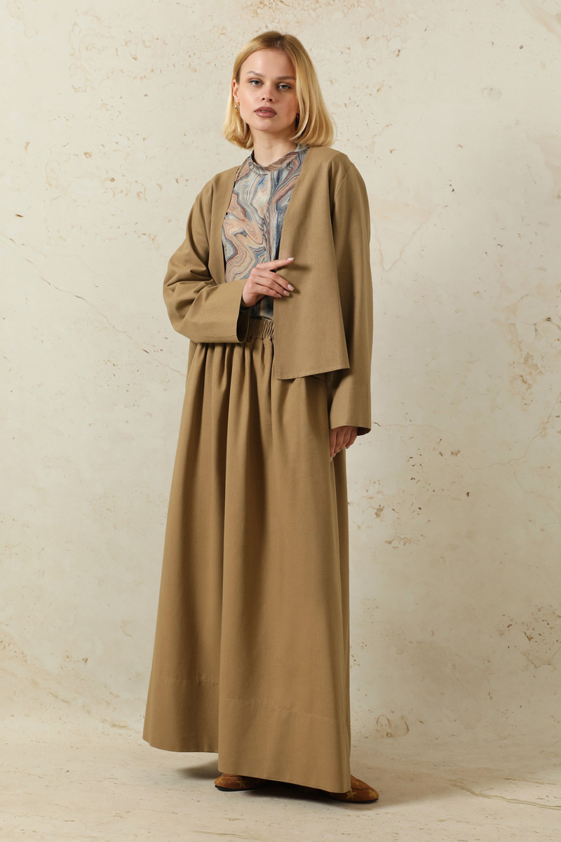 Kimonolu Etek Takım Camel. Kol ve etek ucu geniş dikiş detaylıdır. Etek Beli lastiklidir. Etek yan ceplidir. Geniş kuşaklıdır. Günlük kullanım ve özel günlerinizde tercih edebilirsiniz.