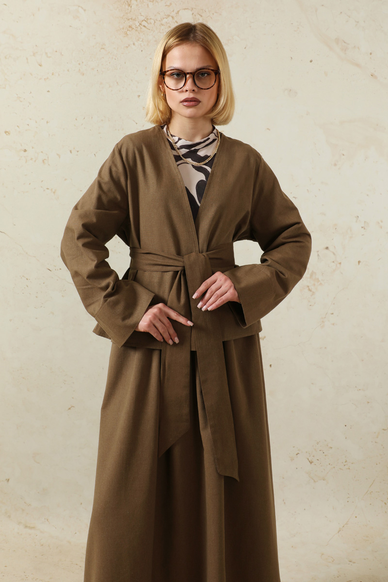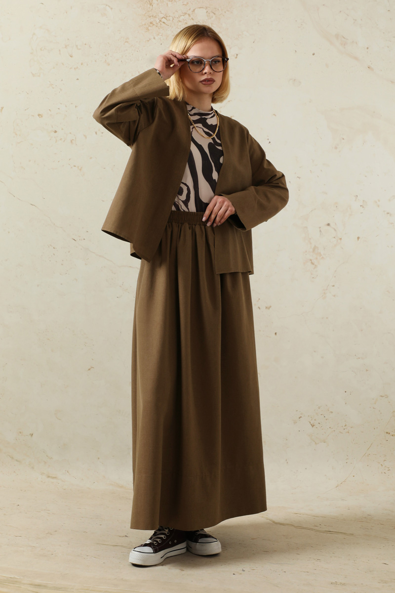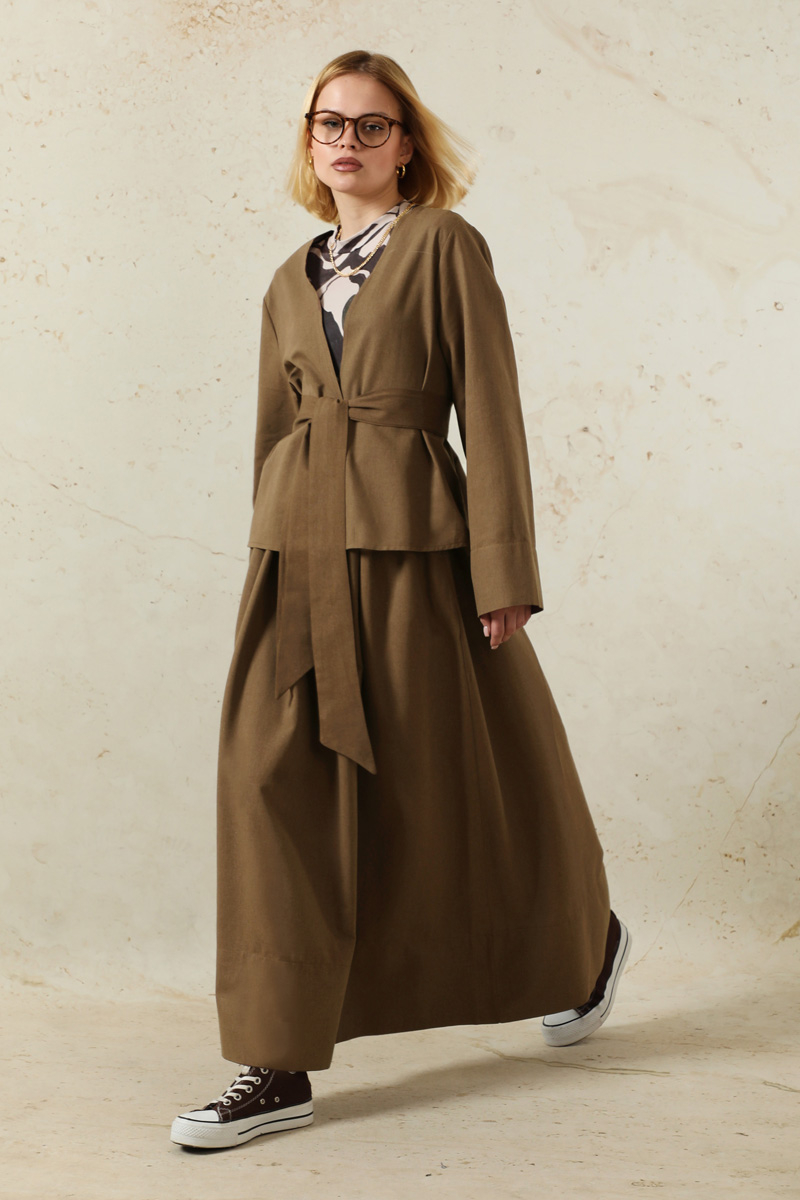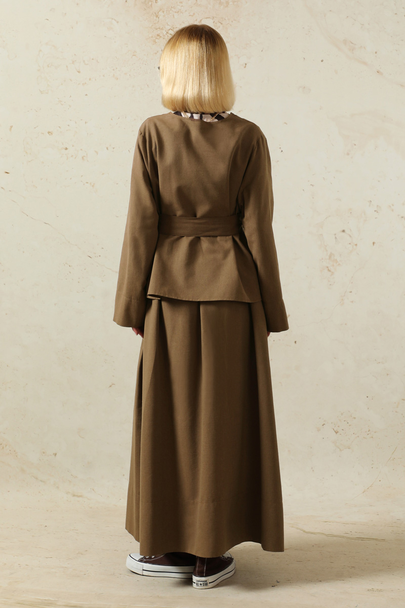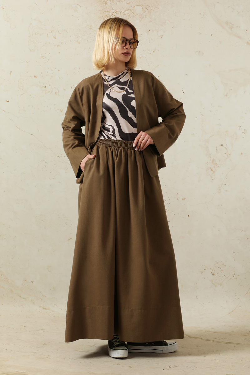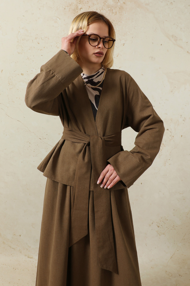 Kimonolu Etek Takım Kahverengi. Kol ve etek ucu geniş dikiş detaylıdır. Etek Beli lastiklidir. Etek yan ceplidir. Geniş kuşaklıdır. Günlük kullanım ve özel günlerinizde tercih edebilirsiniz.
