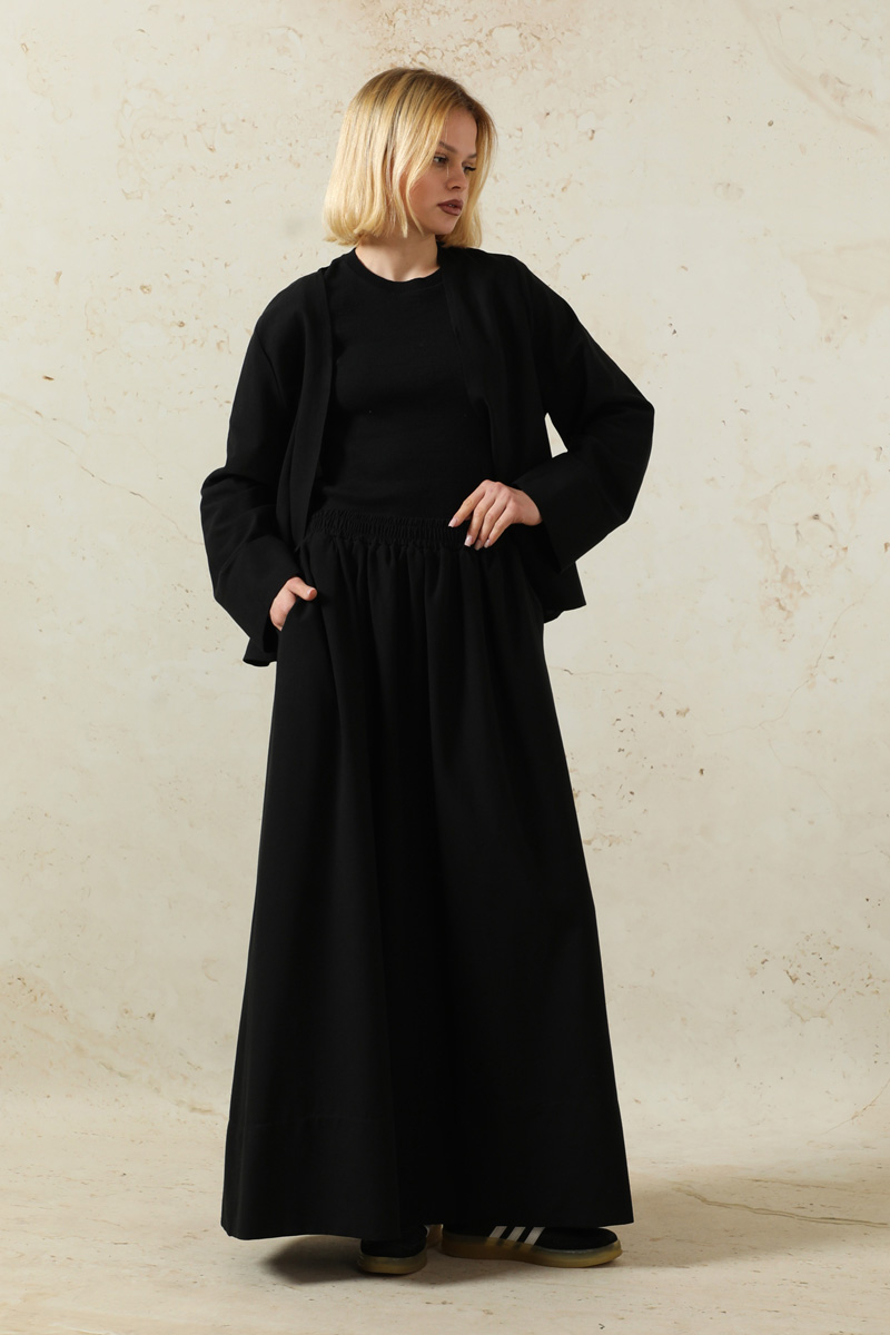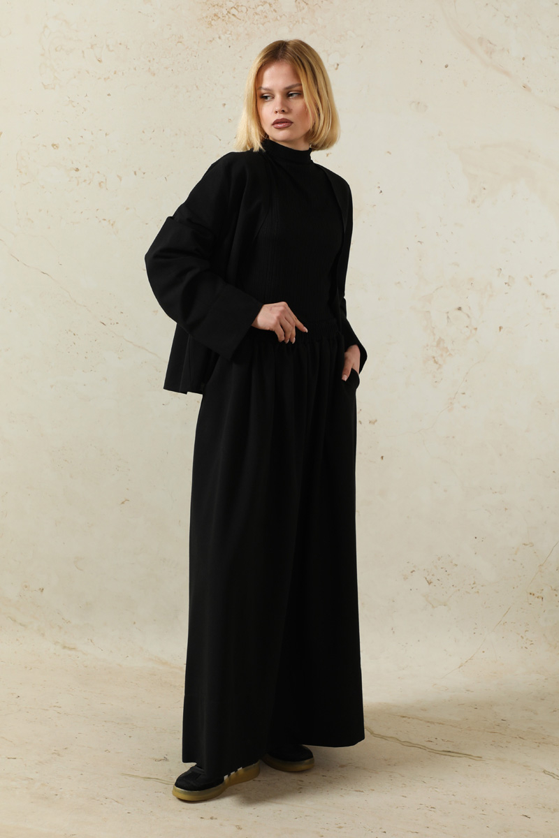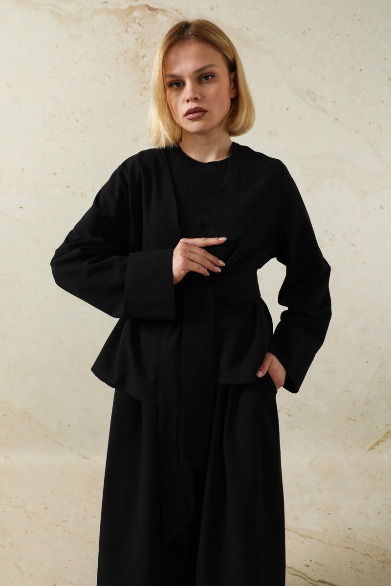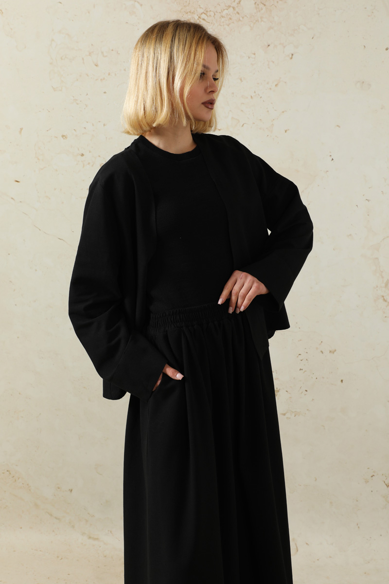 Kimonolu Etek Takım Siyah. Kol ve etek ucu geniş dikiş detaylıdır. Etek Beli lastiklidir. Etek yan ceplidir. Geniş kuşaklıdır. Günlük kullanım ve özel günlerinizde tercih edebilirsiniz.