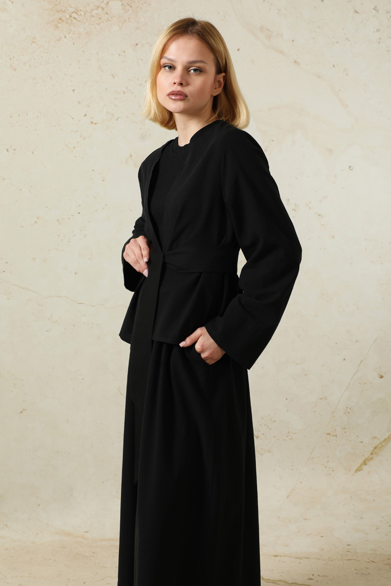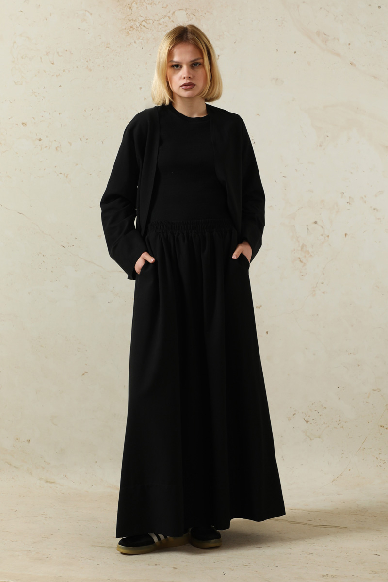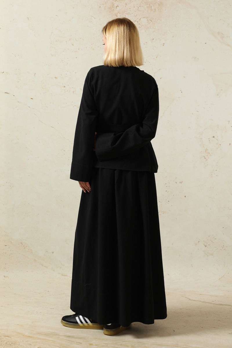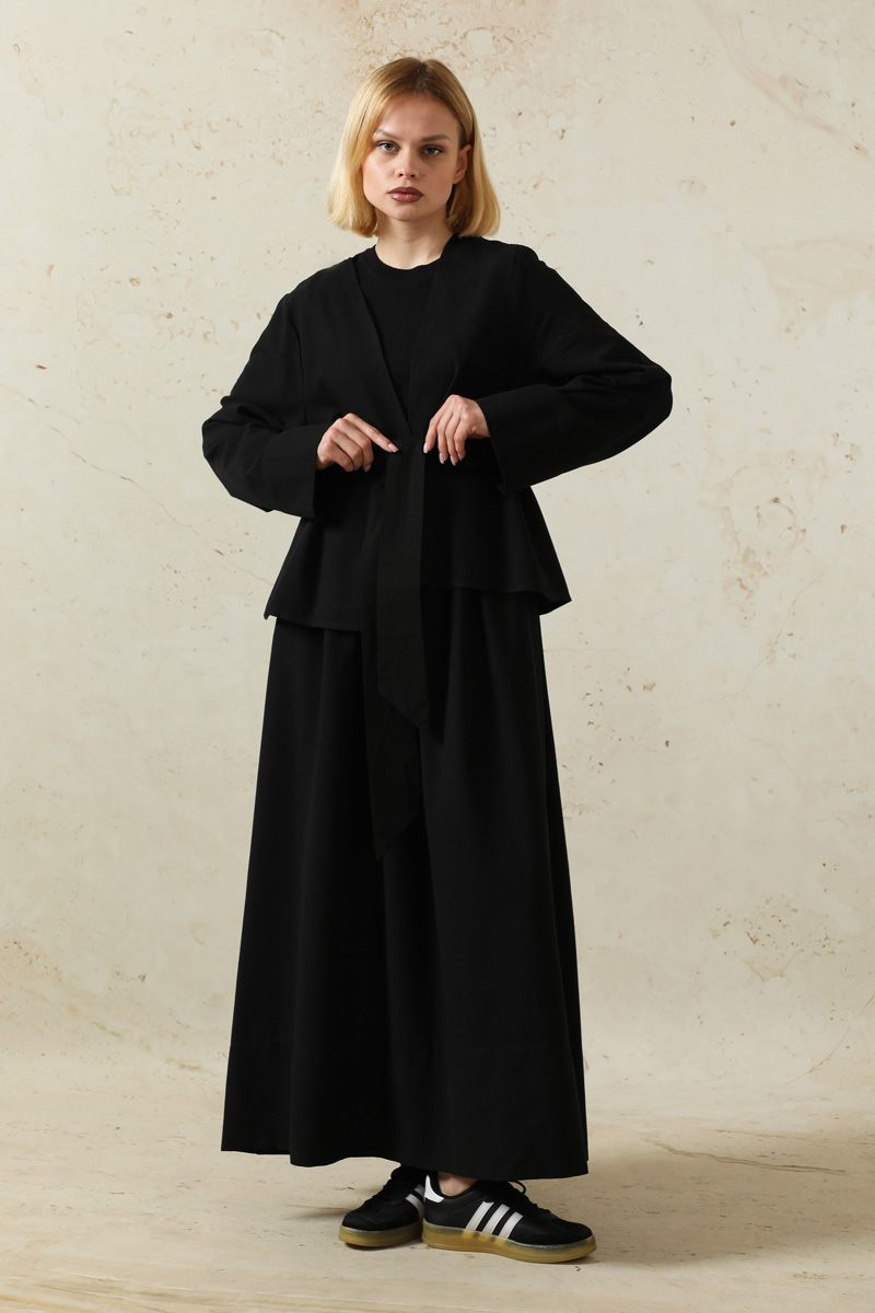 Kimonolu Etek Takım Siyah. Kol ve etek ucu geniş dikiş detaylıdır. Etek Beli lastiklidir. Etek yan ceplidir. Geniş kuşaklıdır. Günlük kullanım ve özel günlerinizde tercih edebilirsiniz.