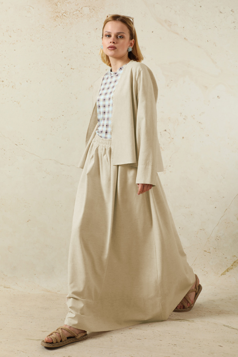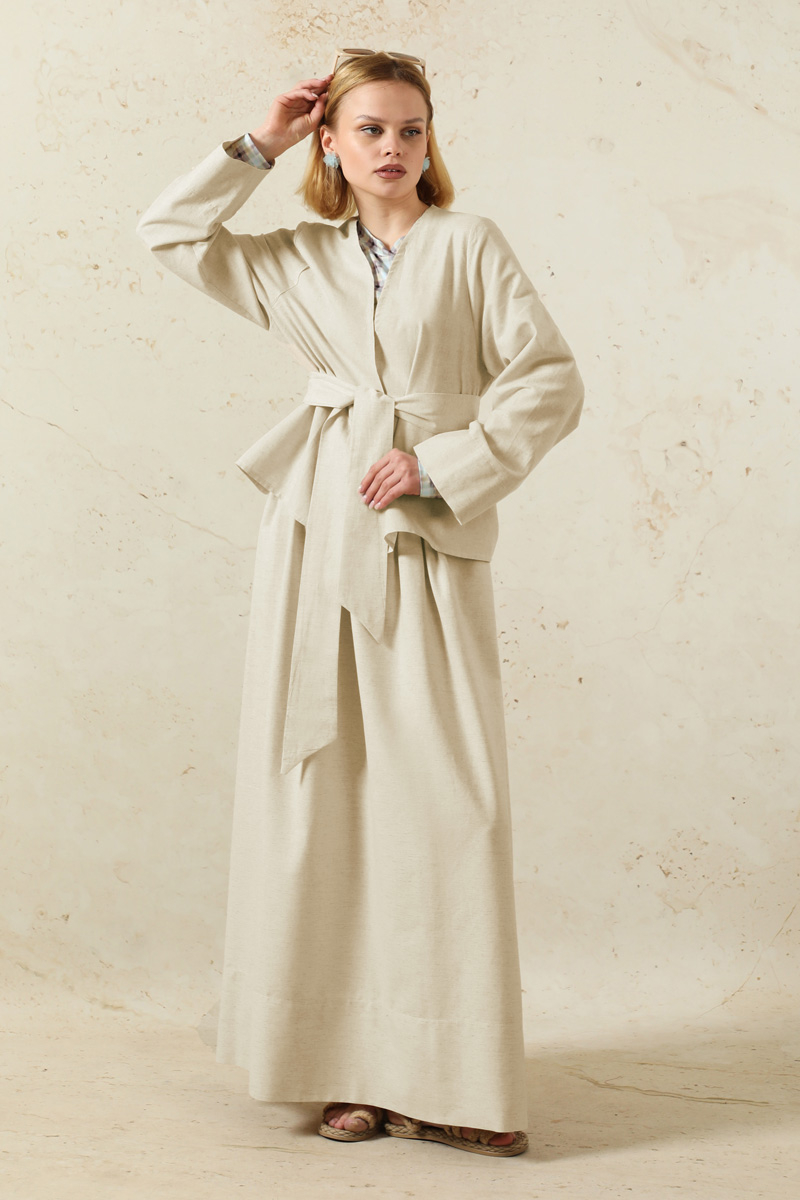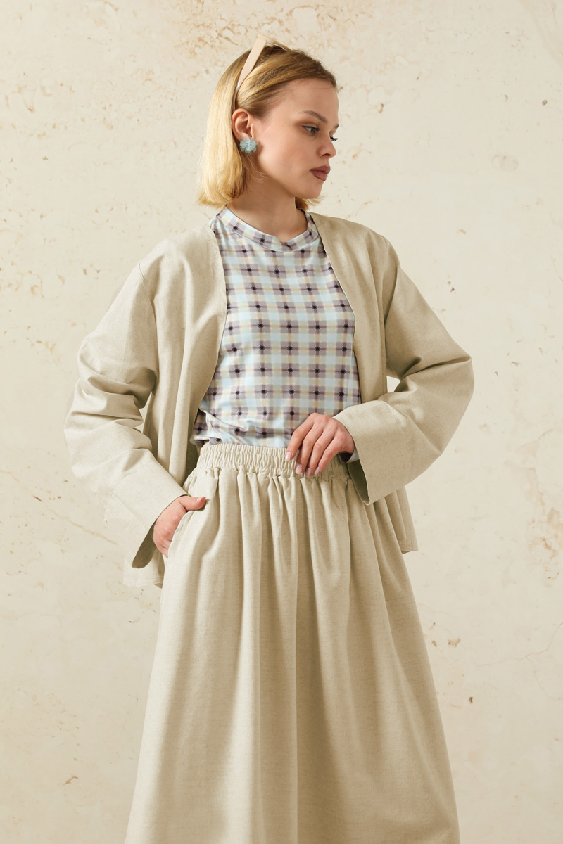 Kimonolu Etek Takım Taş. Kol ve etek ucu geniş dikiş detaylıdır. Etek Beli lastiklidir. Etek yan ceplidir. Geniş kuşaklıdır. Günlük kullanım ve özel günlerinizde tercih edebilirsiniz.