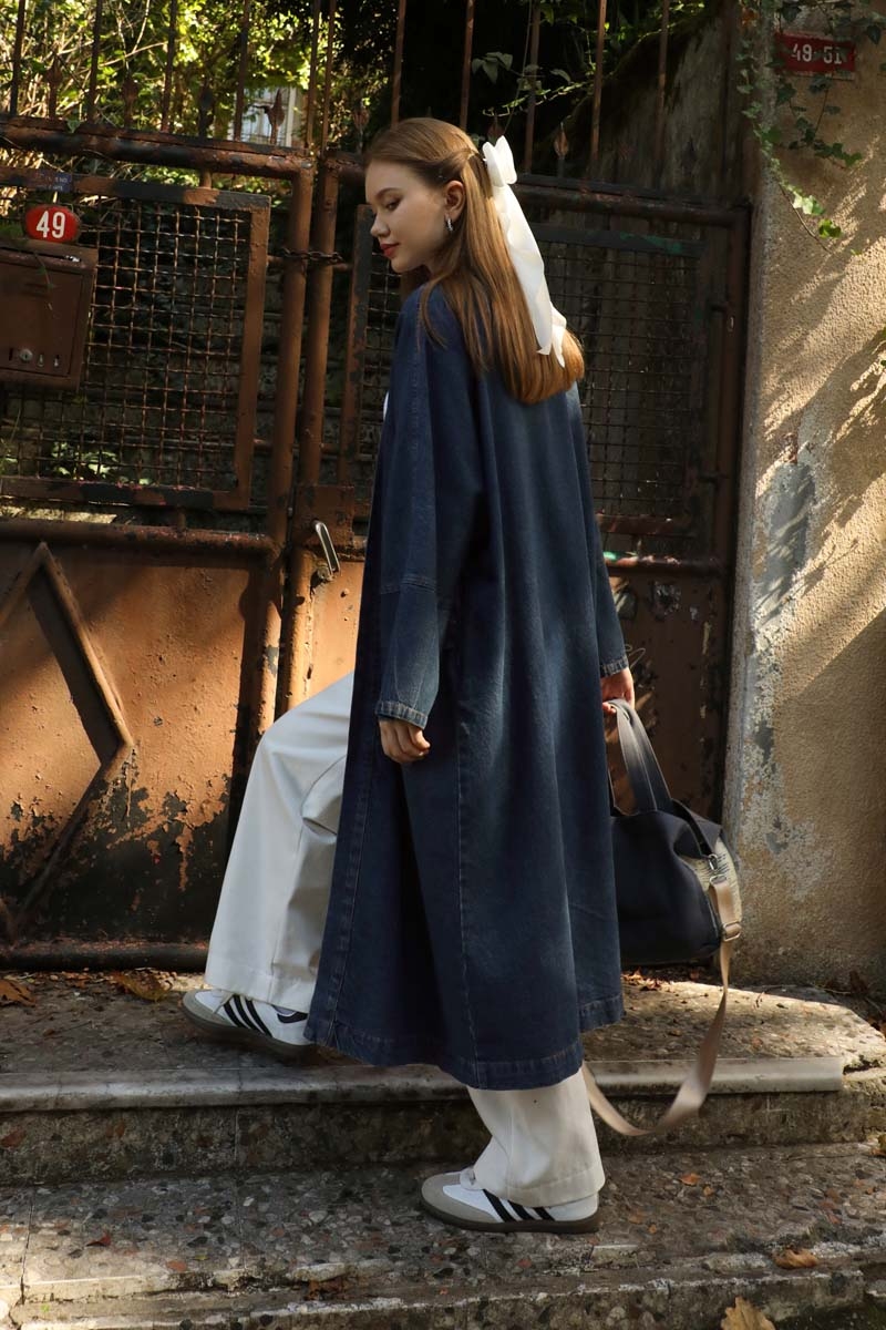 Klasik Denim Kap Koyu Mavi, kolda parça detayldır, yandan gizli ceplidir, önden süs cep kapaklıdır, bol kalıptır, düğmesizdir, kuşaksızdır, Günlük kullanım ve özel günlerinizde tercih edebilirsiniz.