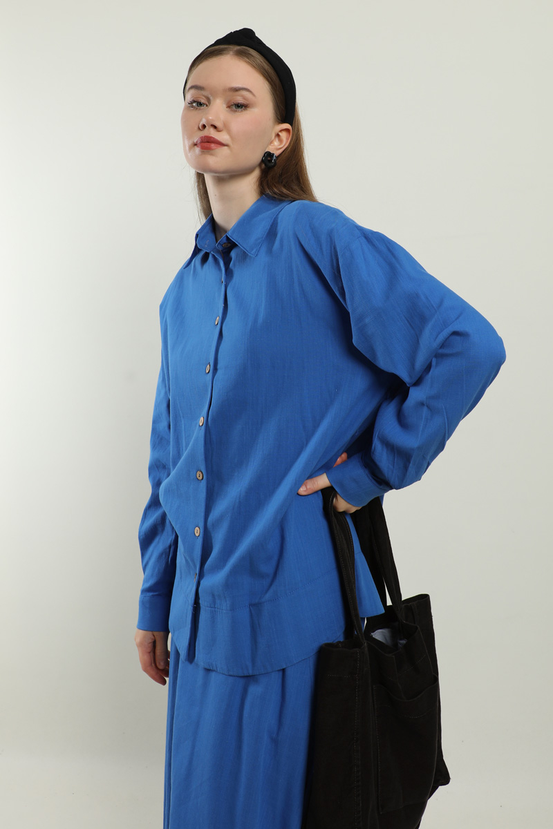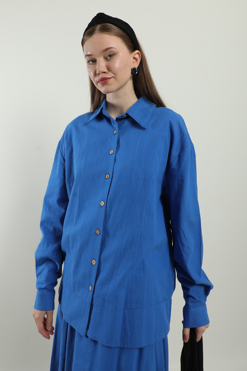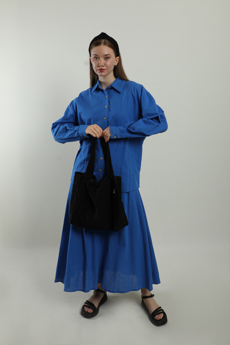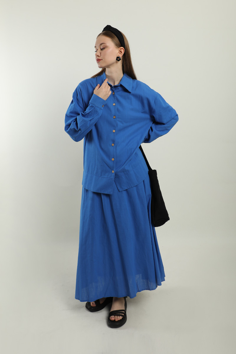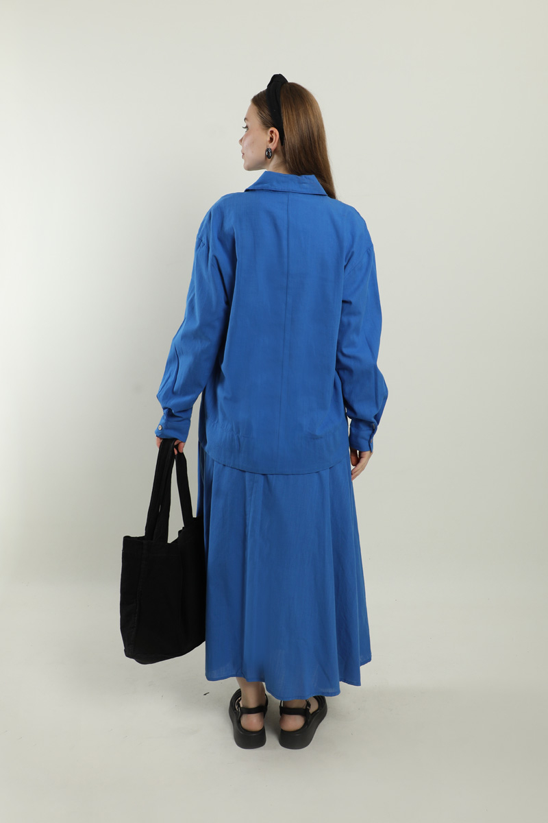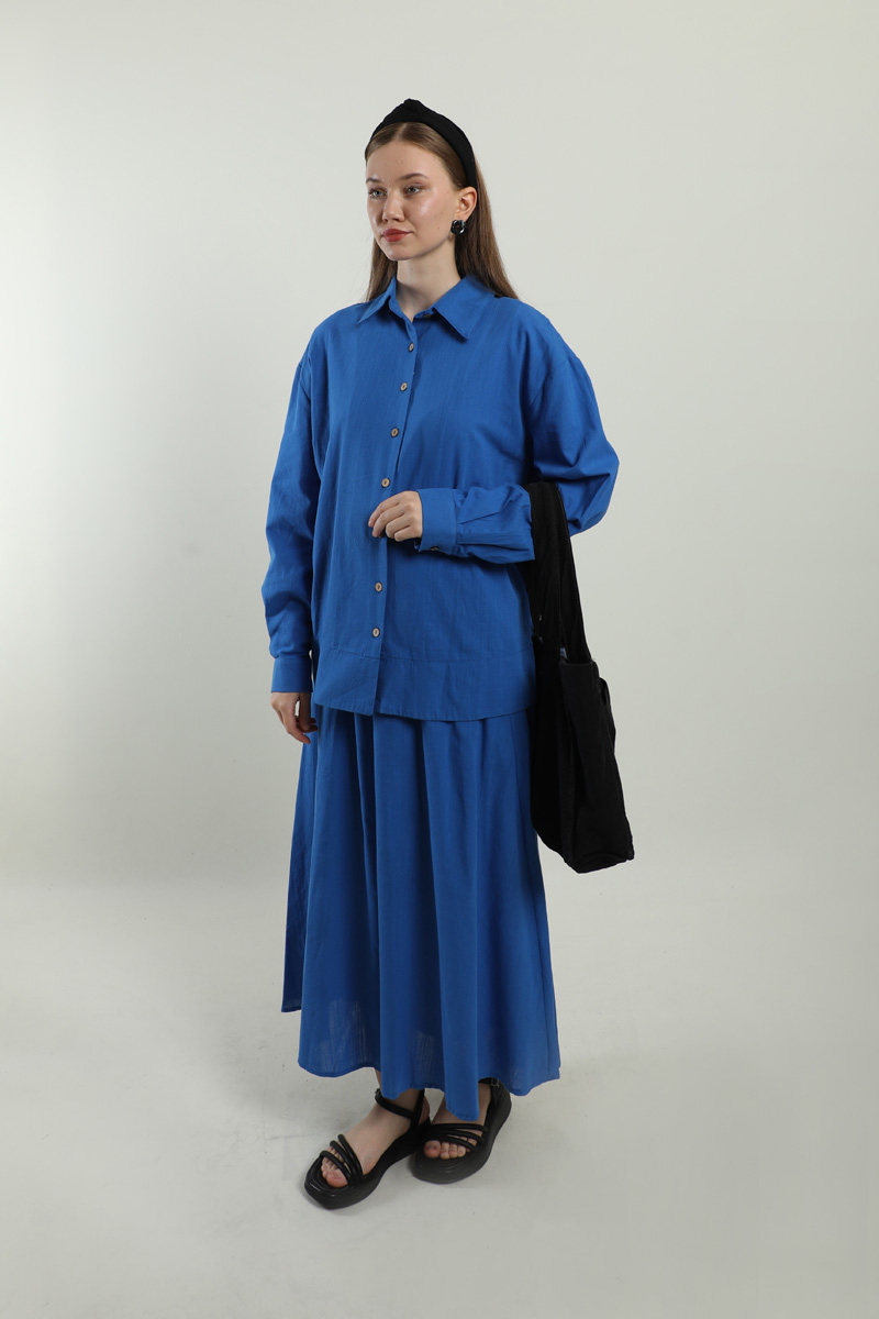 Klasik Keten Etek Takım Saks Mavisi. Gömlek yakalıdır, düşük omuzludur, tahta düğmelidir, eteği yandan ceplidir, beli lastiklidir, astarlıdır, yaz mevsimi için uygundur.