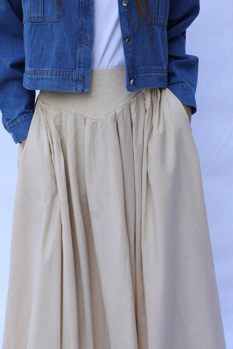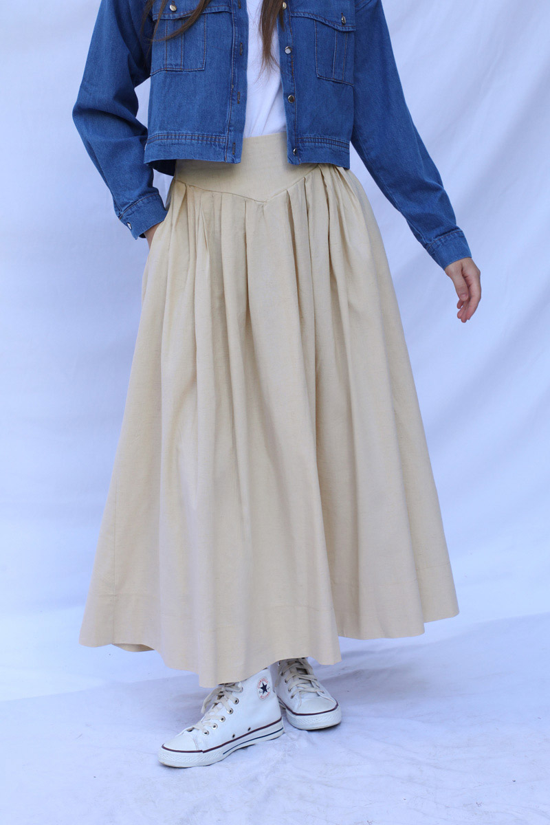 Kloş Keten Etek Taş. Kemer kısmı kalın olup V detaylıdır, belden geniş pilelidir,