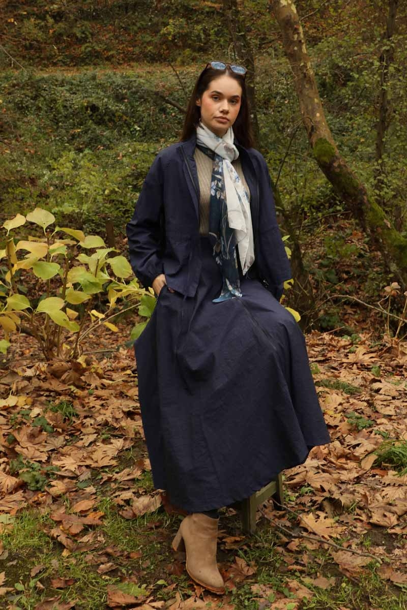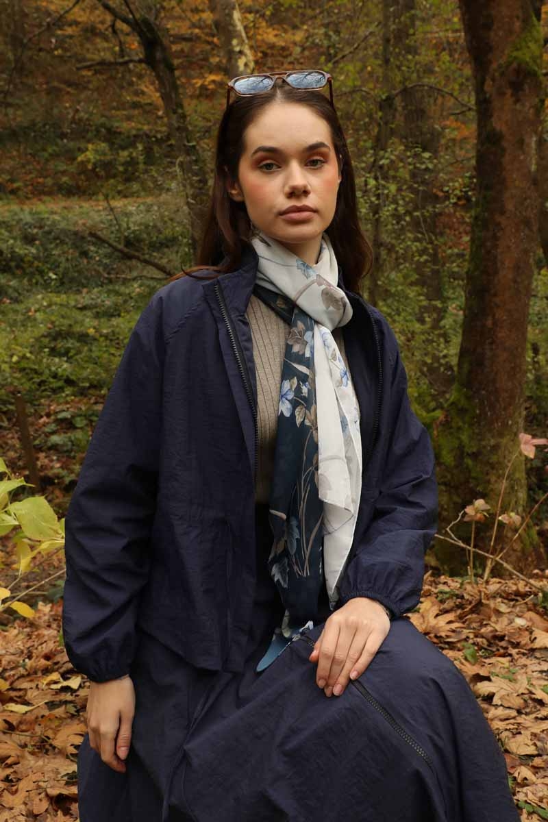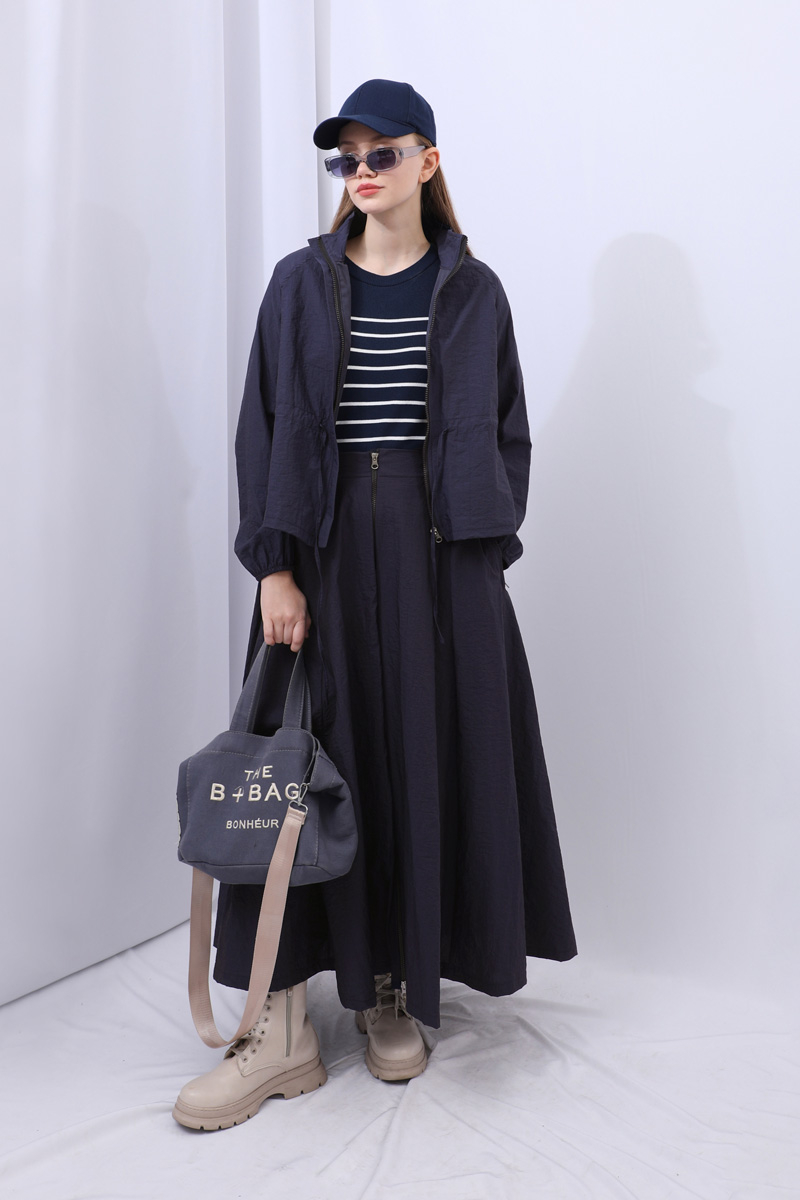 Kloş Paraşüt Etek Takım Lacivert. Dik yakadır, reglan kolludur, belden büzgü biye detaylıdır, manşeti geniş lastiklidir, cepsizdir, astarlıdır. Etek arka belden lastiklidir, önden çift taraflı fermuarlıdır, yandan ceplidir, astarlıdır, kloş kalıptır. Günlük kullanım ve özel günlerinizde tercih edebilirsiniz.