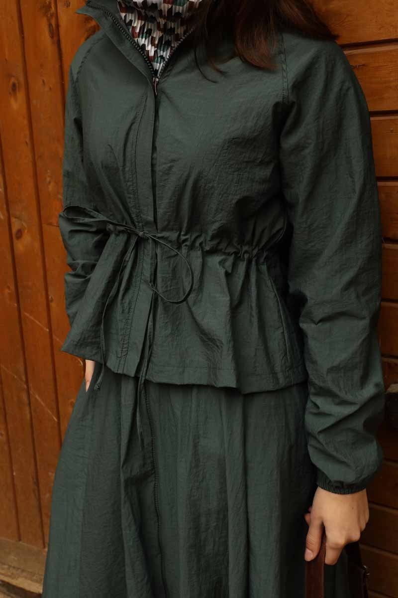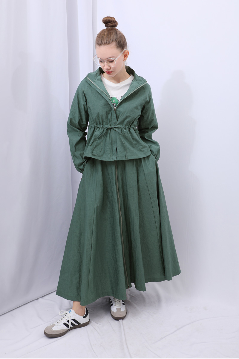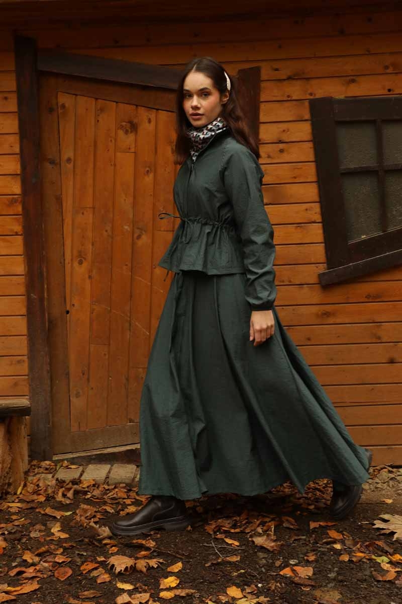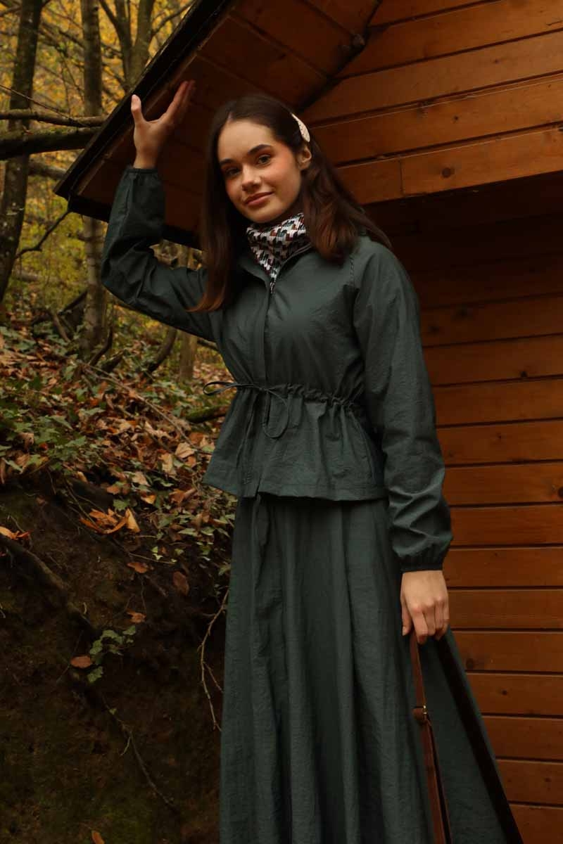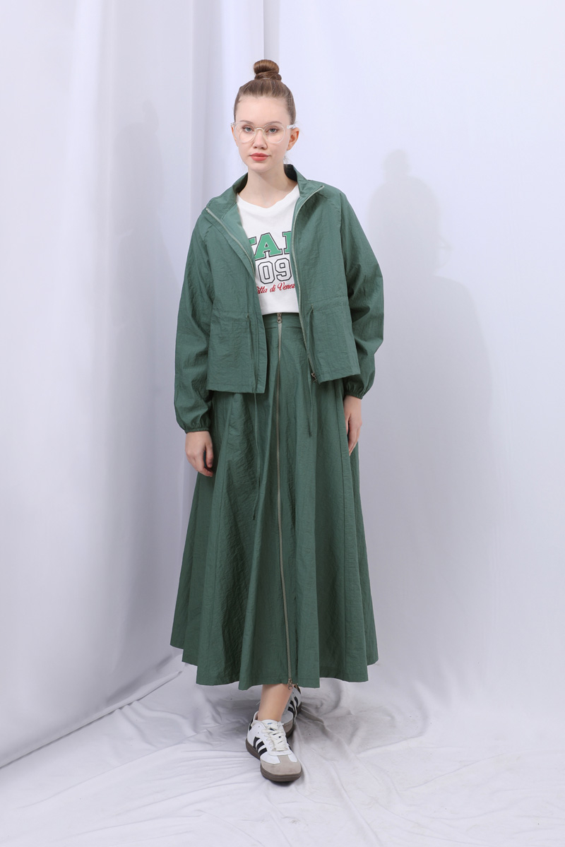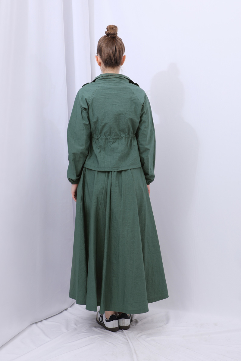 Kloş Paraşüt Etek Takım Zümrüt. Dik yakadır, reglan kolludur, belden büzgü biye detaylıdır, manşeti geniş lastiklidir, cepsizdir, astarlıdır. Etek arka belden lastiklidir, önden çift taraflı fermuarlıdır, yandan ceplidir, astarlıdır, kloş kalıptır. Günlük kullanım ve özel günlerinizde tercih edebilirsiniz.