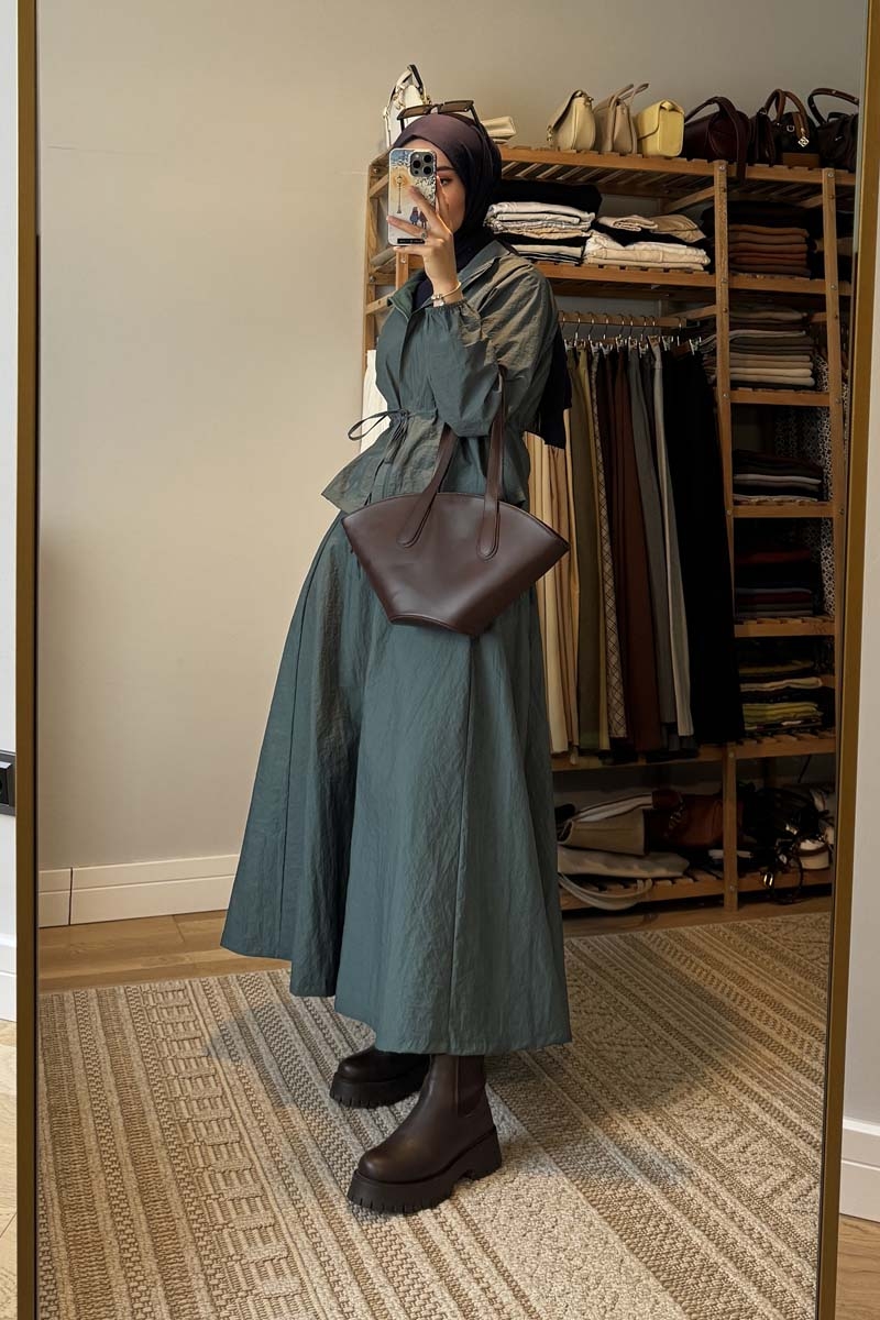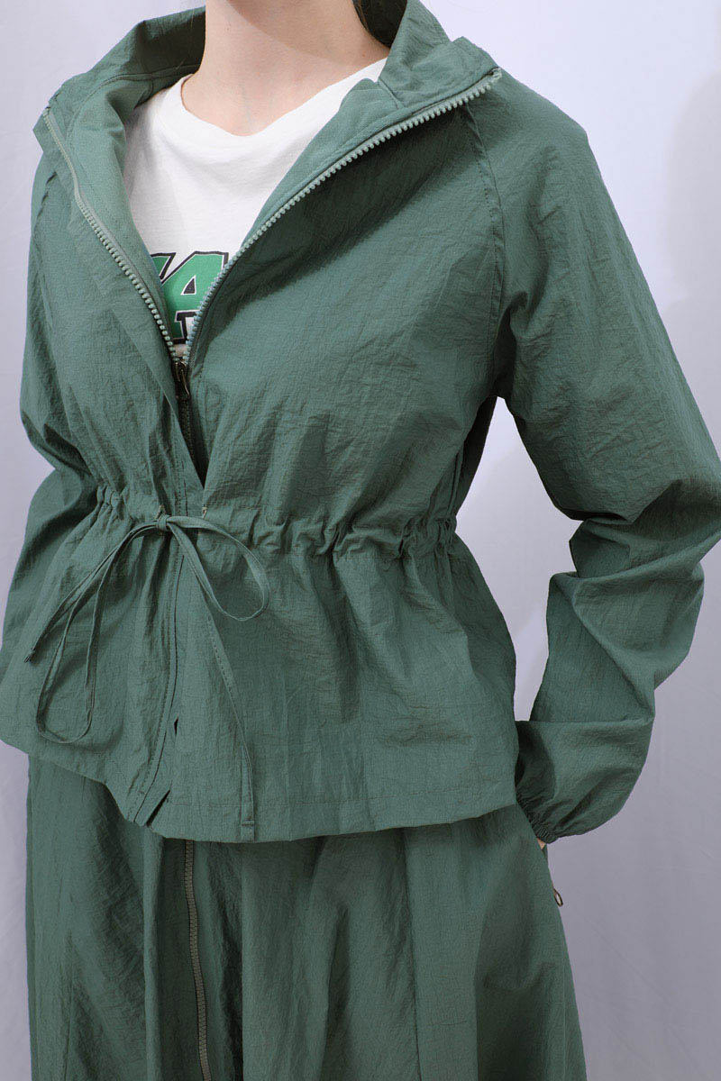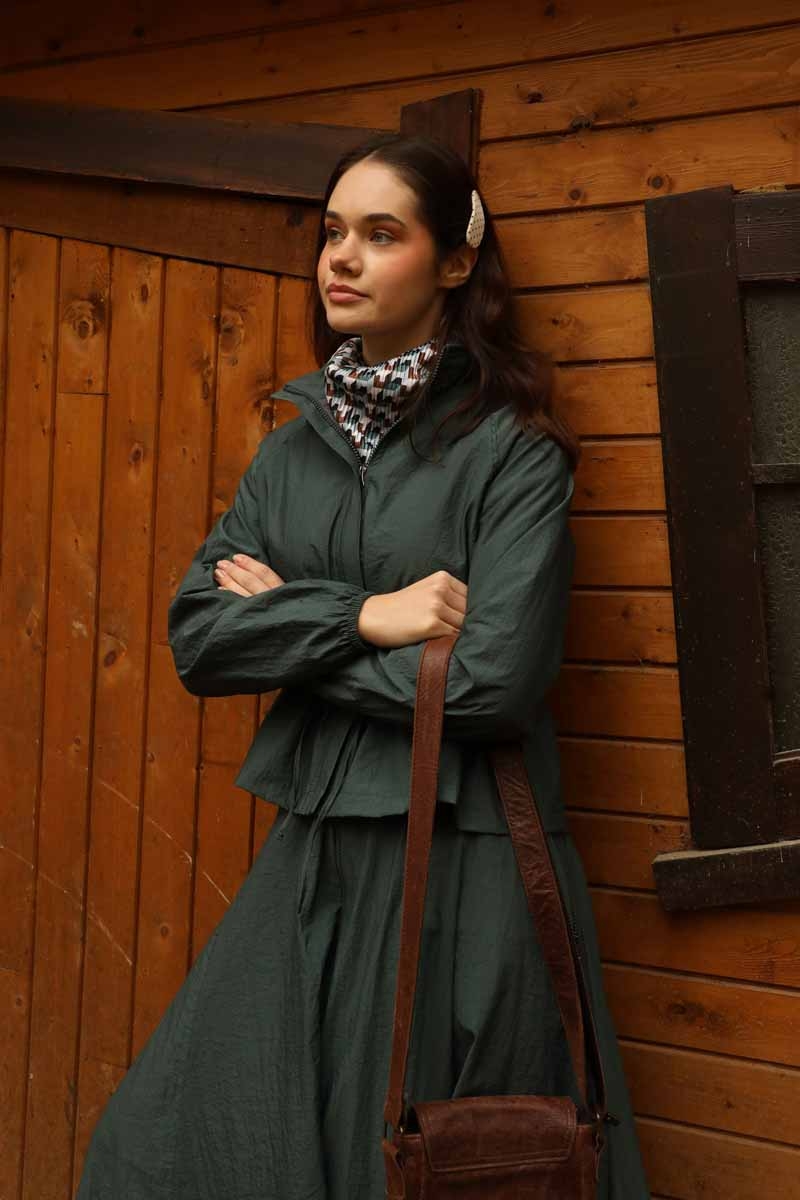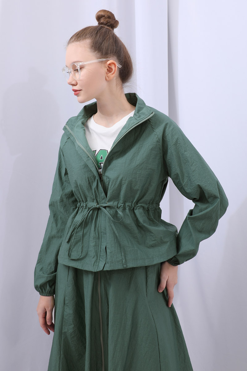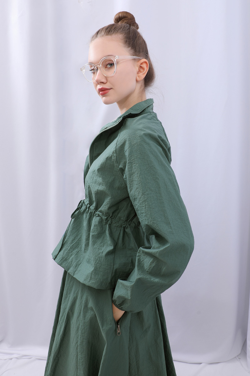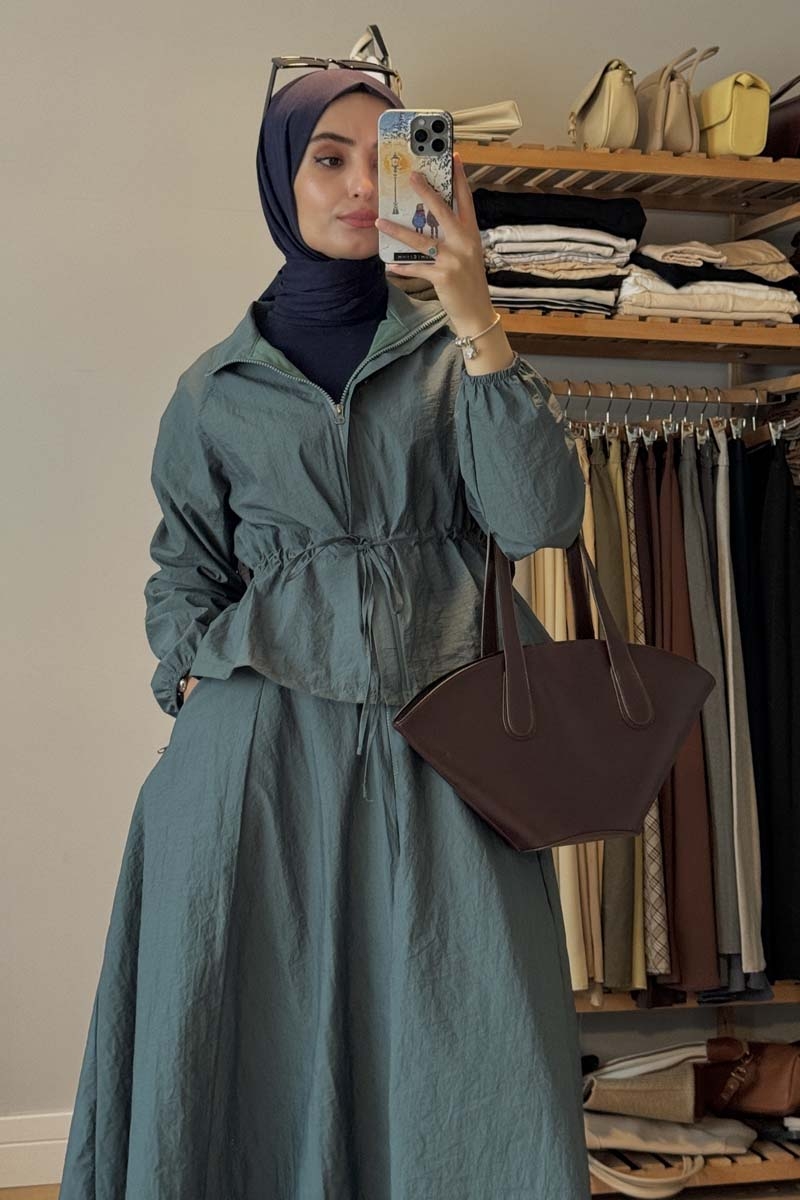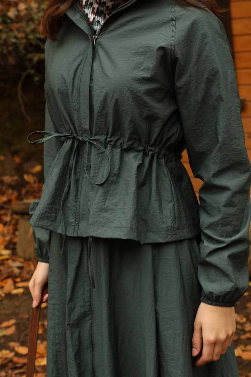 Kloş Paraşüt Etek Takım Zümrüt. Dik yakadır, reglan kolludur, belden büzgü biye detaylıdır, manşeti geniş lastiklidir, cepsizdir, astarlıdır. Etek arka belden lastiklidir, önden çift taraflı fermuarlıdır, yandan ceplidir, astarlıdır, kloş kalıptır. Günlük kullanım ve özel günlerinizde tercih edebilirsiniz.