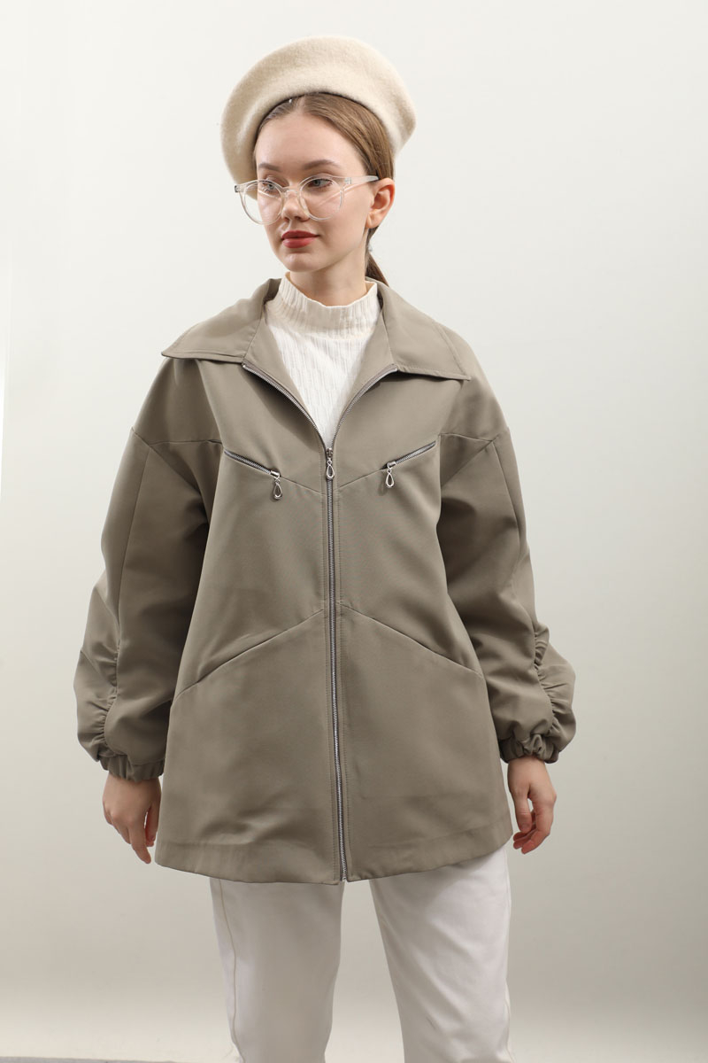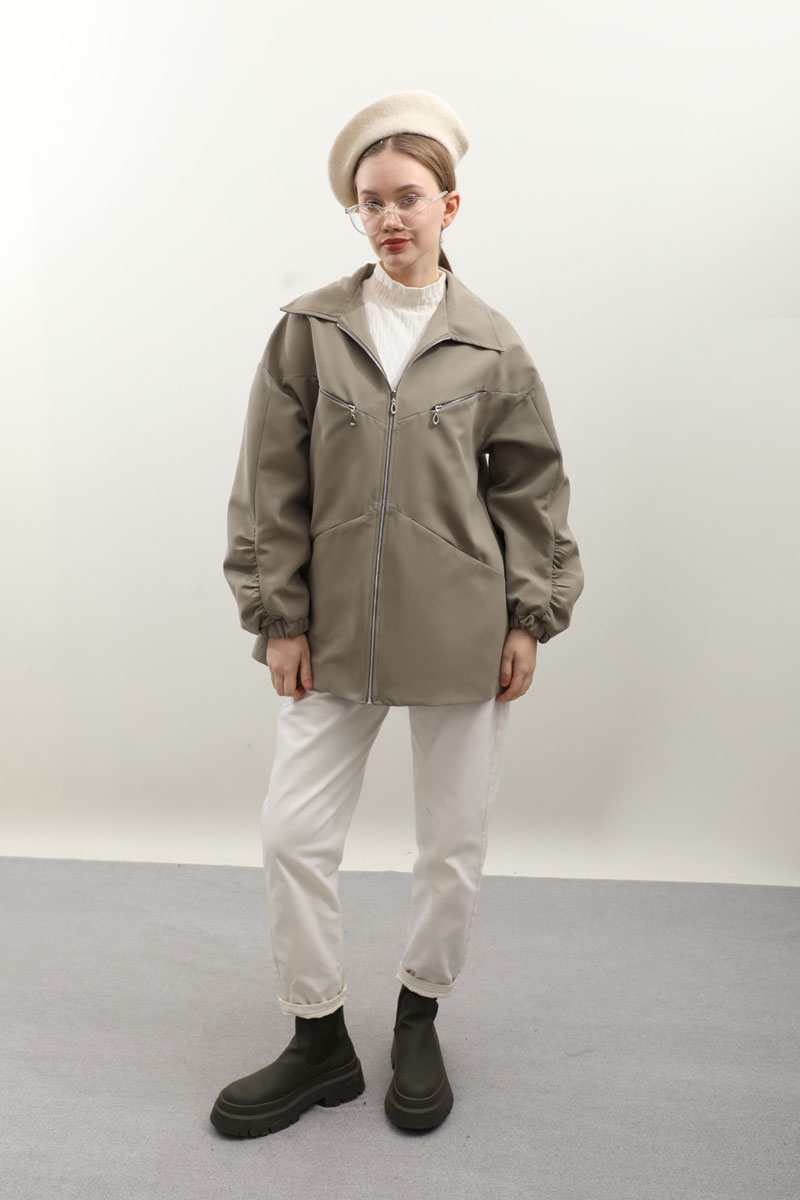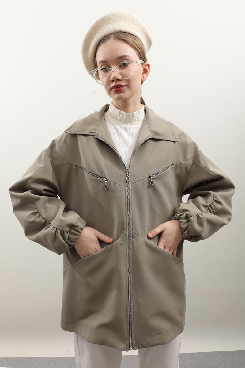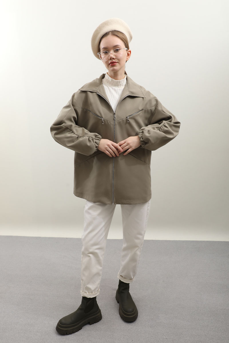 Kolu Büzgülü Kısa Trenç Açık Yeşil. Gömlek yaka, önden fermuarlı, üst cepleri fermuarlı alt cepleri gizli, kolları büzgü detaylı, manşetleri lastikli, astarlıdır. Günlük kullanımlarınızda tercih edebilirsiniz.