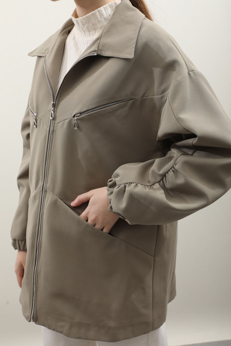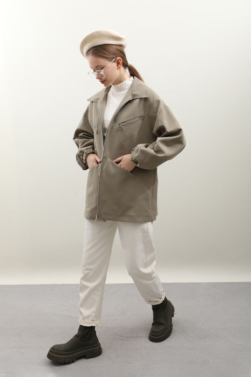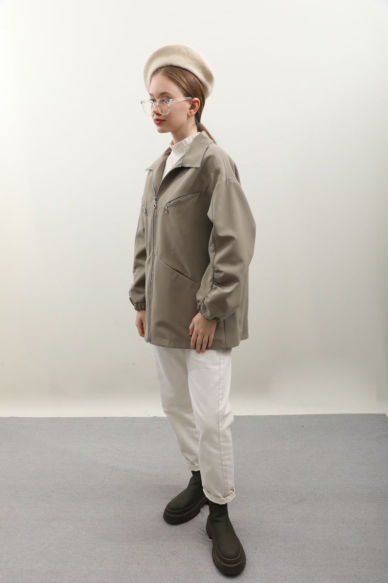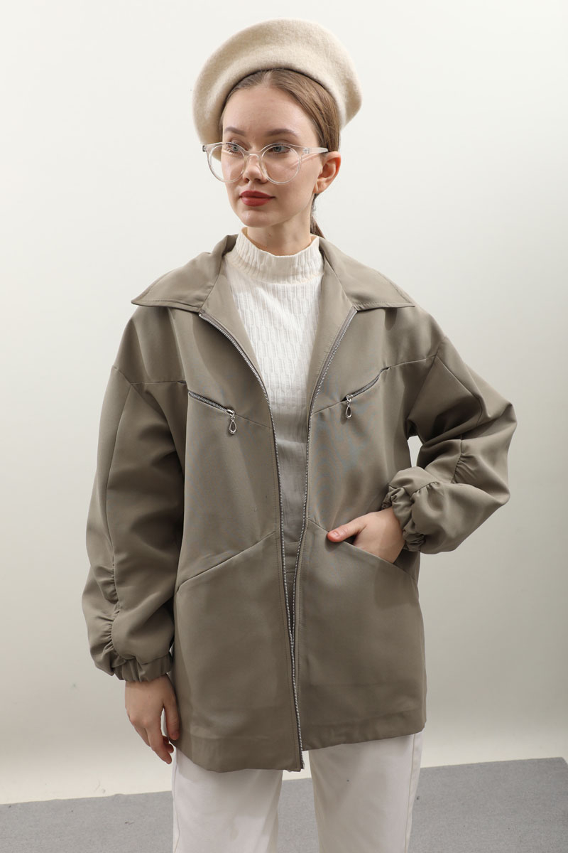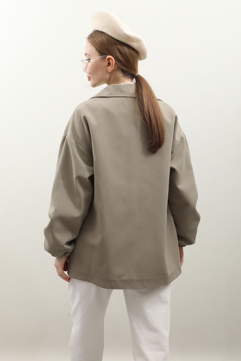 Kolu Büzgülü Kısa Trenç Açık Yeşil. Gömlek yaka, önden fermuarlı, üst cepleri fermuarlı alt cepleri gizli, kolları büzgü detaylı, manşetleri lastikli, astarlıdır. Günlük kullanımlarınızda tercih edebilirsiniz.