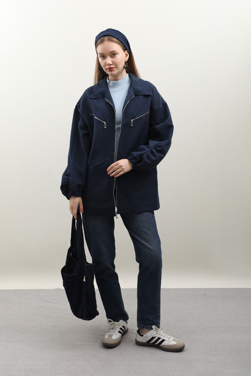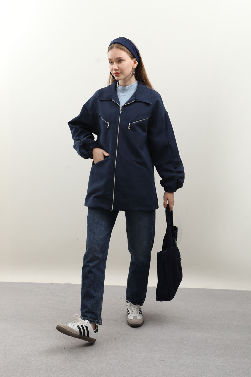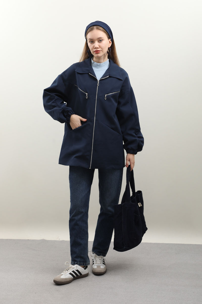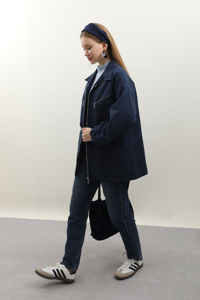Kolu Büzgülü Kısa Trenç Lacivert. Gömlek yaka, önden fermuarlı, üst cepleri fermuarlı alt cepleri gizli, kolları büzgü detaylı, manşetleri lastikli, astarlıdır. Günlük kullanımlarınızda tercih edebilirsiniz.