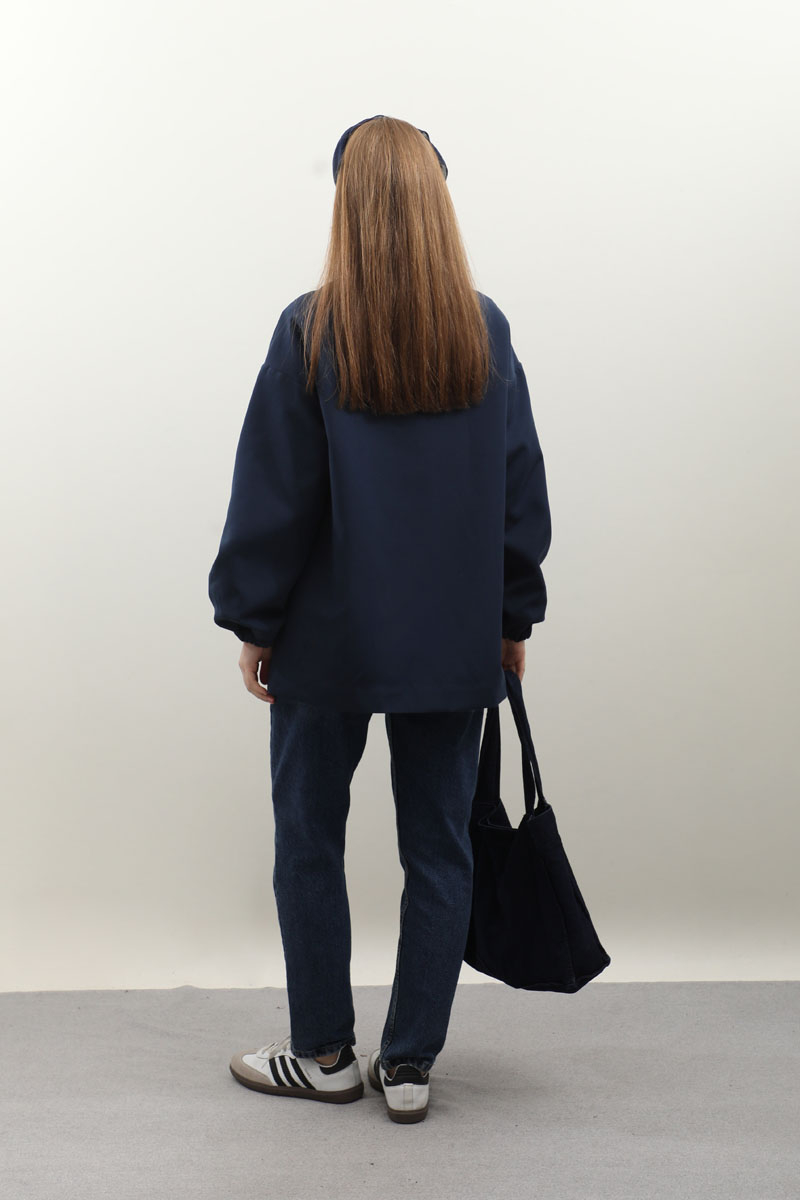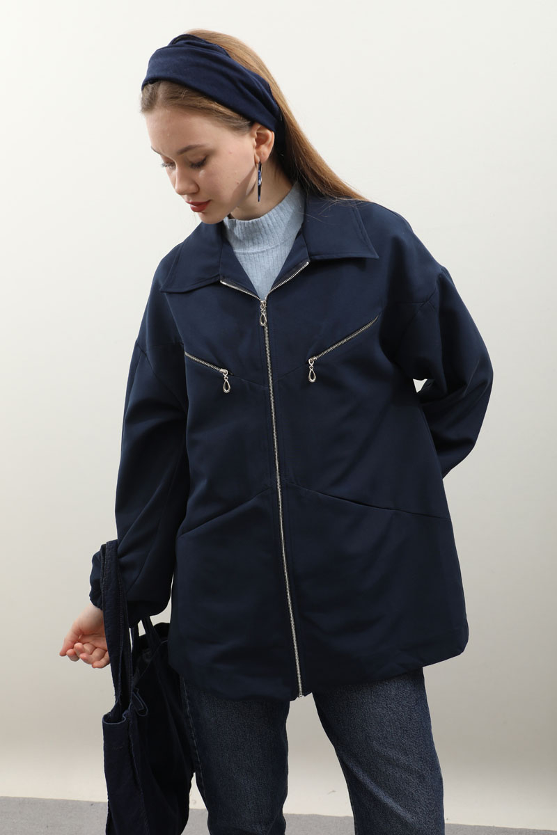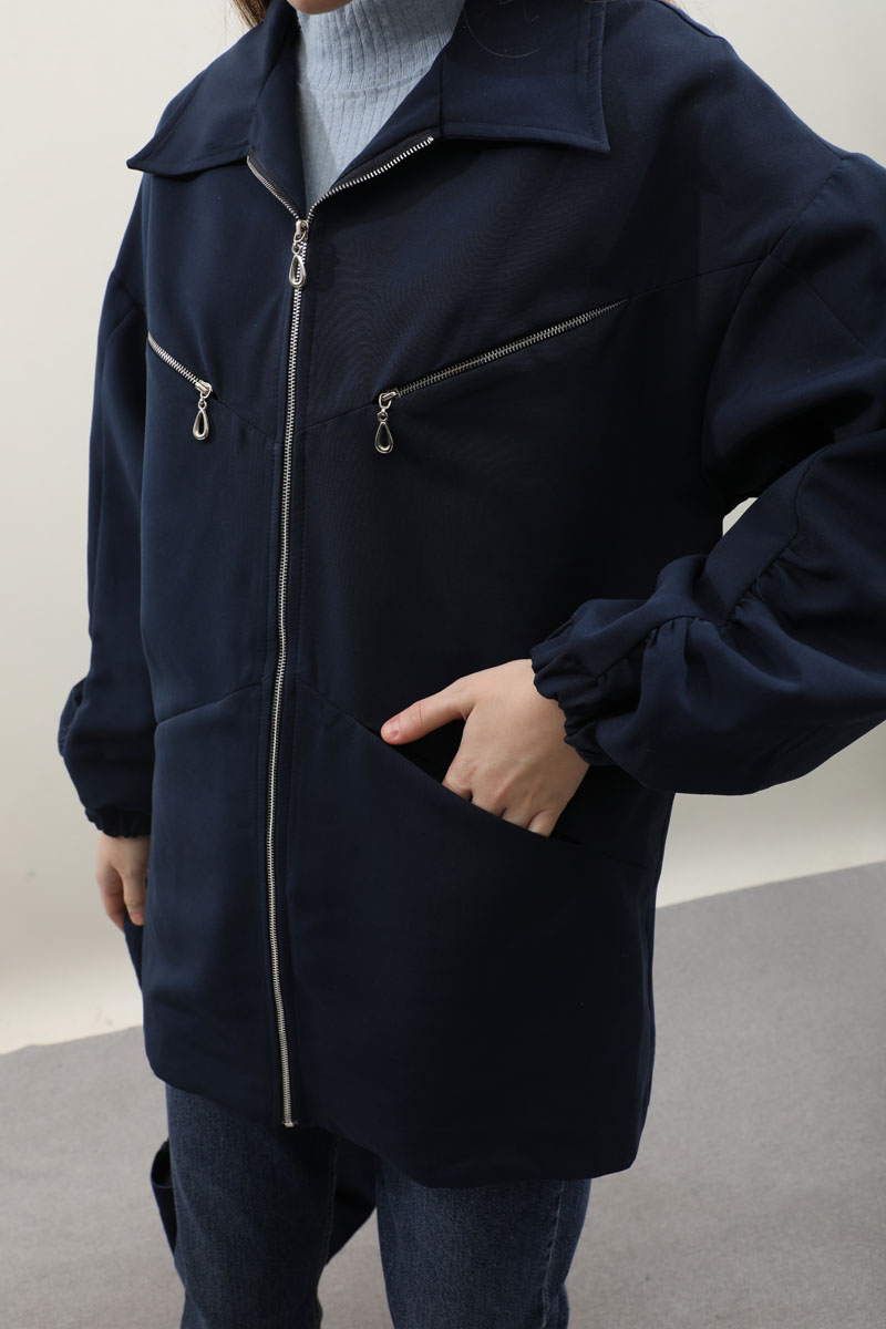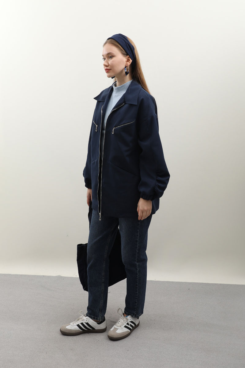 Kolu Büzgülü Kısa Trenç Lacivert. Gömlek yaka, önden fermuarlı, üst cepleri fermuarlı alt cepleri gizli, kolları büzgü detaylı, manşetleri lastikli, astarlıdır. Günlük kullanımlarınızda tercih edebilirsiniz.