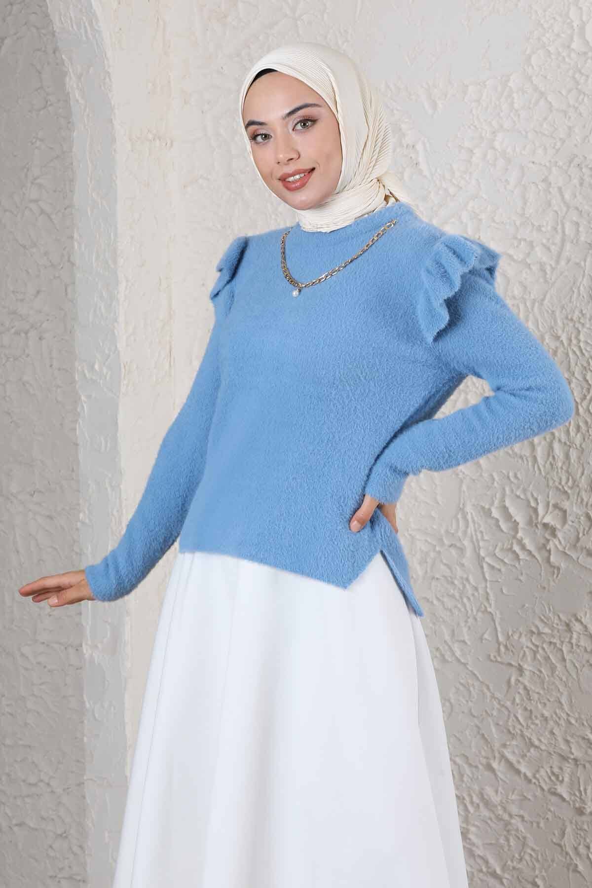 Kolyeli Kısa Kazak Bebe Mavi. Örmeli kısa tüylü trikodur. Yumuşak dokuludr batma yapmaz. Omuzlarında dökümlü fırfır detayları vardır. Kendinden kolyelidir. Bisiklet yaka. Eteklerle ve bol pantolonlar ile kombinlenebilir. Dilerseniz üstüne gömlek alarak da kombinleyebilirsiniz.