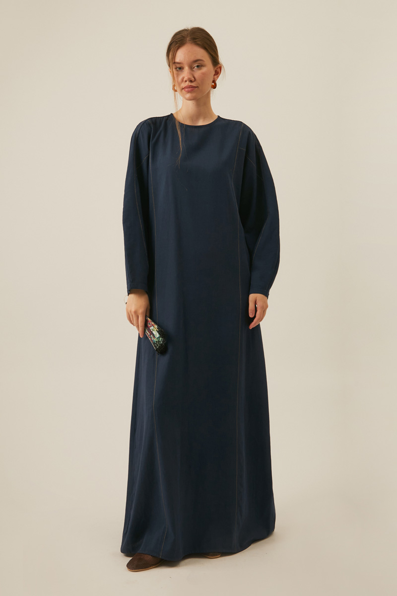 Kontrast Dikişli Keten Elbise Lacivert, Minimalist tasarımı, doğal dokusu ve dikkat çekici kontrast dikiş detaylarıyla gardırobunuzun en özel parçalarından biri olmaya aday. Rahat kesimi ve hareket özgürlüğü sunan balon kol yapısıyla gün boyu konfor sağlarken, belindeki kuşak detayıyla şık ve modern bir siluet çizer. Doğal keten kumaşının ferahlığı ile her mevsim giyilebilir.