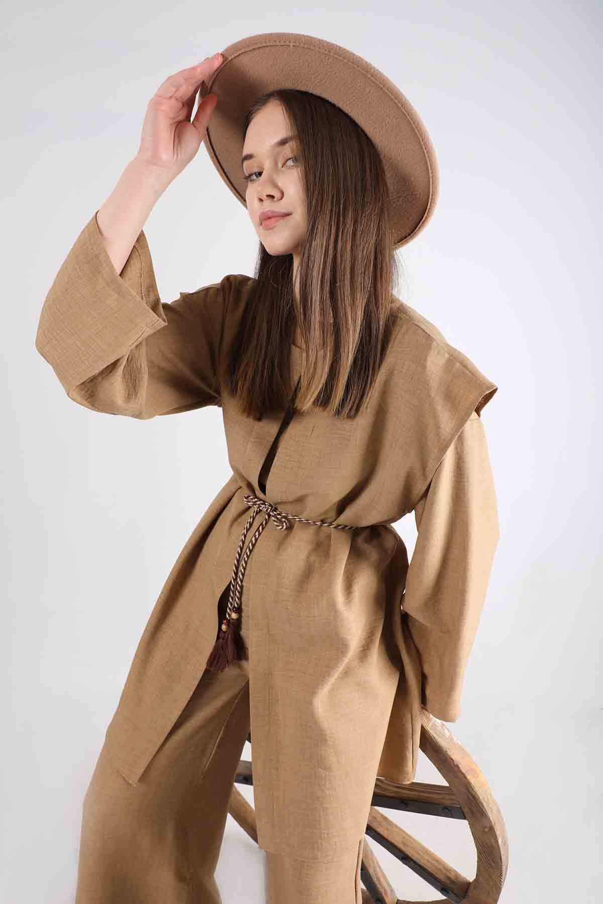 Kordonlu Bol Paça Yelek Takım Camel. Püskül detaylı kordonludur. yeleklidir. Pantolon beli lastiklidir ve bol paçadır. Normal kalıptır. Üçlü takım olarak satılmaktadır. Sezonun trend renkleri kullanılarak tasarlanan ürünümüz yeni sezonun favori ürünlerindendir.