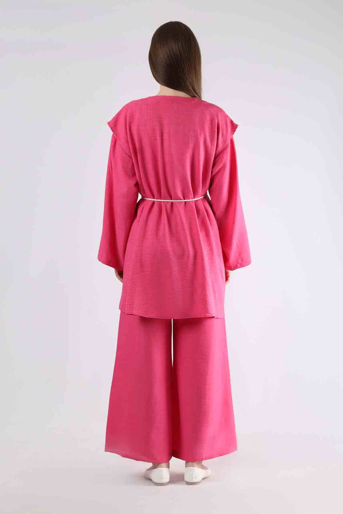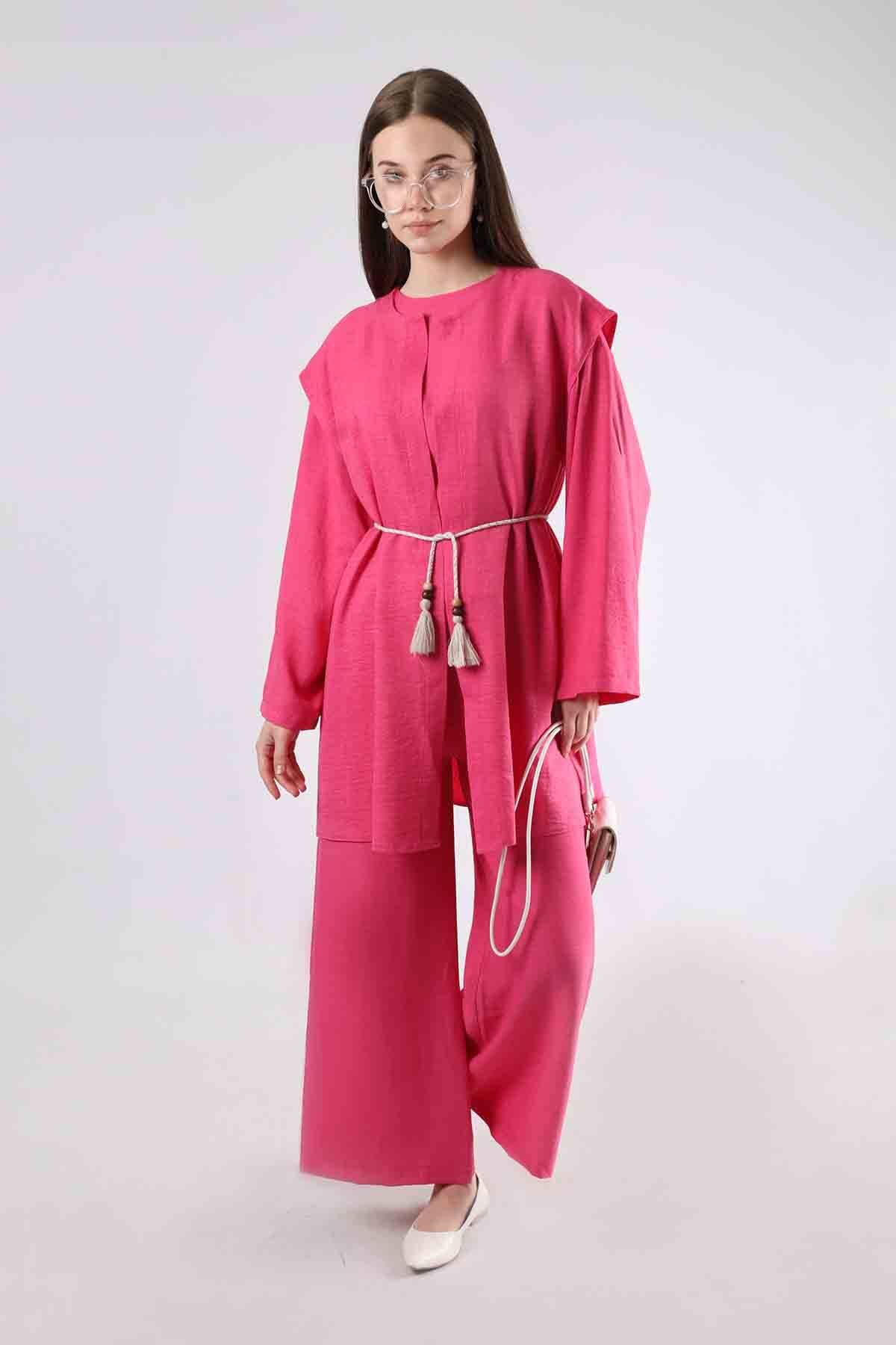 Kordonlu Bol Paça Yelek Takım Fuşya. Püskül detaylı kordonludur. yeleklidir. Pantolon beli lastiklidir ve bol paçadır. Normal kalıptır. Üçlü takım olarak satılmaktadır. Sezonun trend renkleri kullanılarak tasarlanan ürünümüz yeni sezonun favori ürünlerindendir.
